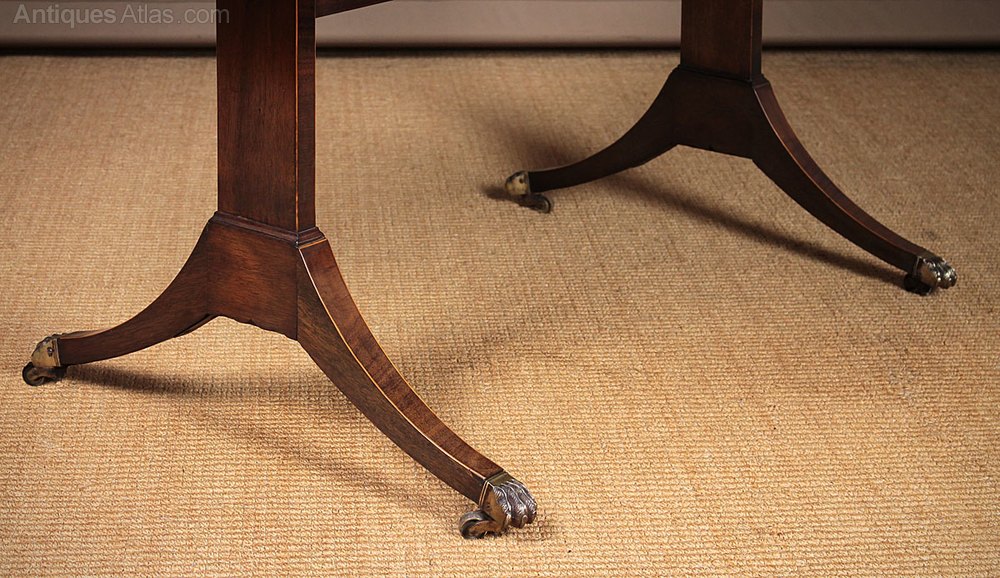 Fine quality early 20th.c. Sheraton style mahogany sofa table c.1930. Solid mahogany top with the folding ends typical of the form, with an inlaid and crossbanded border and edge. Two oak lined drawers with flame mahogany fronts, also inlaid and crossbanded, with brass handles. Matching dummy drawer fronts to the rear. Raised on square column supports and swept legs raised on brass claw feet and castors. Joined with a high stretcher so the table could used as a writing desk. Maker’s label to the underside for Gillards of Altrincham. Excellent colour and condition, cleaned and polished in our workshops.