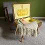 This mid century, 1960s foot stool is in great original condition. The stool has teak dansette legs with adjustable brass feet, and the original fabric is a rich dark gold with contrasting brown on the sides. There is a lid with a brass chain. The interior is lined with primrose yellow vinyl, and has a handy pocket, a channel which is perfect for sewing threads, and a generous space for fabrics. Of course you could equally use the storage for books and magazines, or anything else! (please note the contents shown in the photo are for illustration only and not included in the sale price).