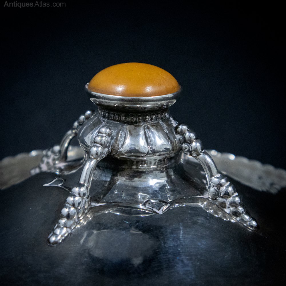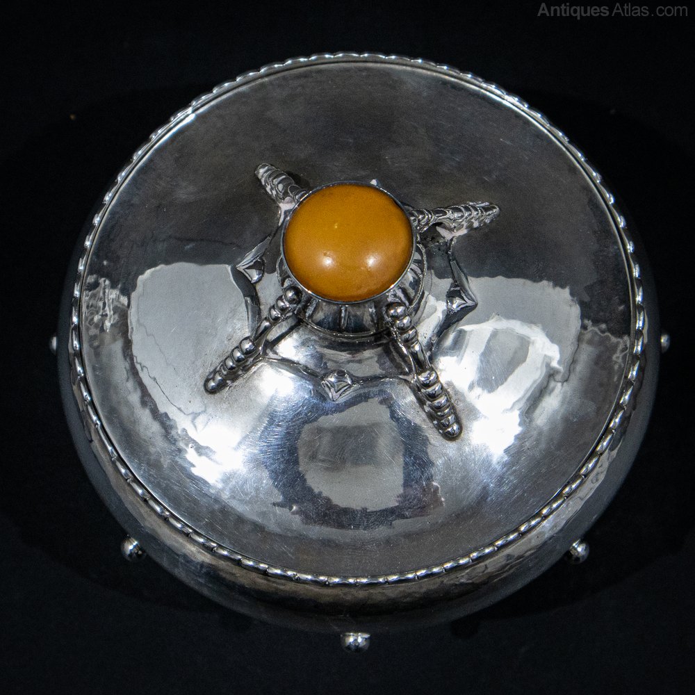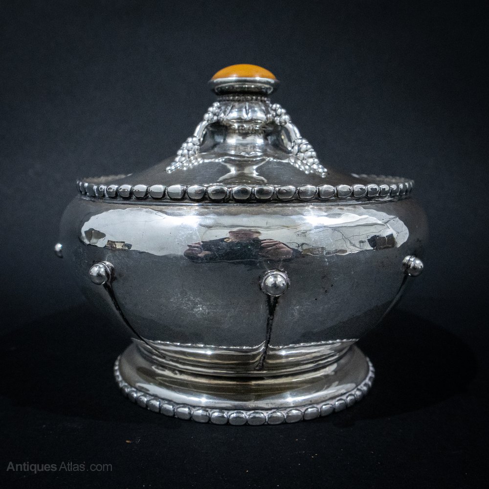 Silver Danish Arts & Crafts Bowl & Cover. A fabulous piece of silver from the renowned Danish silversmith Christian F Heise. The bowl has some wonderful features. The body is circular with a hand hammered finish with beaded panels to the sides, a skirt foot and a pull off cover with an amber knop. The Danske Arbedje Danish Trade Association marks can be found to the base. A stunning piece. Weight 335 grams. The piece is in good condition with only age related signs of wear. 1910, Silver, Danish.