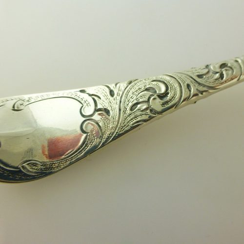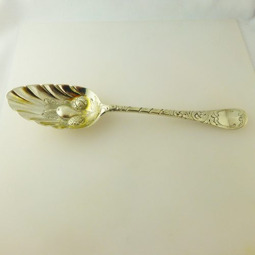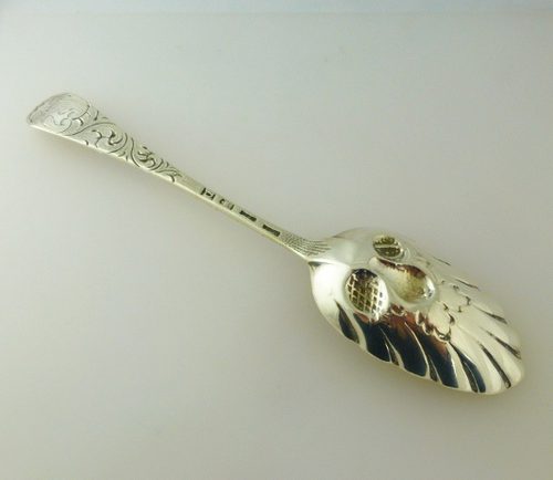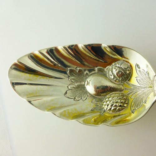 A beautiful antique silver spoon with hallmarks for London 1759. The spoon displays nice detail chased fruit detail and scroll design.