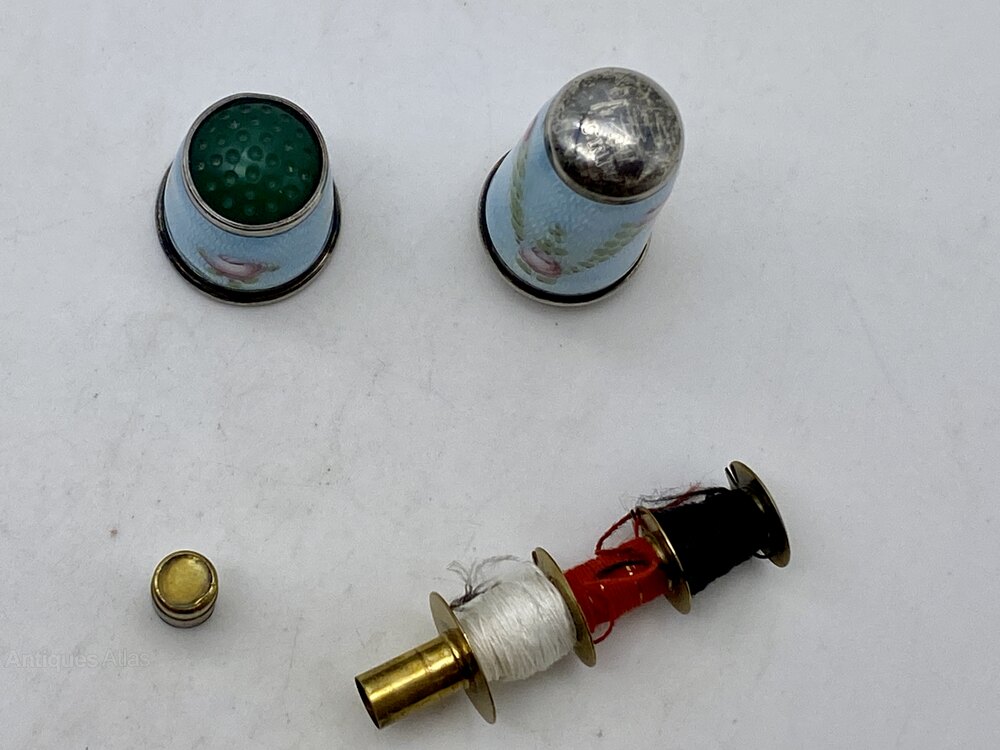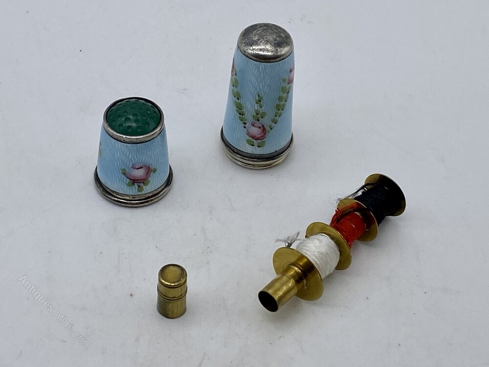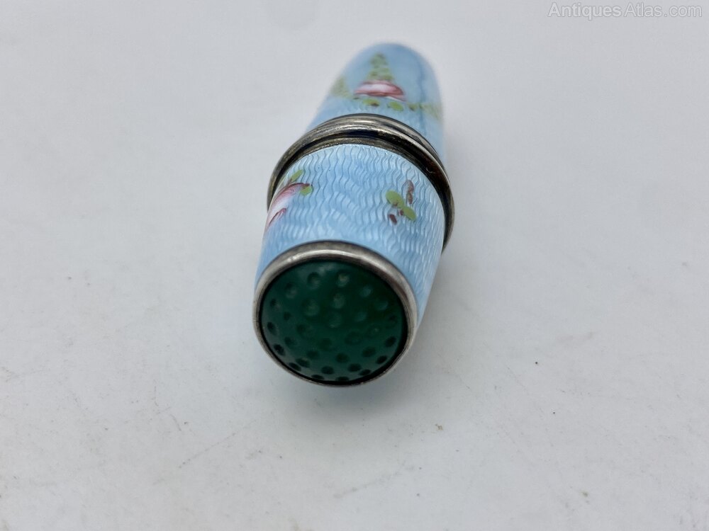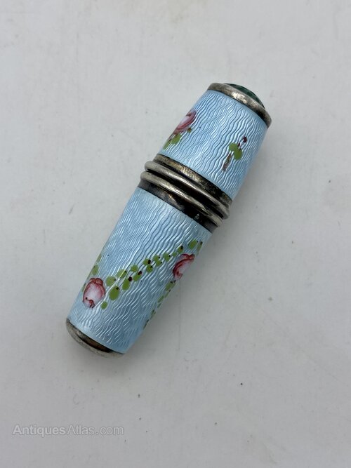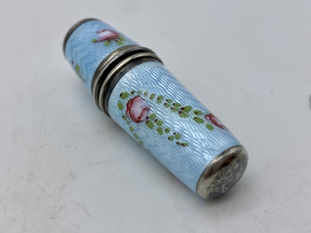 A love Sterling Silver Powder Blue Guilloche Enamel Etui with Thimble,opening to reveal Reels for Cottons and a tube for Needles.The lovely enamel is decorated with Swags linked by Pink Rosebuds.It screws together securely.French.c.1900