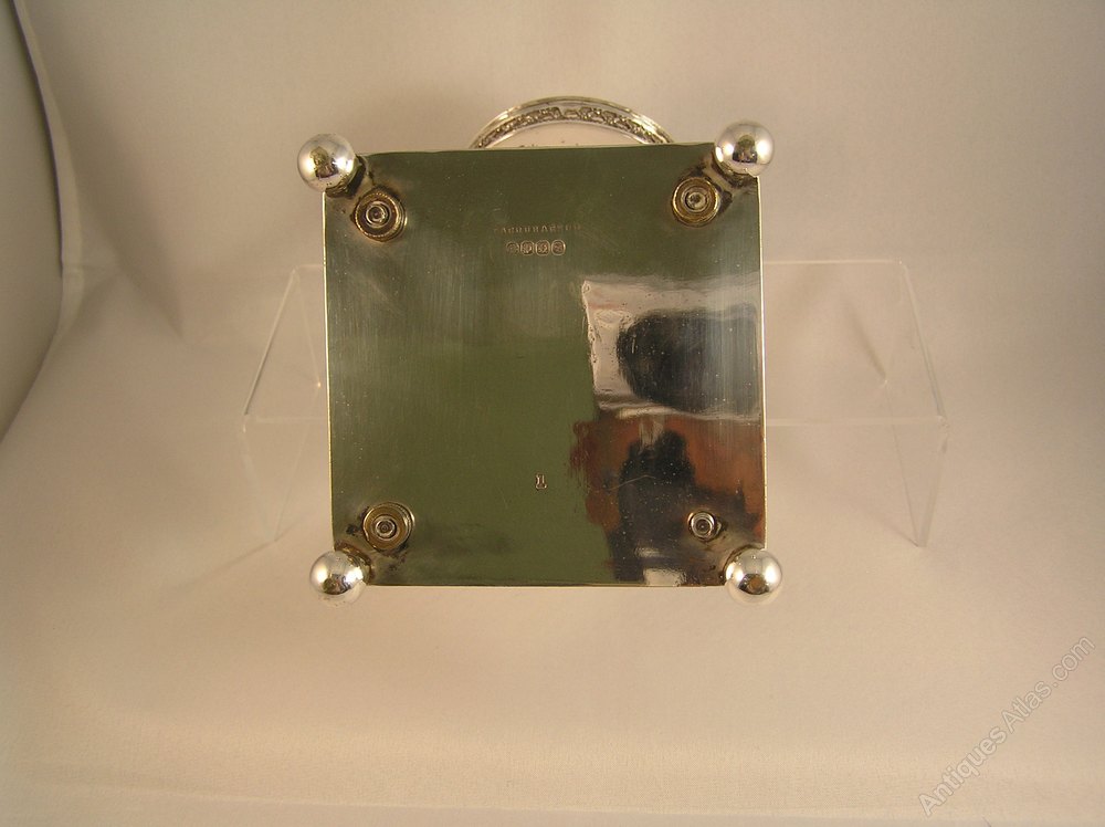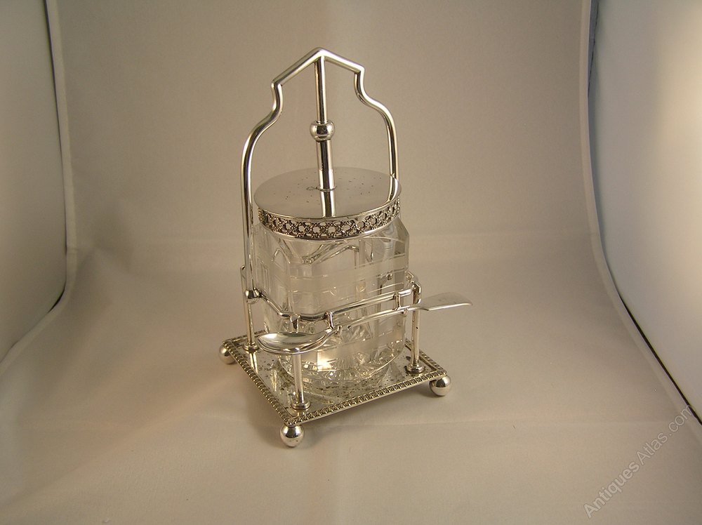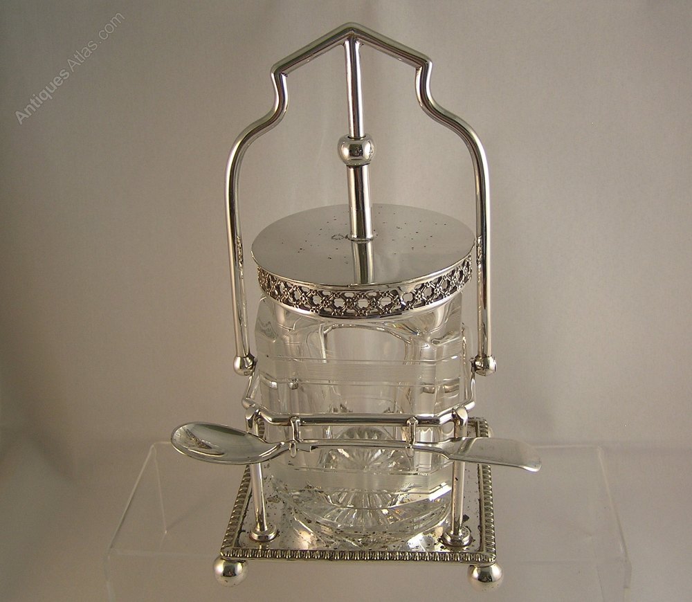 This attractive and functional item comprises a silver-plated stand with central cut glass jar and rising lid together with a preserve spoon, which lies across a rest. The base shows a makers mark for James Farquharson of Sheffield. The spoon is by Barker Brothers of Birmingham (1885-1907). The piece is 19cm high with a width of 9.5cm. There is some evidence of wear to the base beneath the jar. Overall the condition is very good.