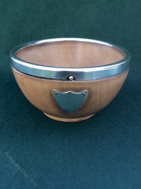 C1927 a pretty tactile George V silver rimmed sycamore bowl. Vacant silver shield cartouche. Hall marks for London 1927. Makers markF&C ltd who me I am not familiar with. H 7cm, Diameter 12.5cm