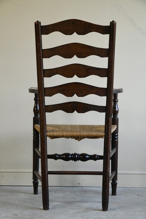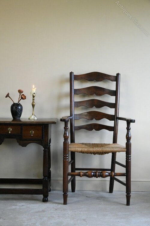 Single Antique Oak Ladderback Chair. 19th Century oak ladderback chair with open arms and woven seagrass seat.