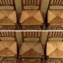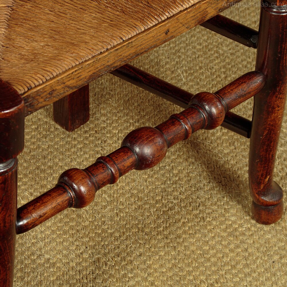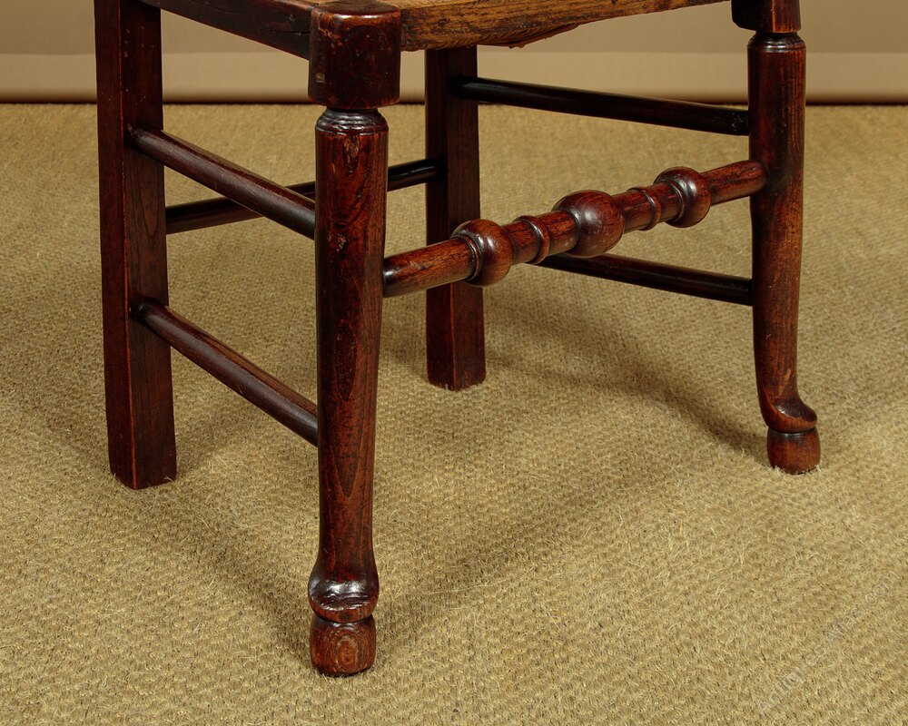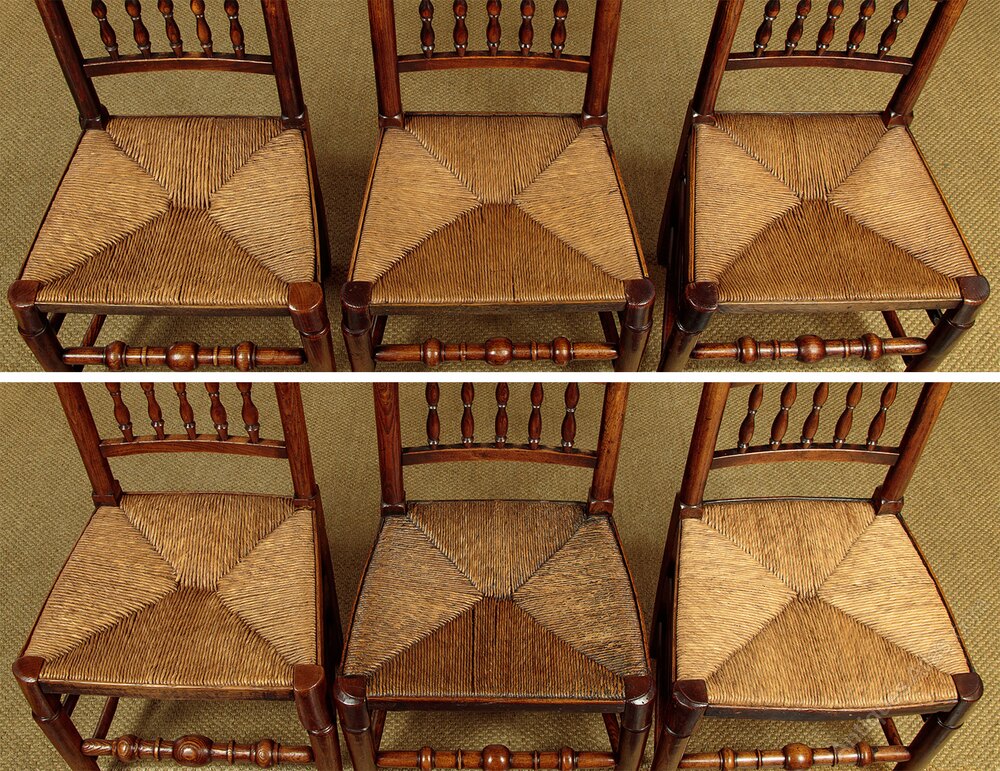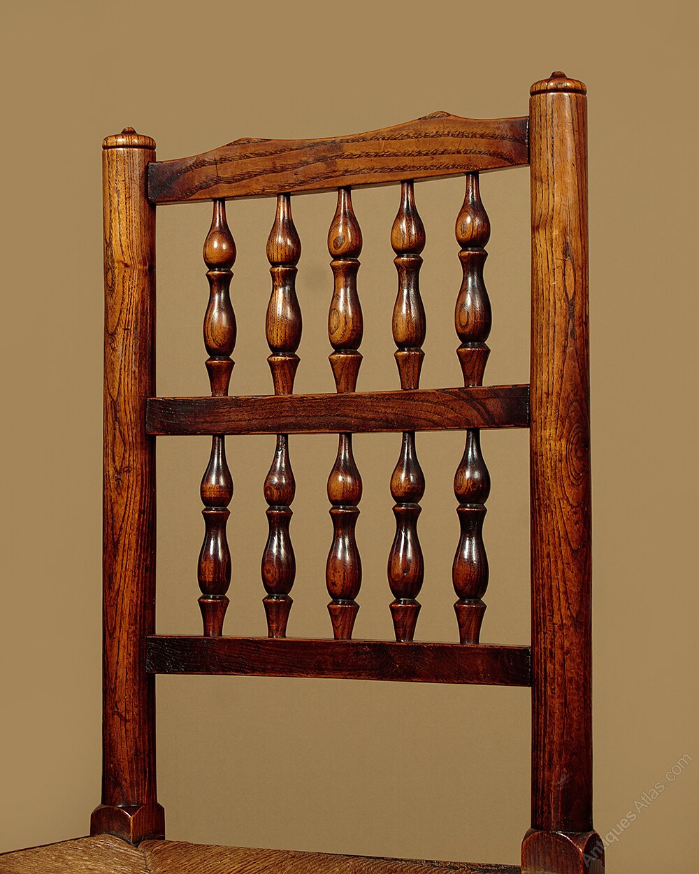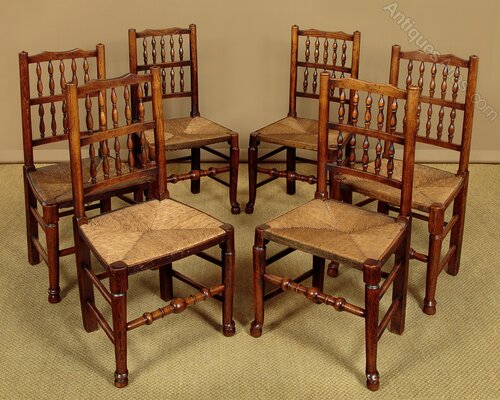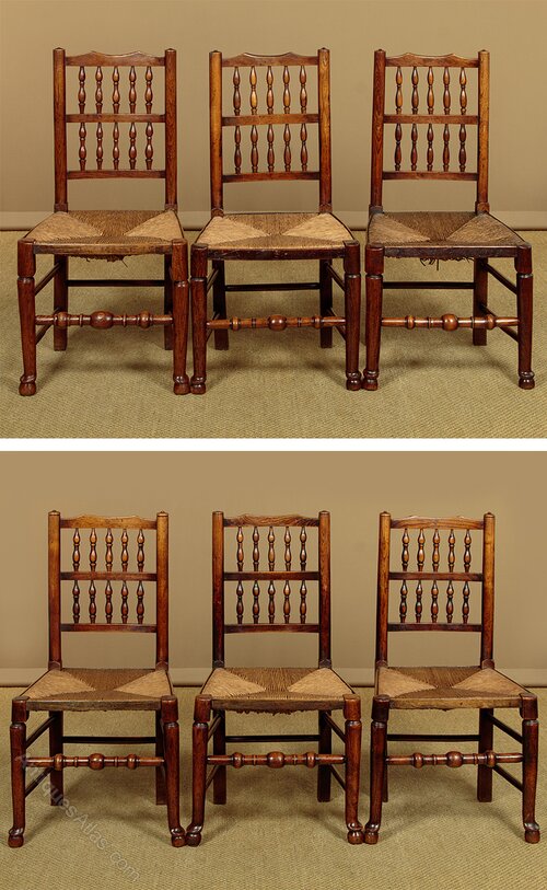 Six late Georgian period Lancashire spindle back dining chairs c.1810. Some very slight differences in design but all in ash with a shaped top rail over two rows of five turned spindles, between turned rear stiles with nipple tops. Woven rush seats (height 17") raised on turned front legs with raised pad feet and joined with a particularly attractive turned front stretcher, plus simple spindle stretchers to the sides and rear for extra strength. Missing a piece of rush on one of the seats, otherwise very condition with particularly good colour and patina to the timber. Cleaned and waxed in our workshops.