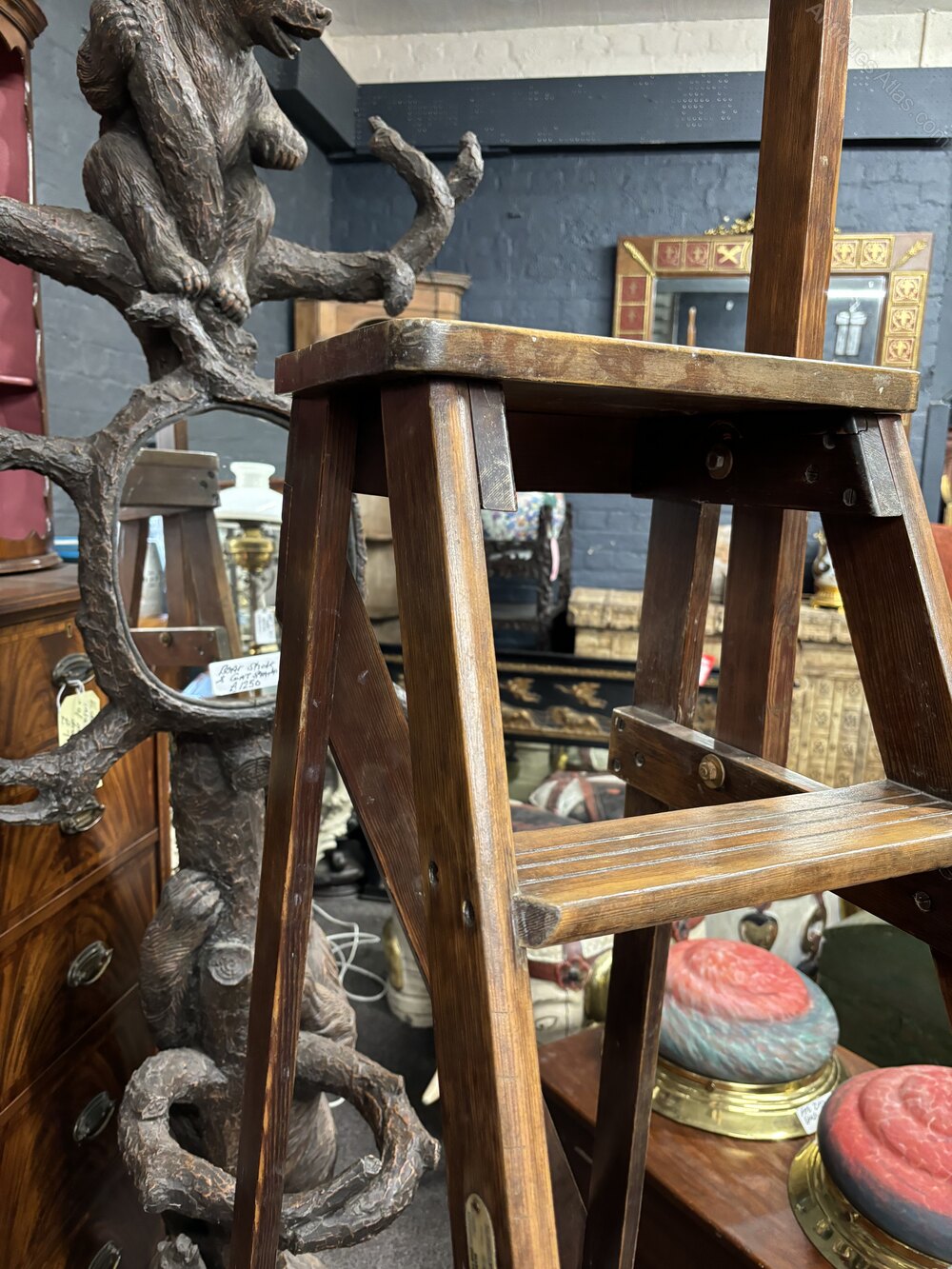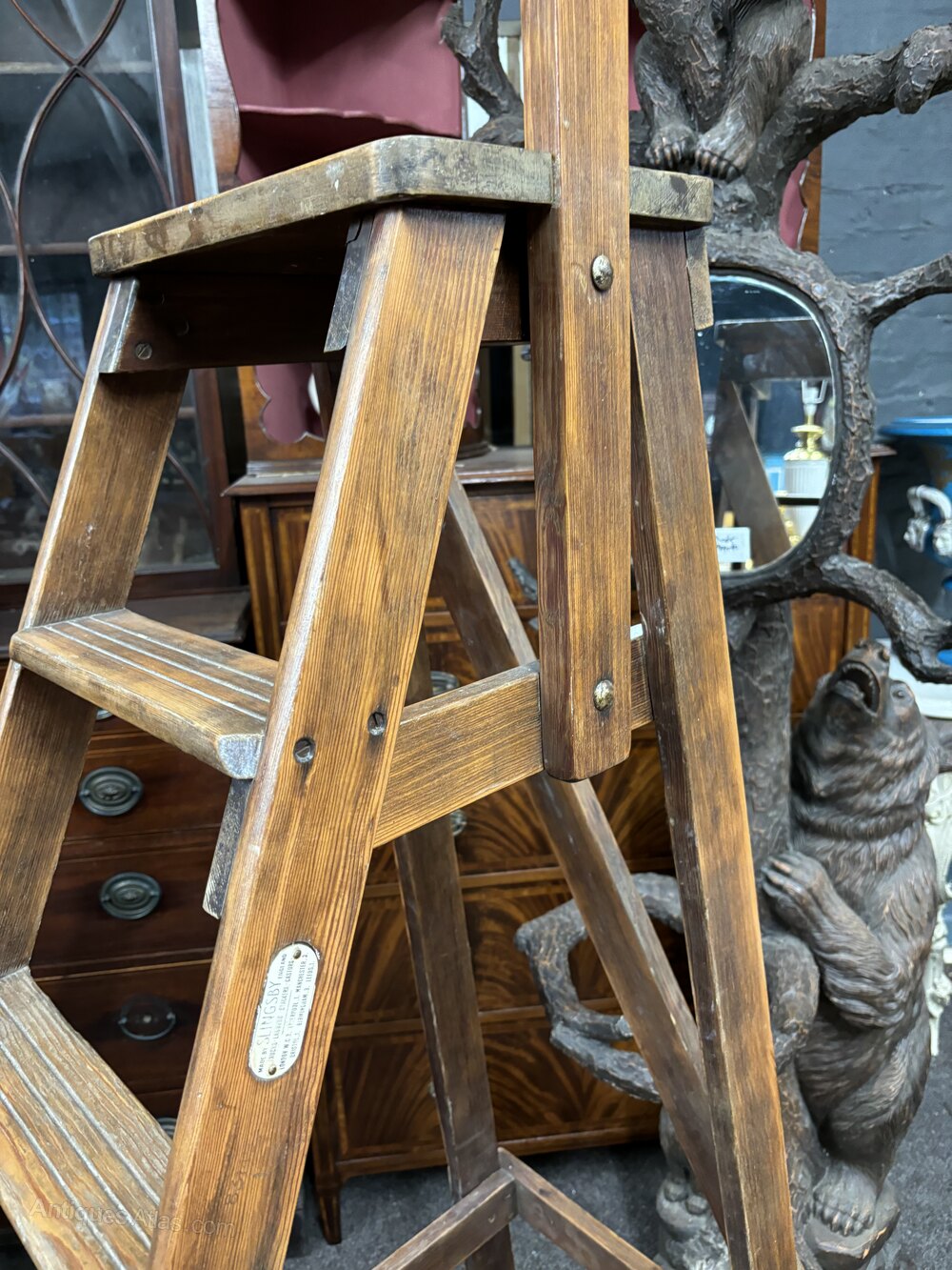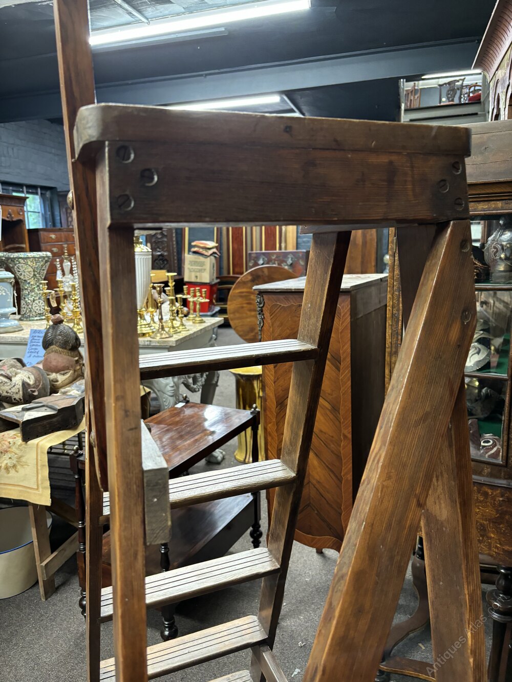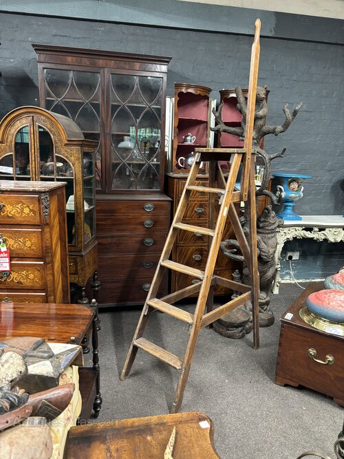 Rarely available, Slingsby library ladders are well known pieces of furniture, combining utility and elegance. These ladders feature wooden steps with a stabilising hand bar and are crafted with quality materials. Originating from England in the early 20th century, they are not only functional but also make for beautiful display pieces. They feature dimensions like a top step height of approx 91 cms with an overall height reaching approx 170 cms.
