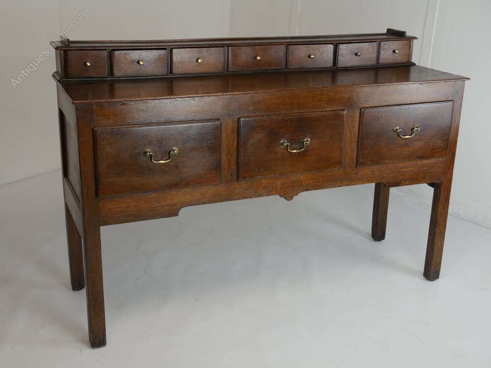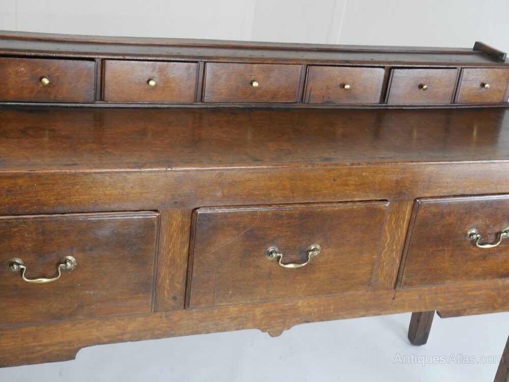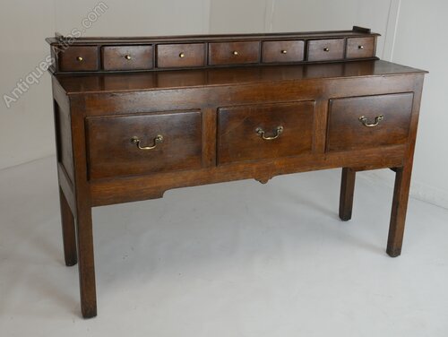 A lovely late 18th century oak dresser of neat proportions. The dresser has a row of seven spice drawers, with a plate barrier above, three deep drawers to the base, all drawers free running.