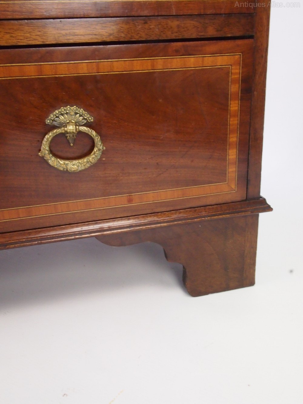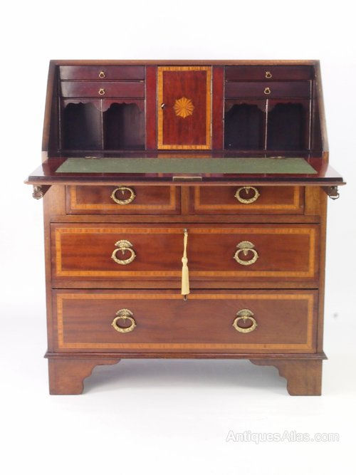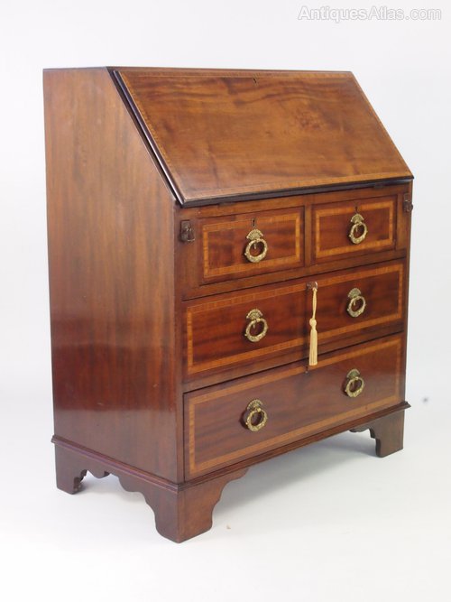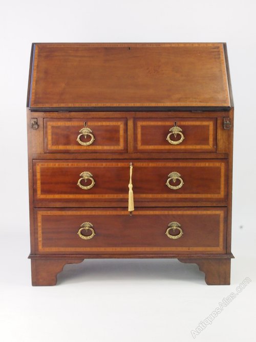 A small antique Edwardian mahogany and satinwood banded bureau. In Georgian revival style dating from circa 1910, it comprises a fall front over 2 small drawers and 2 long drawers. With heavy fancy brass oval drop handles and a fitted interior with deep pigeon holes, drawers and an internal cupboard which locks and comes with a key with inlay decoration to the door. It stands on bracket feet. A really high quality piece it has lovely figured mahogany with satinwood detailing and is of a nice small, useful size.