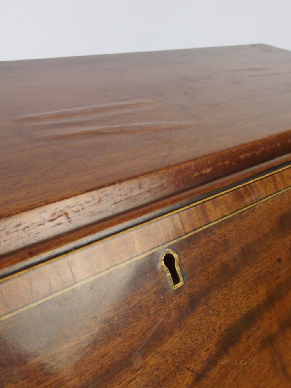 Good condition. Marks, scuffs and wear commensurate with age. Internal cupboard locks but other key does not lock drawers – for decoration only. Slight marks and some bubbling to the veneer on the top (see photo).