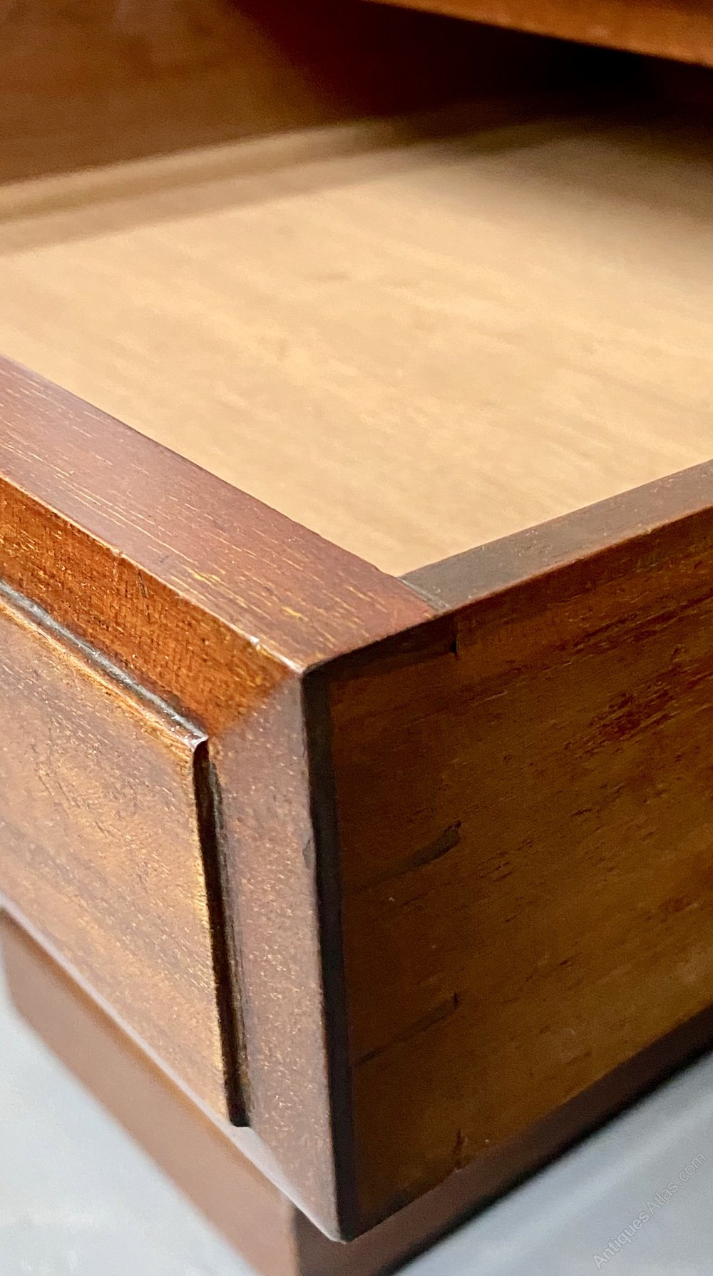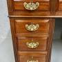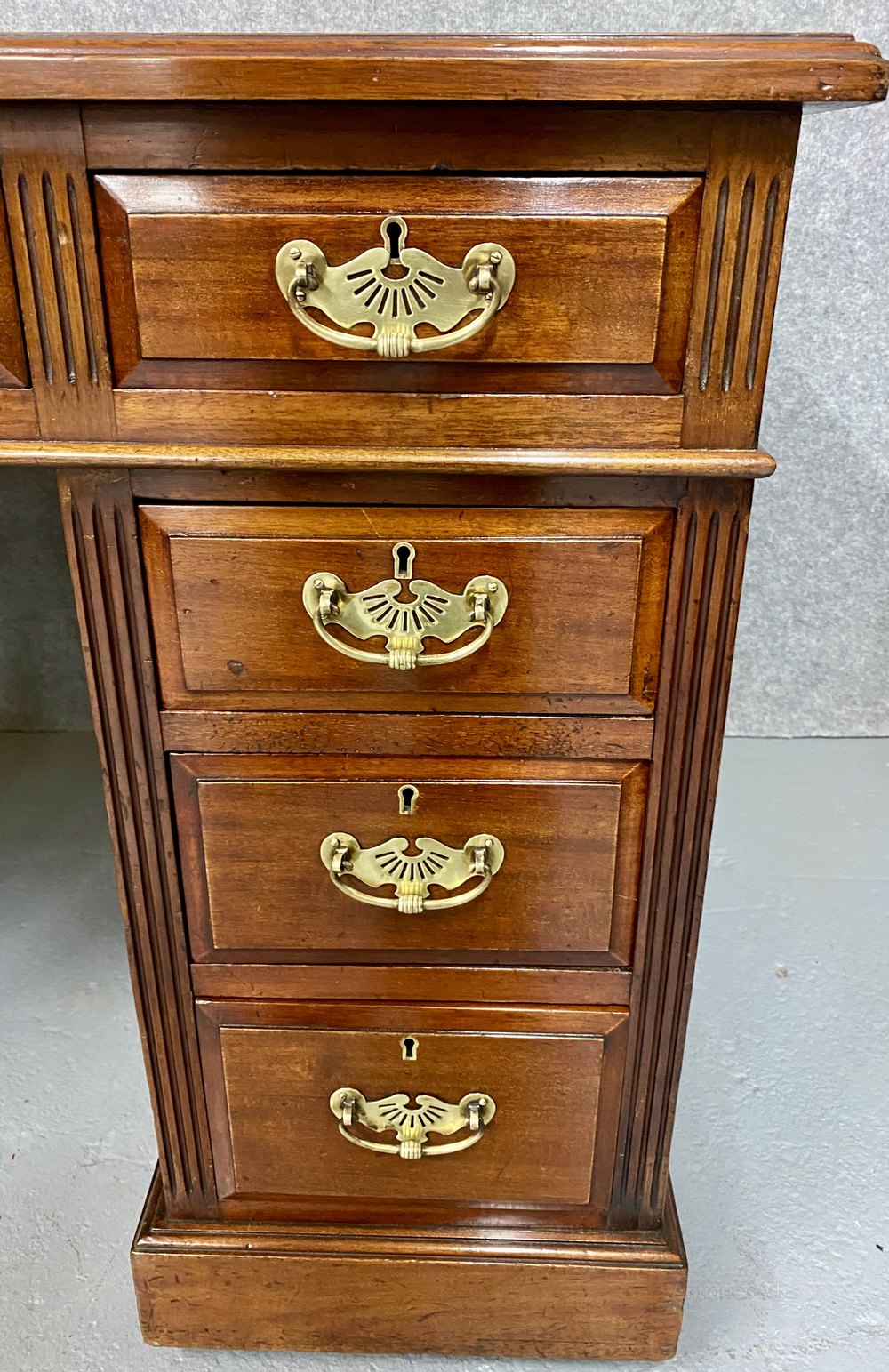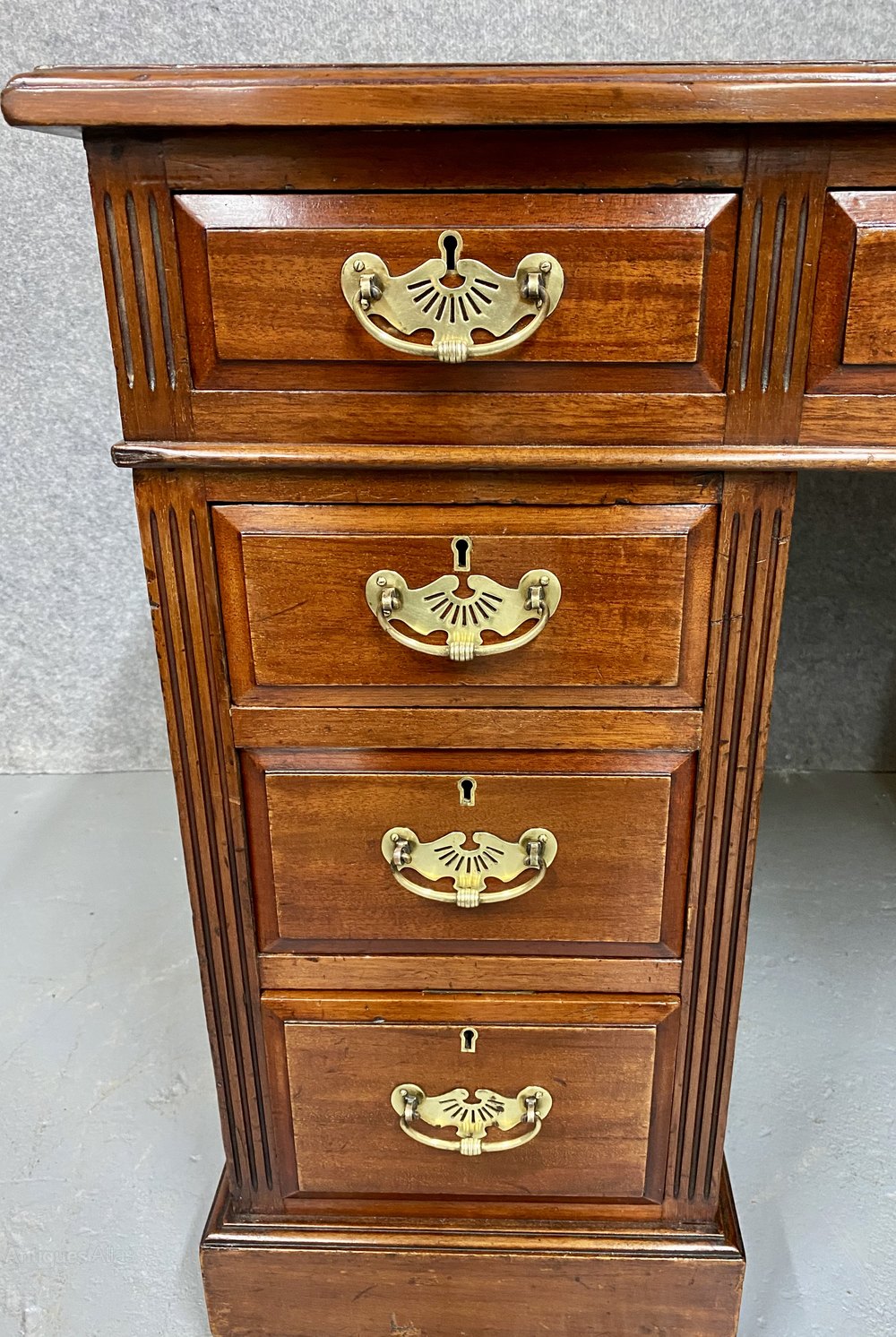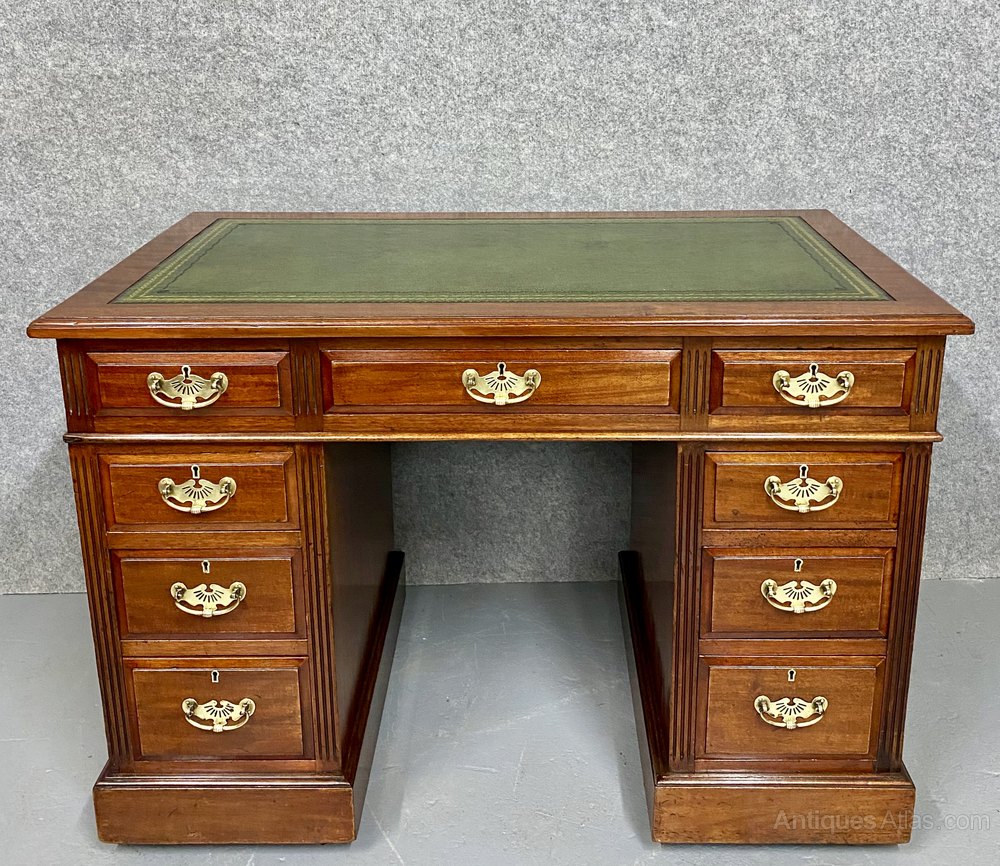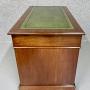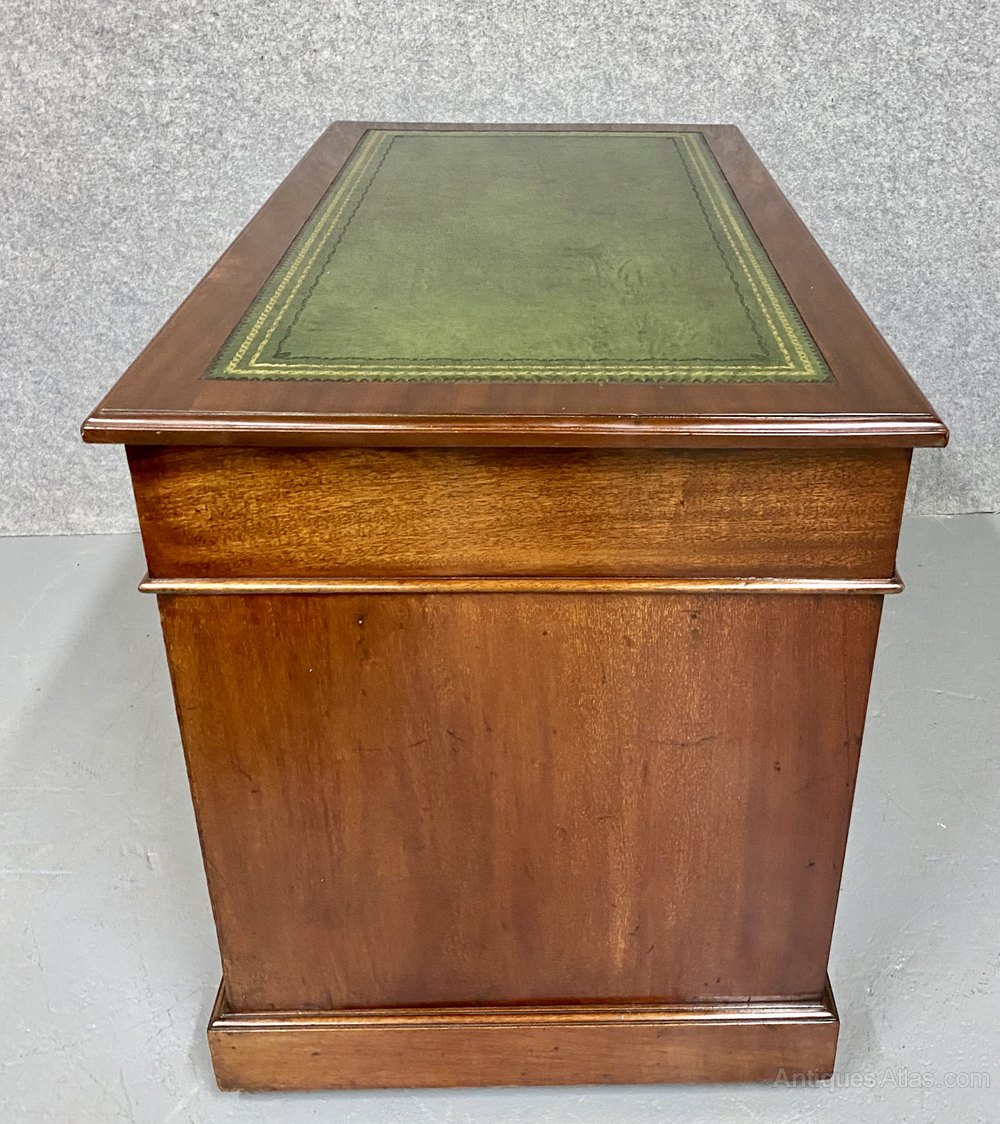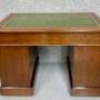 A good late Victorian mahogany freestanding 3 part pedestal desk. The top having a replaced hand dyed green leather writing surface with blind and gold tooling. The 9 graduated drawers having chamfered mahogany fronts and retaining the original polished brass handles and escutcheons. The pedestals raised on off set plinth bases with hidden casters. Condition- Very very good with mahogany linings and dovetailed joints throughout, fully re-polished in our own workshops. Dimensions:- Height…29.75’’/ 75.5cm. Width…42’’/ 107cm. Depth…24.25’’/ 62cm. Kneehole Height…23.75’’/ 60cm. Transports in 3 pieces. Delivery to most of U.K. mainland £55.