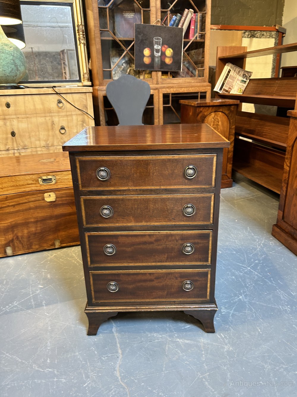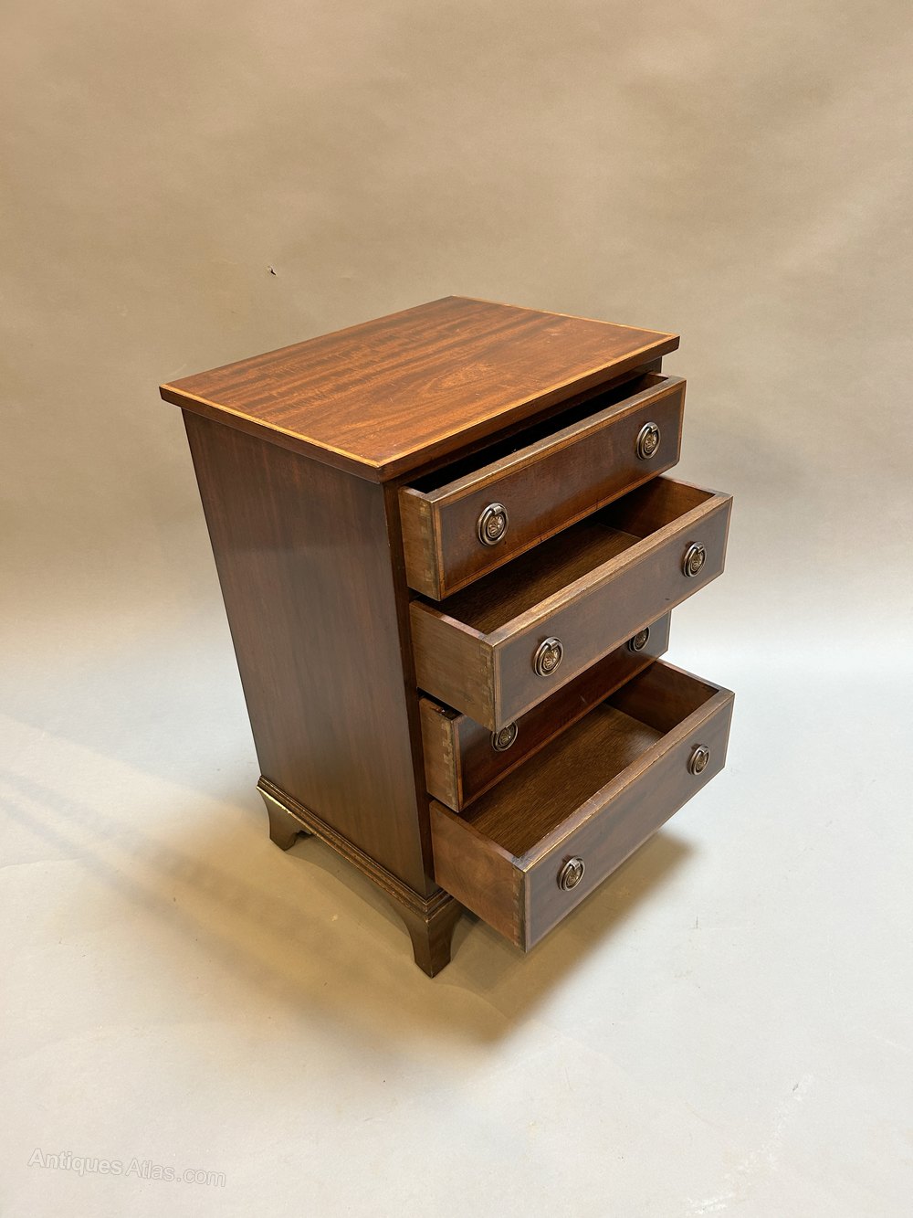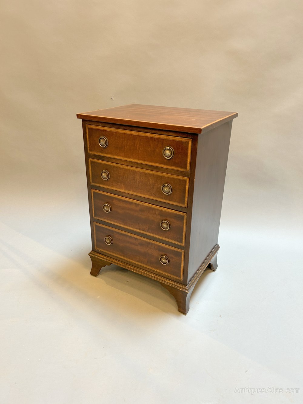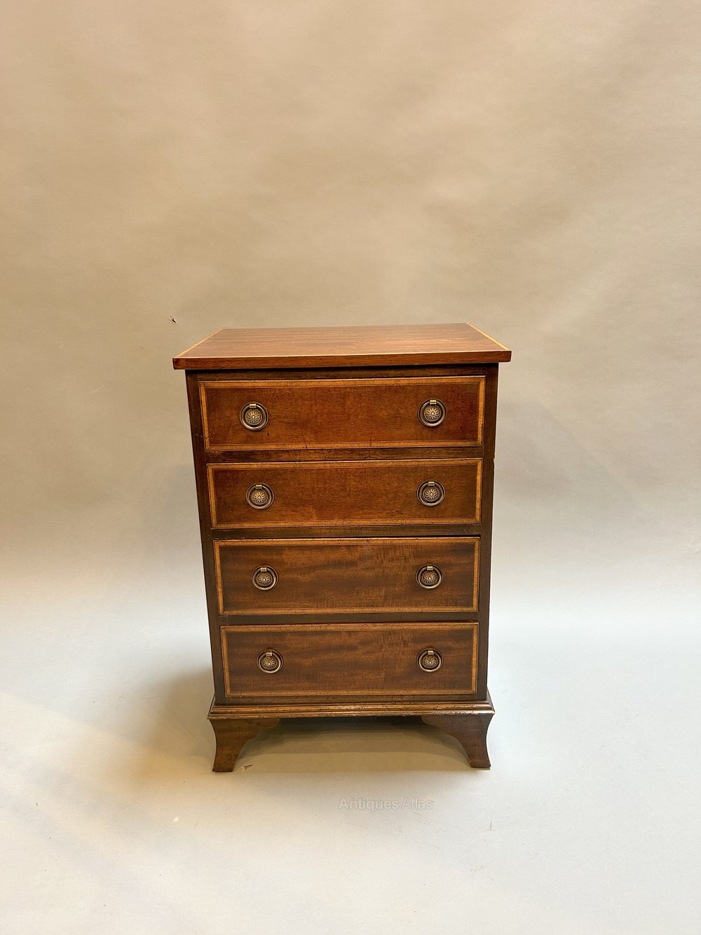 Early C20th mahogany of small proportions, the rectangular top over 4 drawers with gilt ring-pull handles and satinwood banding throughout raised on bracket feet.
