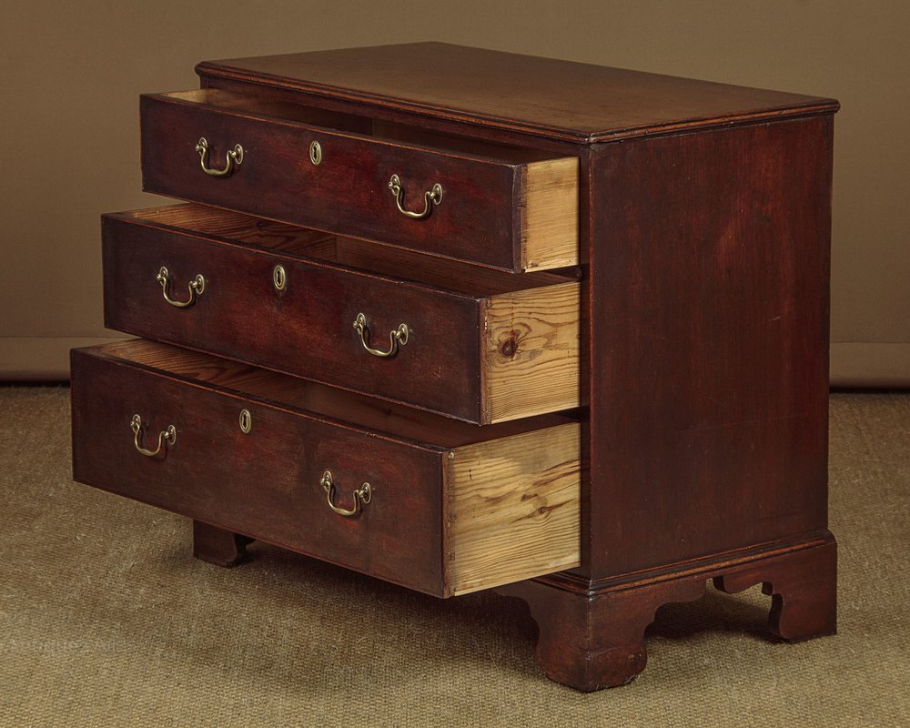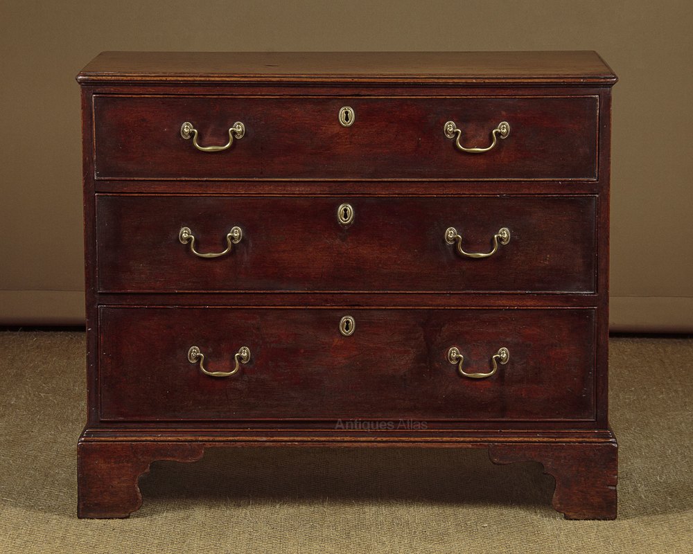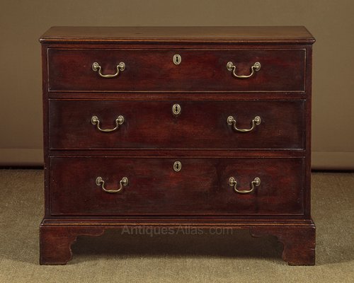 Charming little George III mahogany bachelor’s chest of drawers c.1800. Just 36″ wide. Single piece solid mahogany top with an applied moulded edge over three long drawers of graduated height. Cockbeaded drawer fronts with period brass swan neck handles. Solid mahogany sides, ogee moulded base trim and raised on shaped bracket feet front and rear. Very good colour and condition, cleaned and waxed in our workshops.