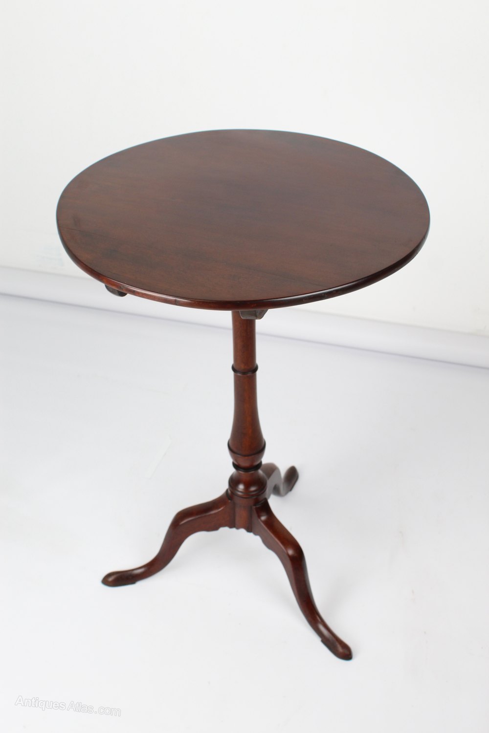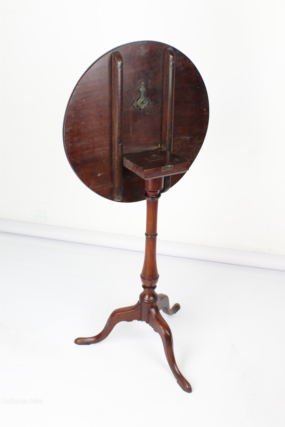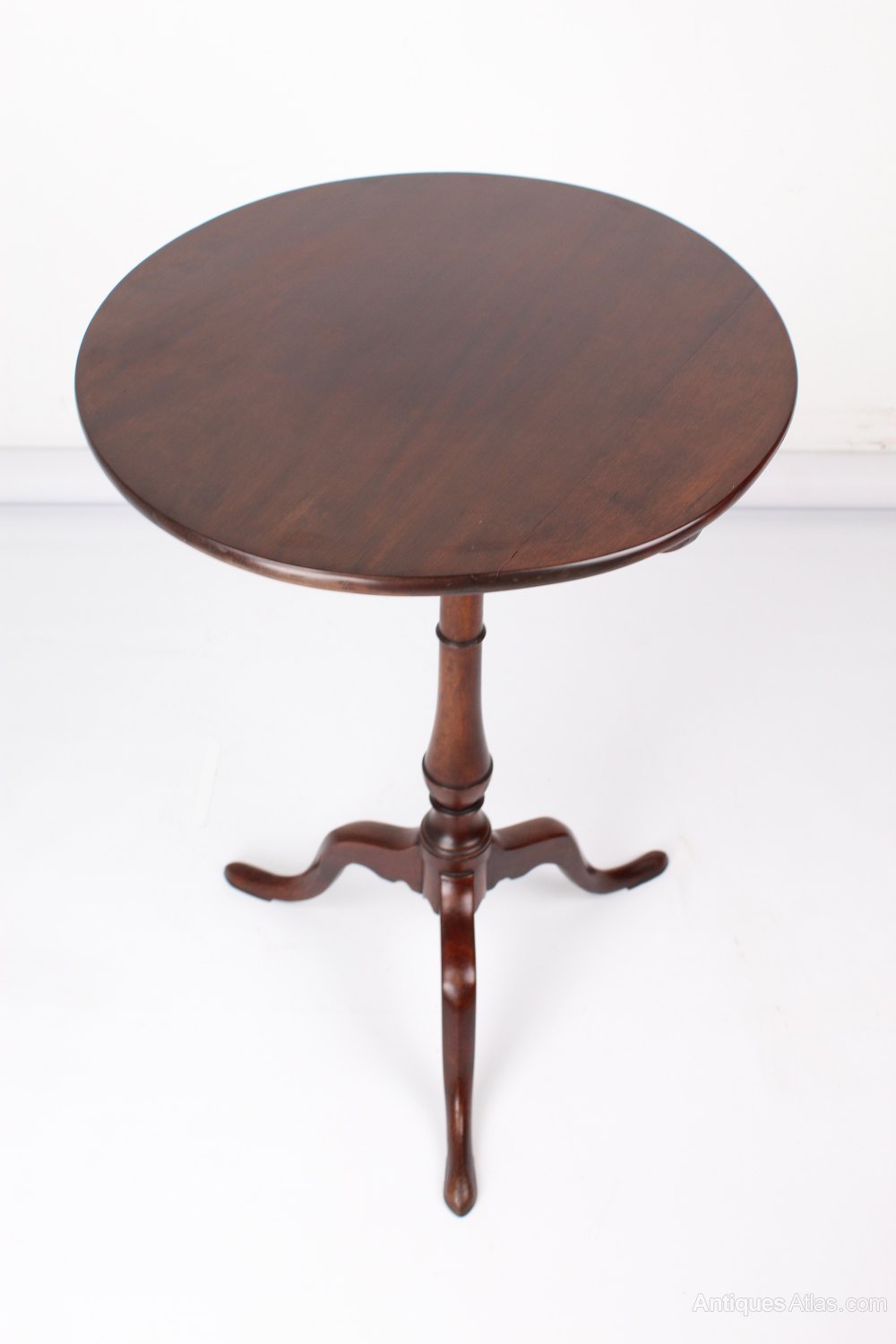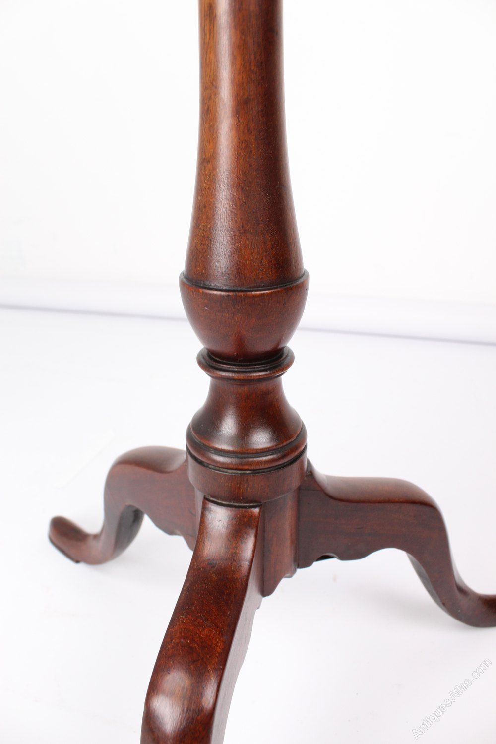 A good quality antique George III period mahogany tilt-top tripod wine table. With circular solid mahogany tilting top supported by a vase and ring turned tapering stem raised on cabriole legs and standing on elegant pad feet and iron strap below. The top can be tipped to vertical when not in use, locking into position with the original iron catch. A fine example of a classic George III mahogany tripod wine table in good condition.
