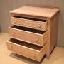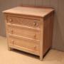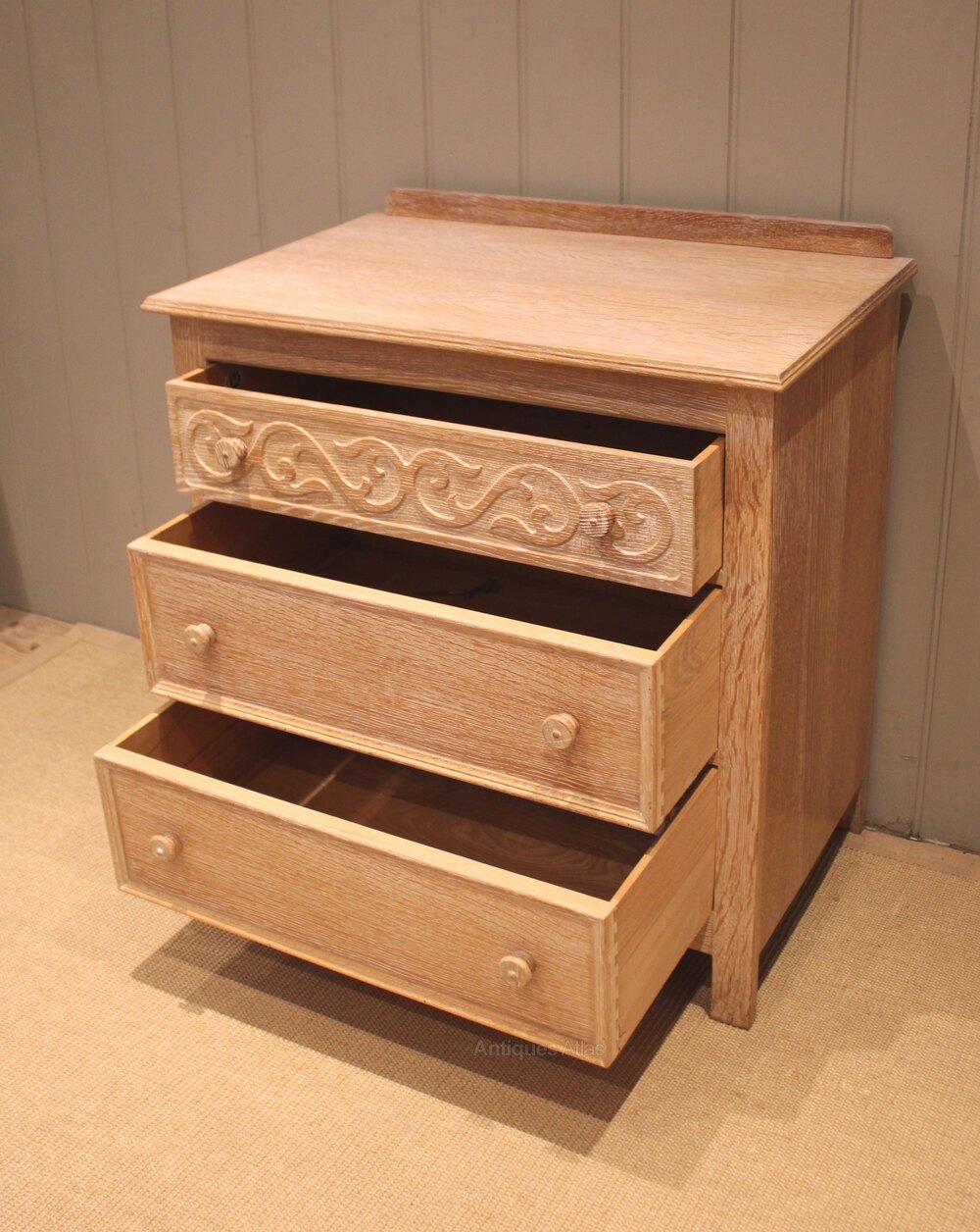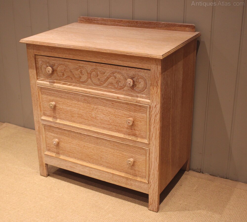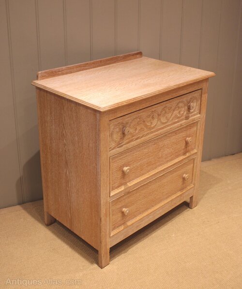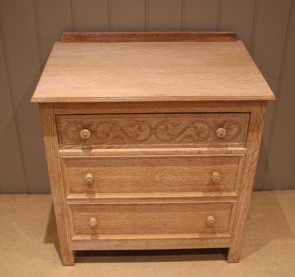 Small limed oak chest of three drawers , having turned wooden handles , the top one with carved decoration , raised on short straight feet. There is a matching wardrobe also avaliable .