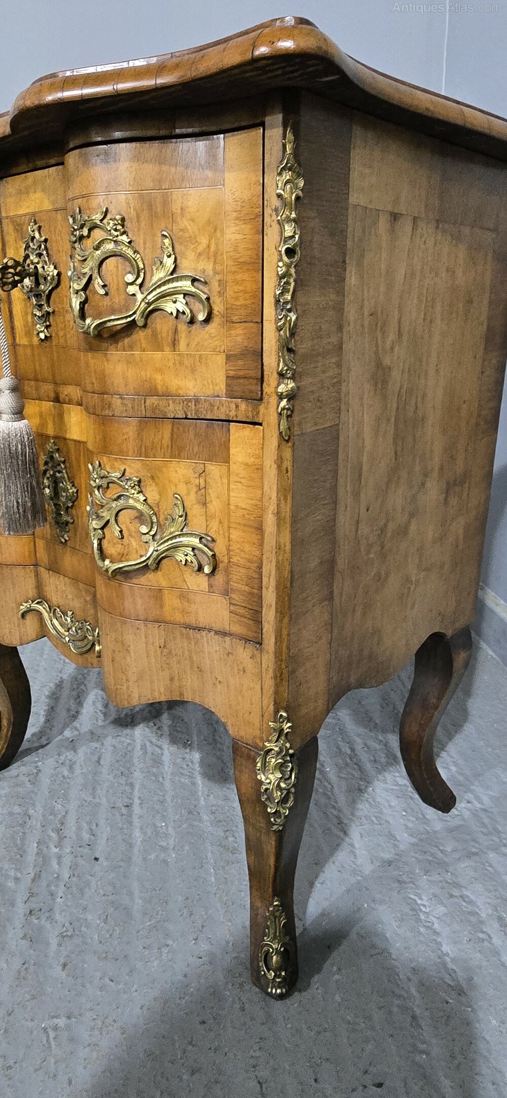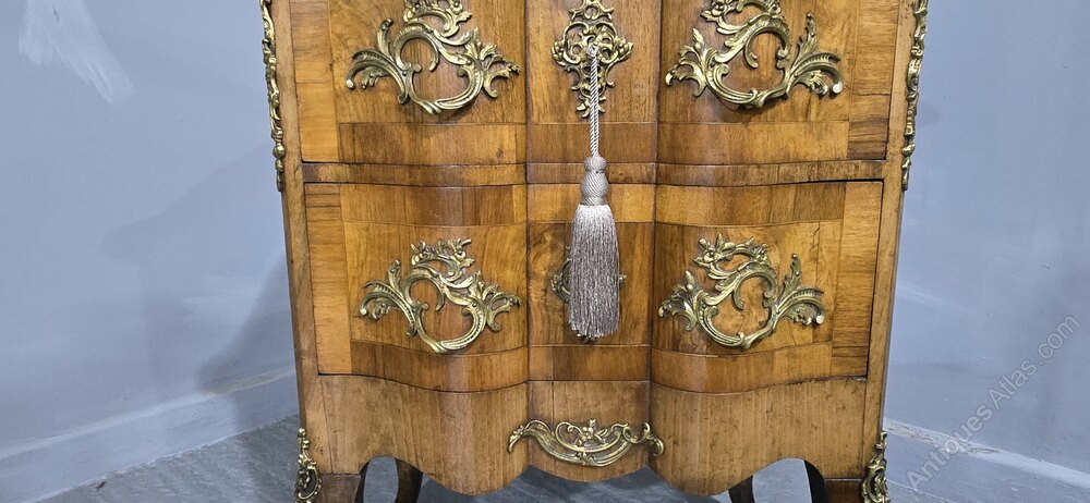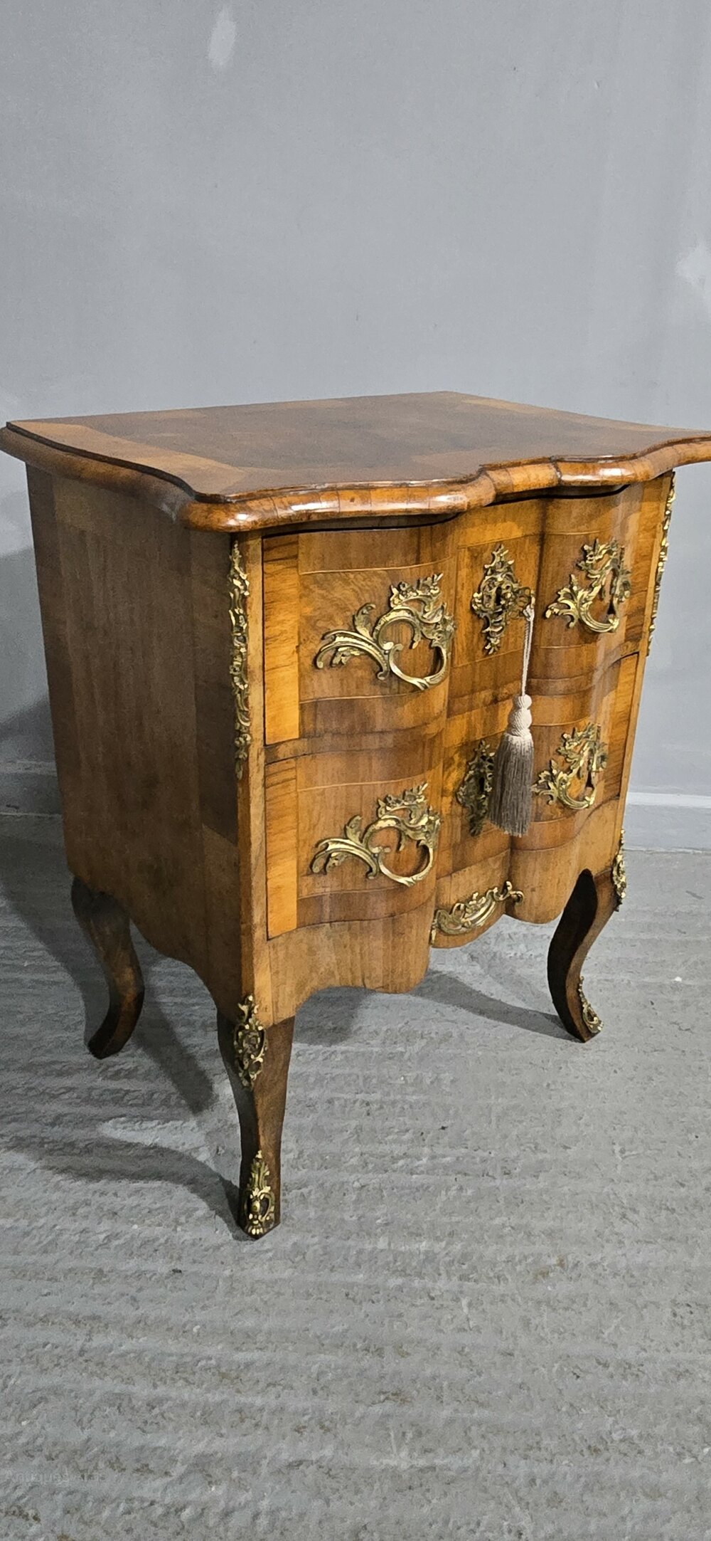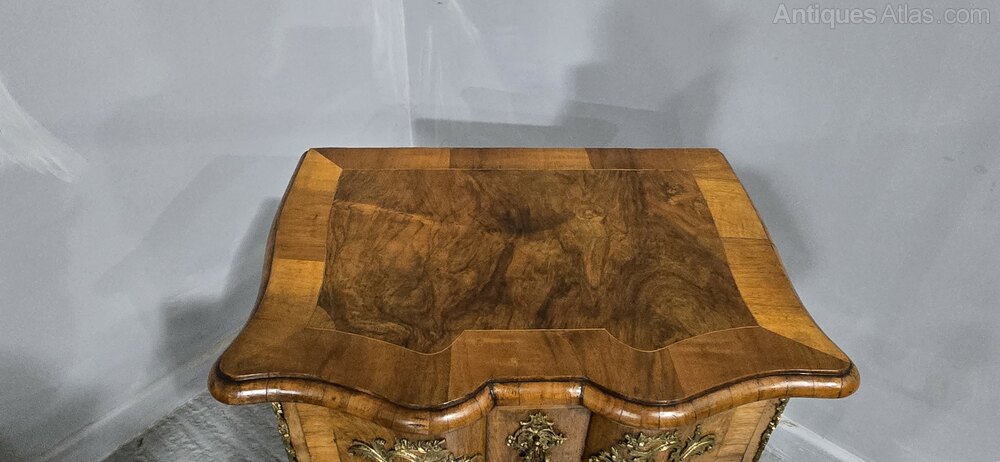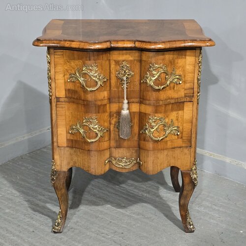 Excellent quality Maltese deep serpentine burr walnut crossbanded commode chest of two drawers, oak lined throughout, top quality ormolu mounts, in very nice condition throughout with a wonderful colour.