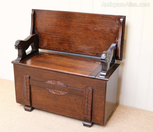 Small oak monks bench having a carved front with lift up seat and a top that folds to become a table with carved lion supports.Wen folded down to a table the height is 67cm