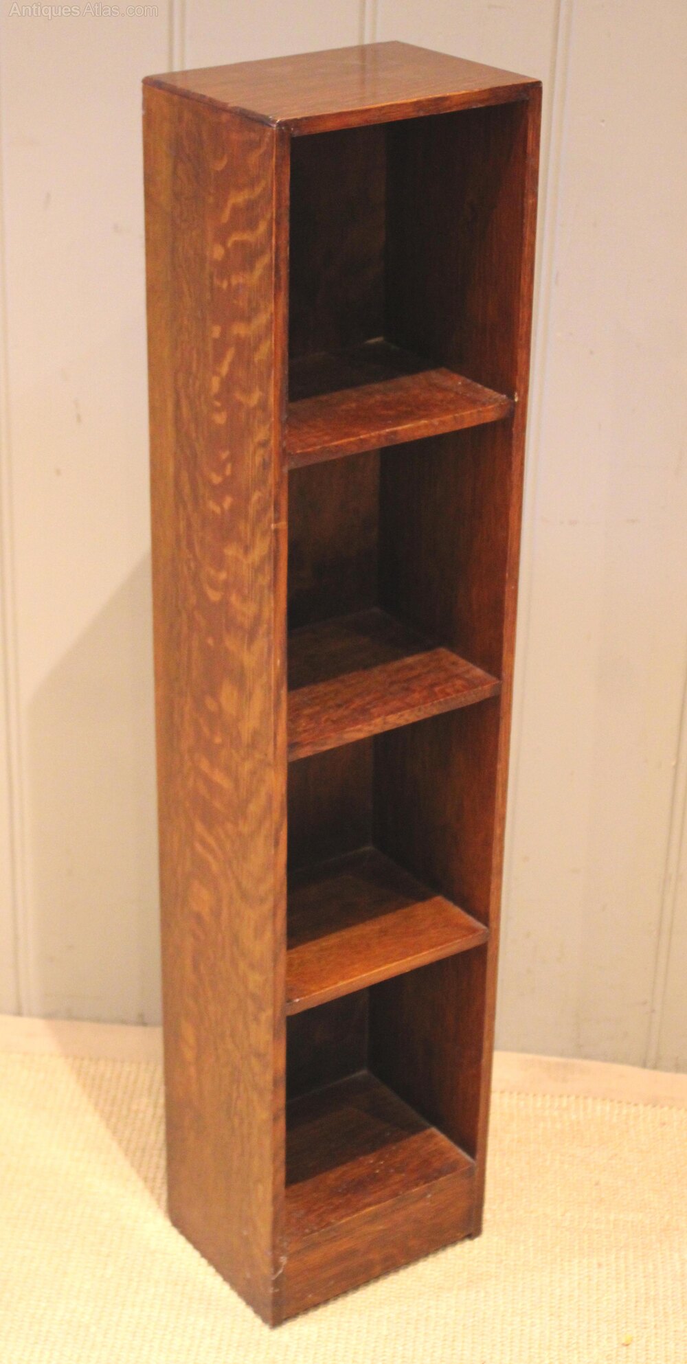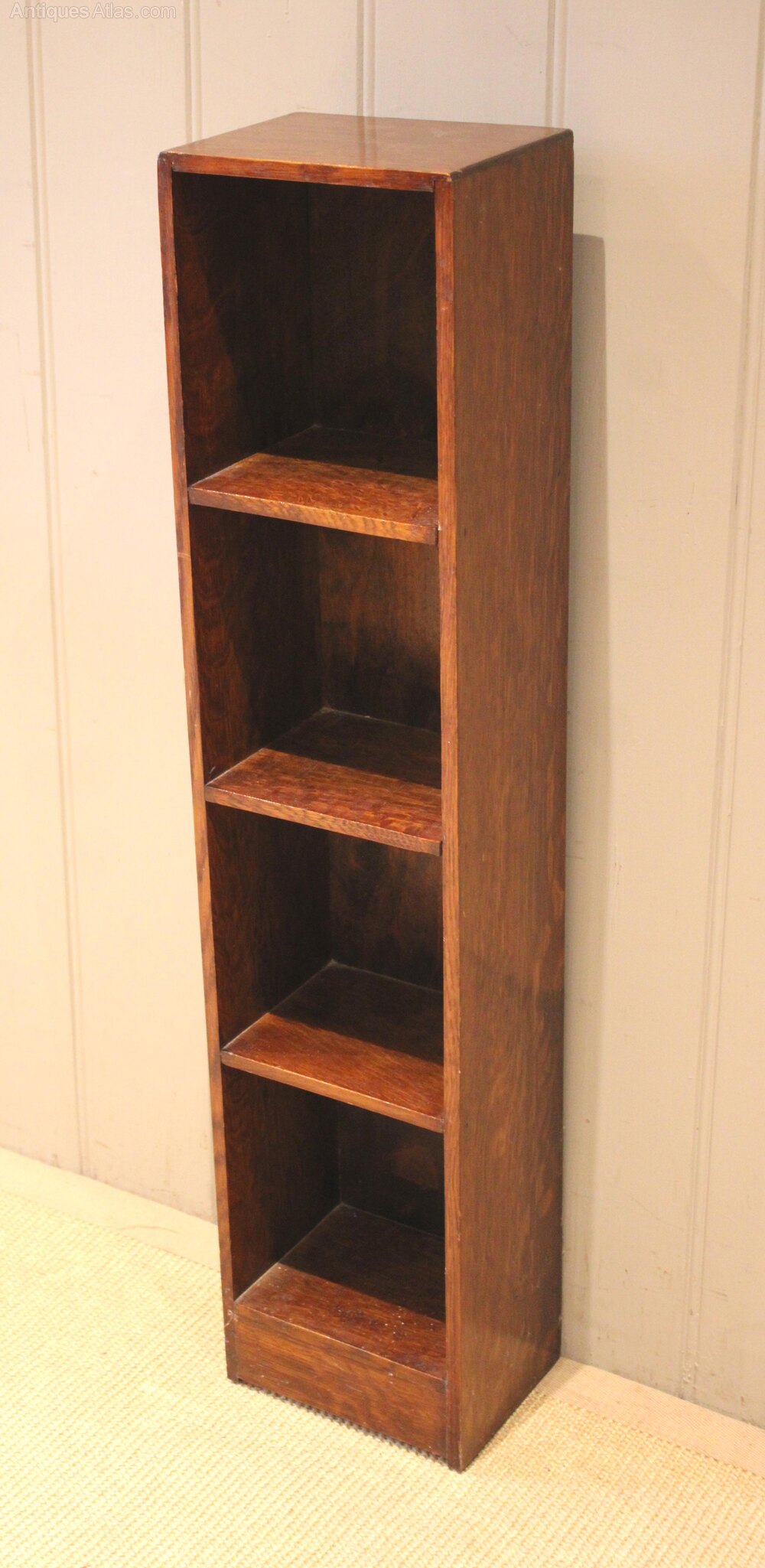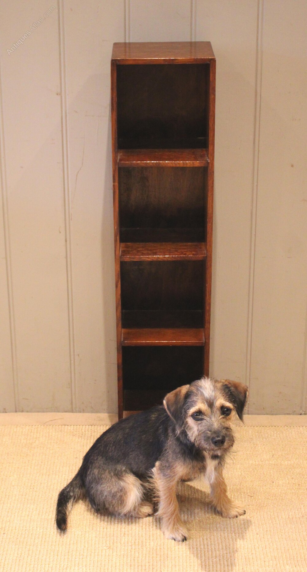 Small Oak open bookcase having four sections , raised on a plinth base . Each section measures 19 cm high , 17.5 cm wide and 14.5 cm deep .