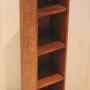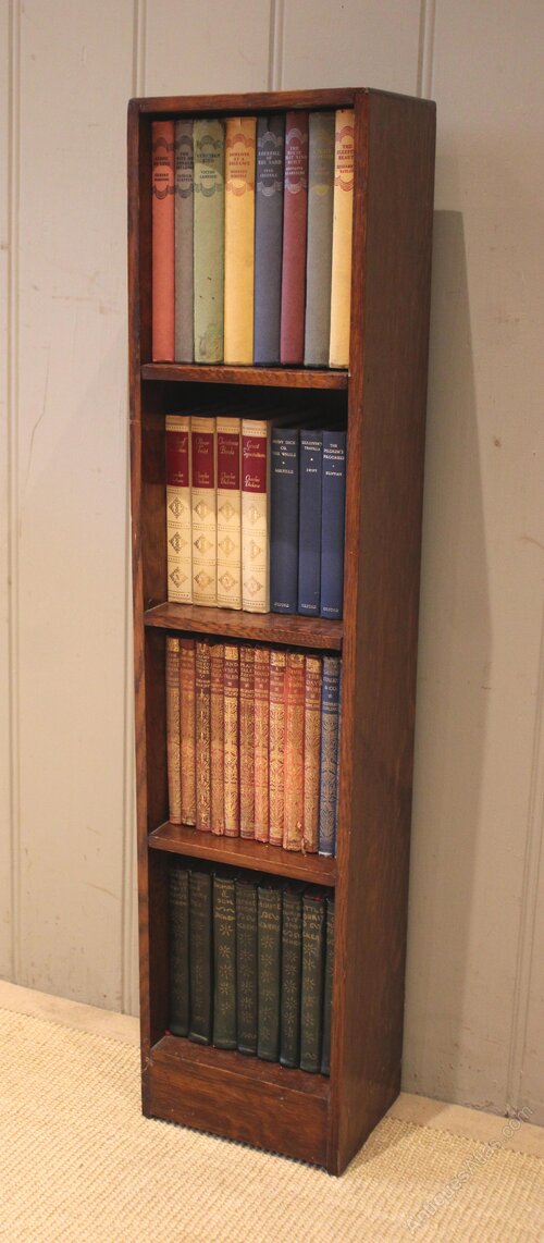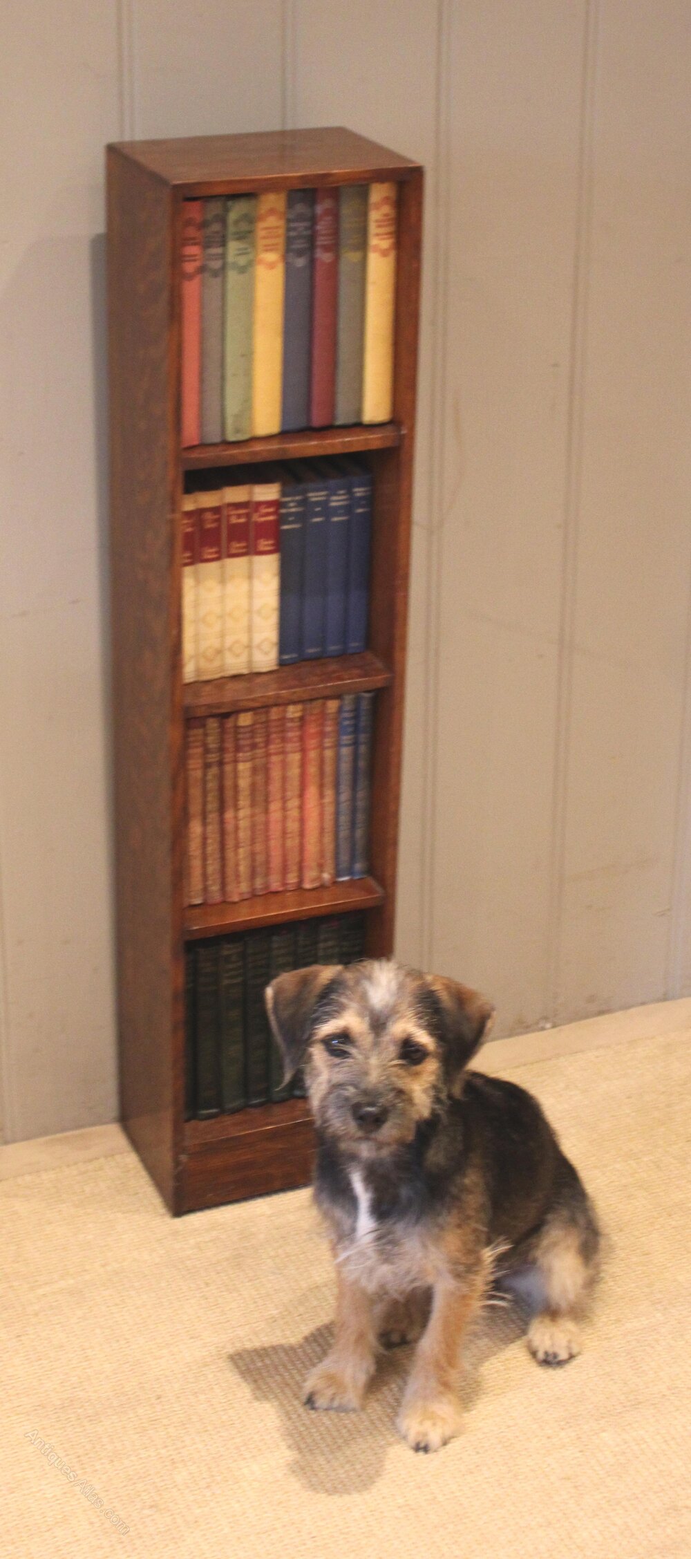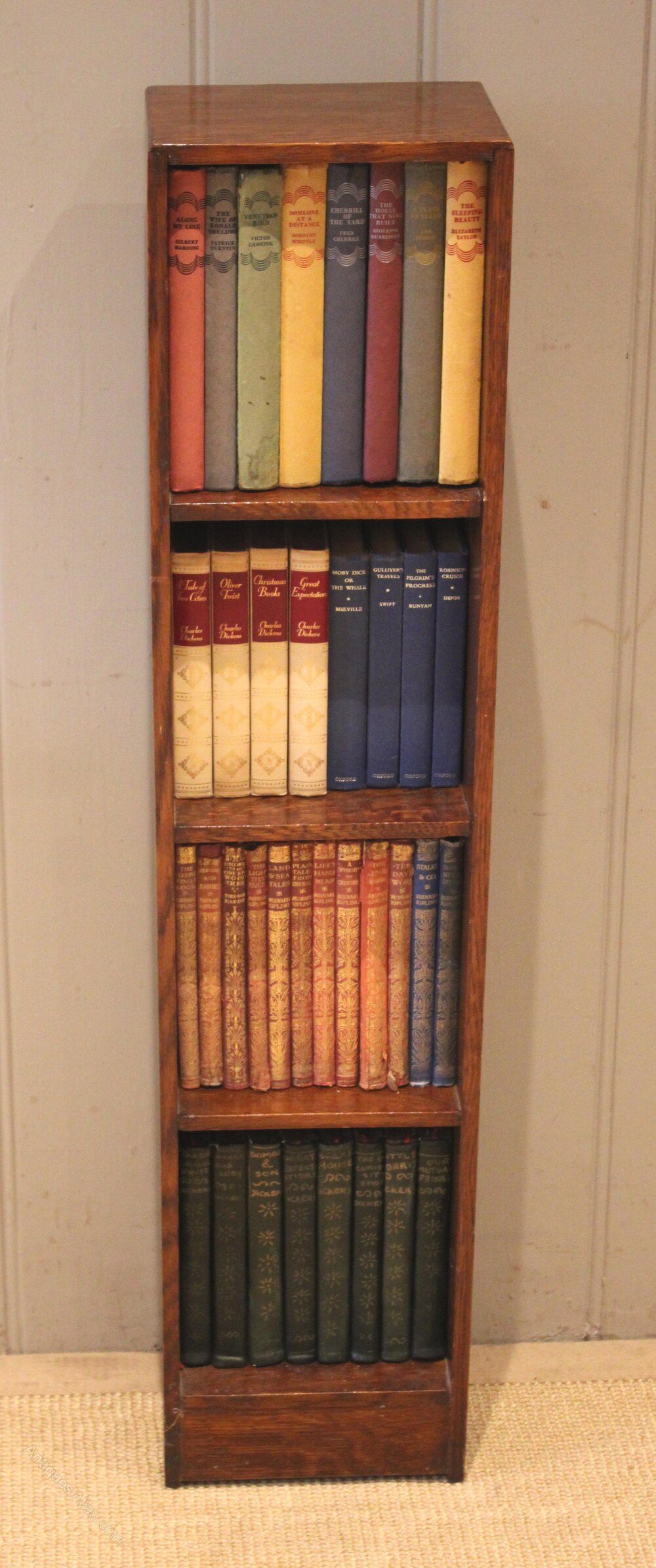 Small Oak open bookcase having four sections , raised on a plinth base . Each section measures 19 cm high , 17.5 cm wide and 14.5 cm deep .