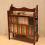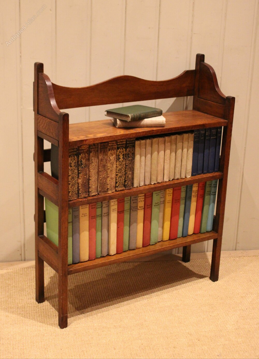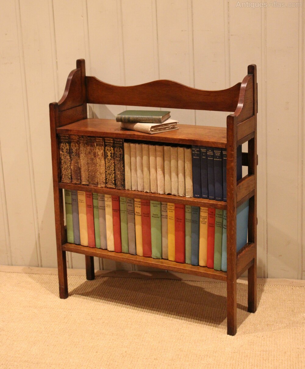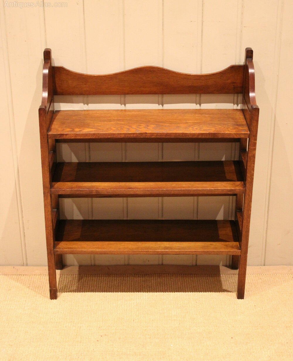 Oak open bookcase having three fixed shelves with open sides and back , raised on straight supports. The shelf dimensions are 56 cm wide , 18 cm deep and from the bottom up 18 cm high , and 16 cm high .