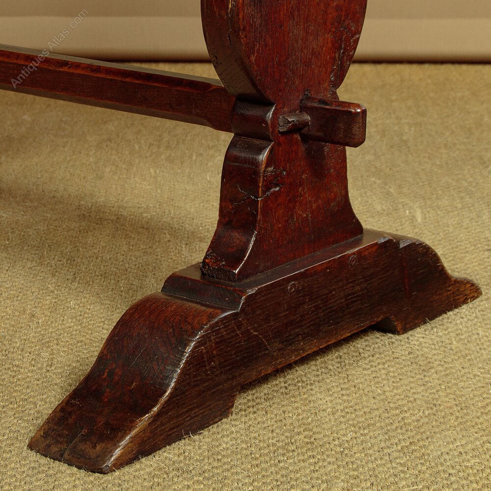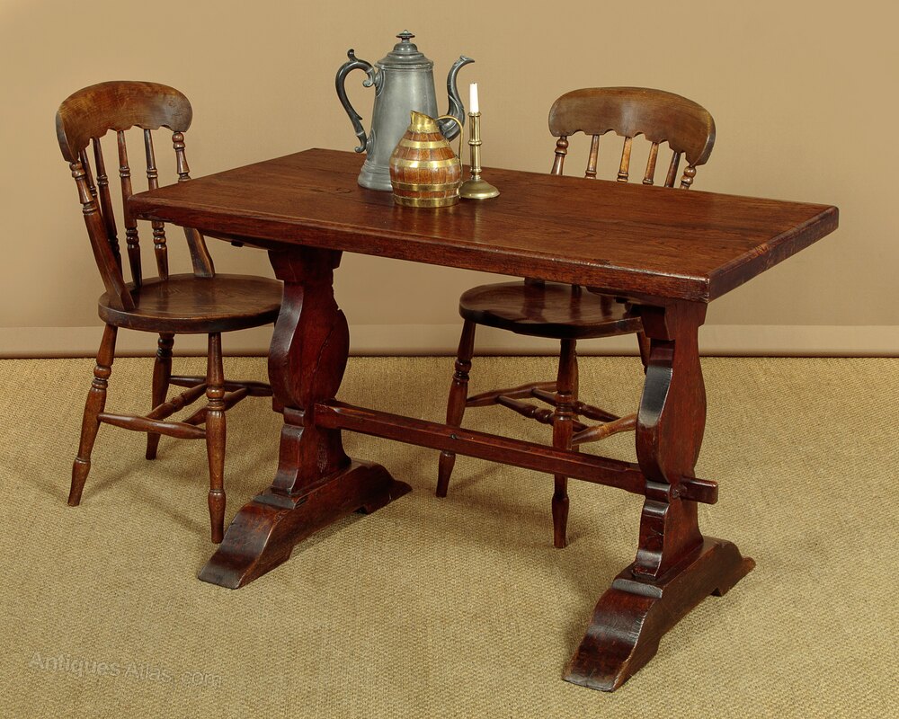 Unusually small solid oak refectory style dining table c.1920. Just 47" long. Solid oak top made from 2" thick boards. Raised on baluster silhouette ends on shaped sledge feet. Chamfered centre stretcher with a through tenon and tusk joint at the ends. Excellent colour and condition, cleaned and waxed in our workshops. Note the spits or shakes visible on the inner surface of one of the ends do not carry through to the other side and the timber is sound. Top can be removed for delivery.