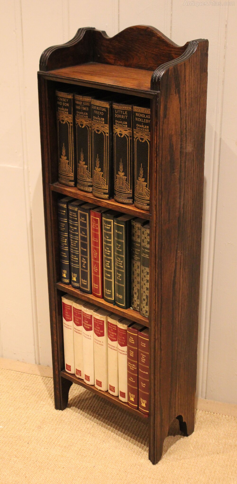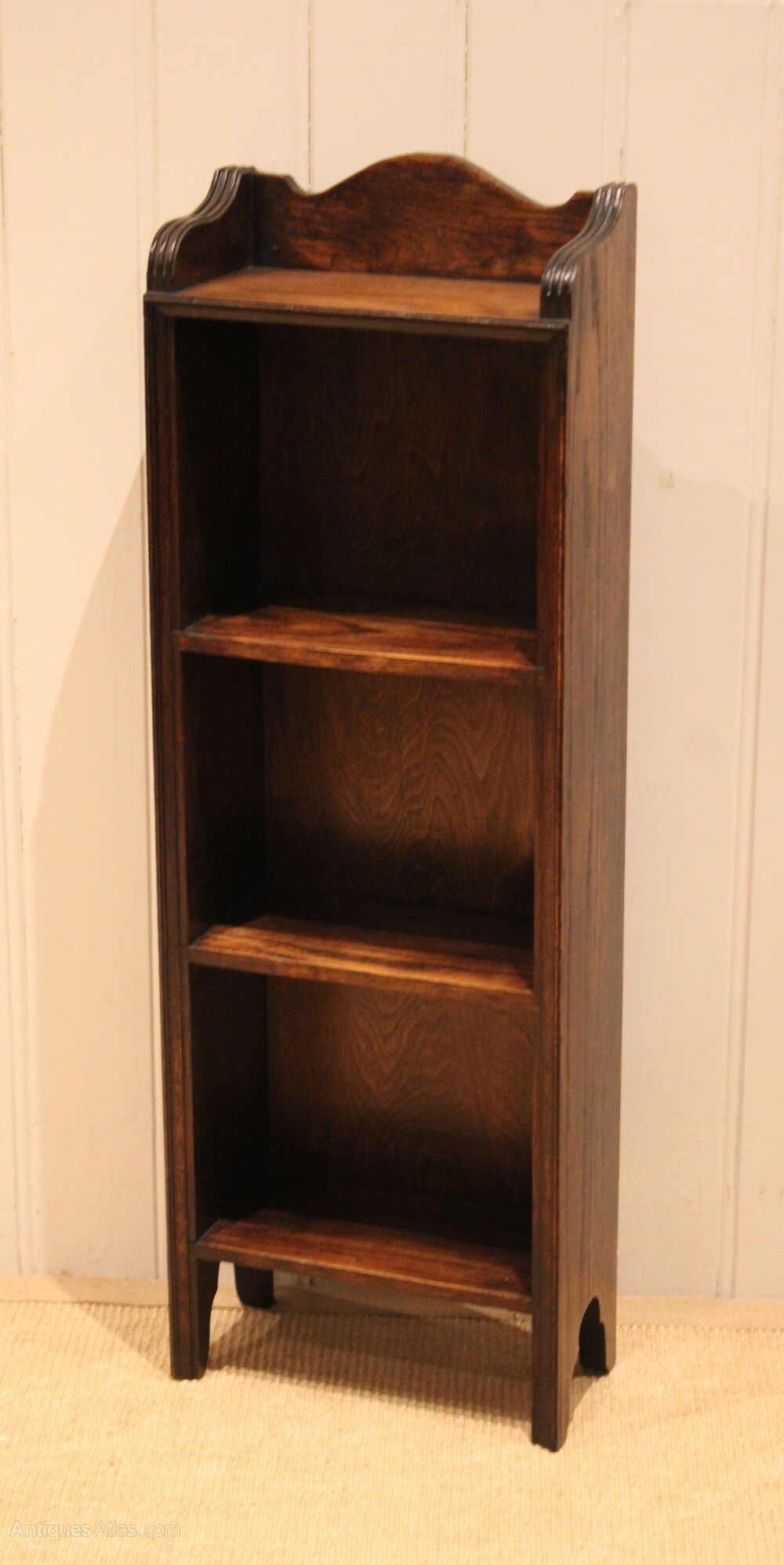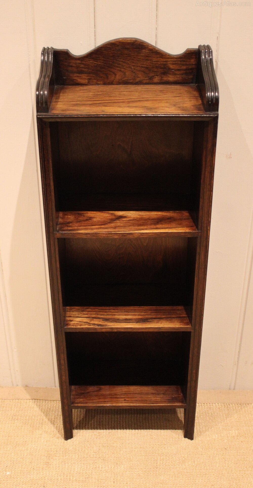 Small proportioned oak open bookcase having a reeded top edge with three fixed shelves , raised on side brackets . The shelf dimensions are 13.5 cm deep , 26.5 cm wide and 22.5 cm high .