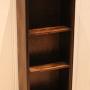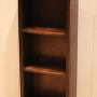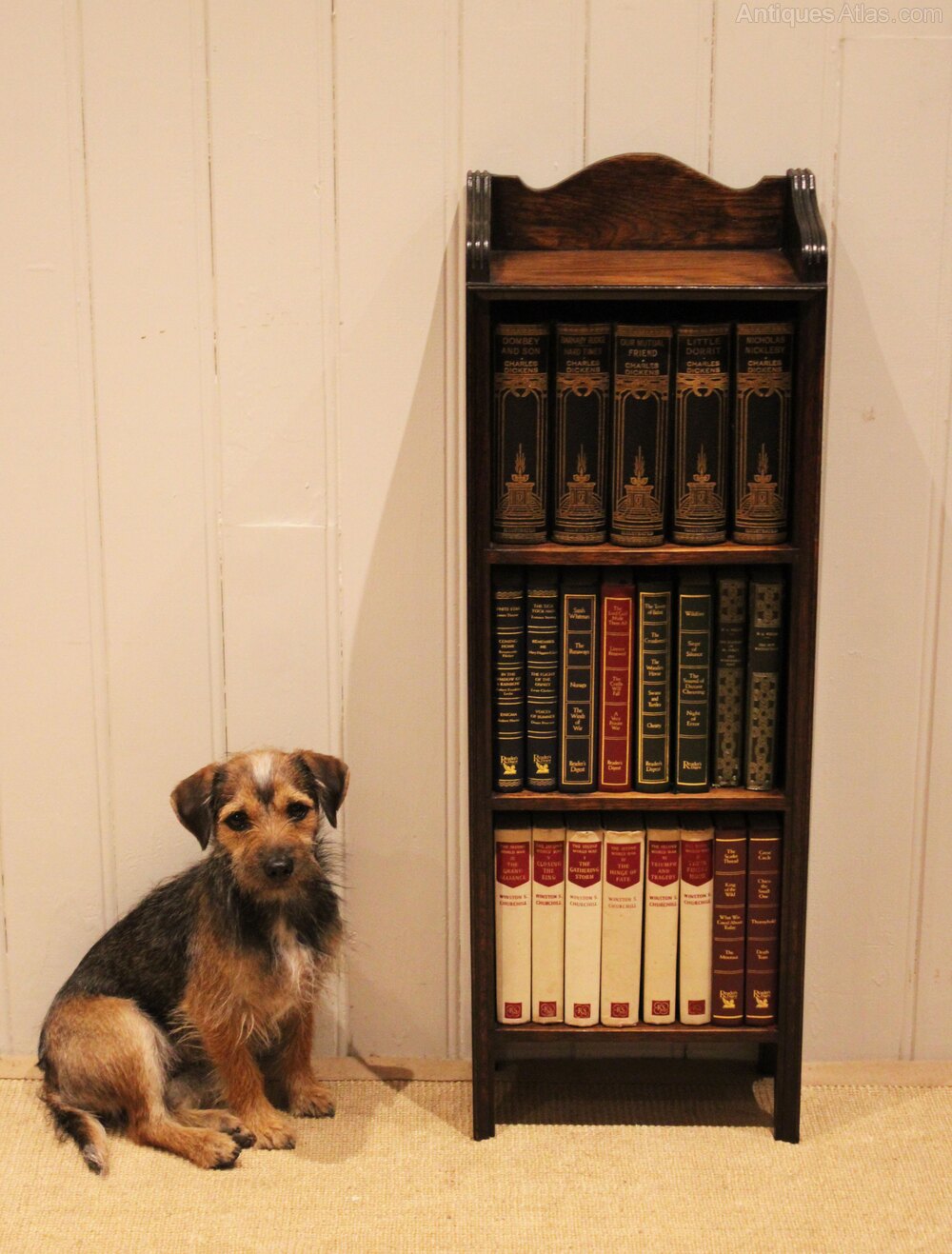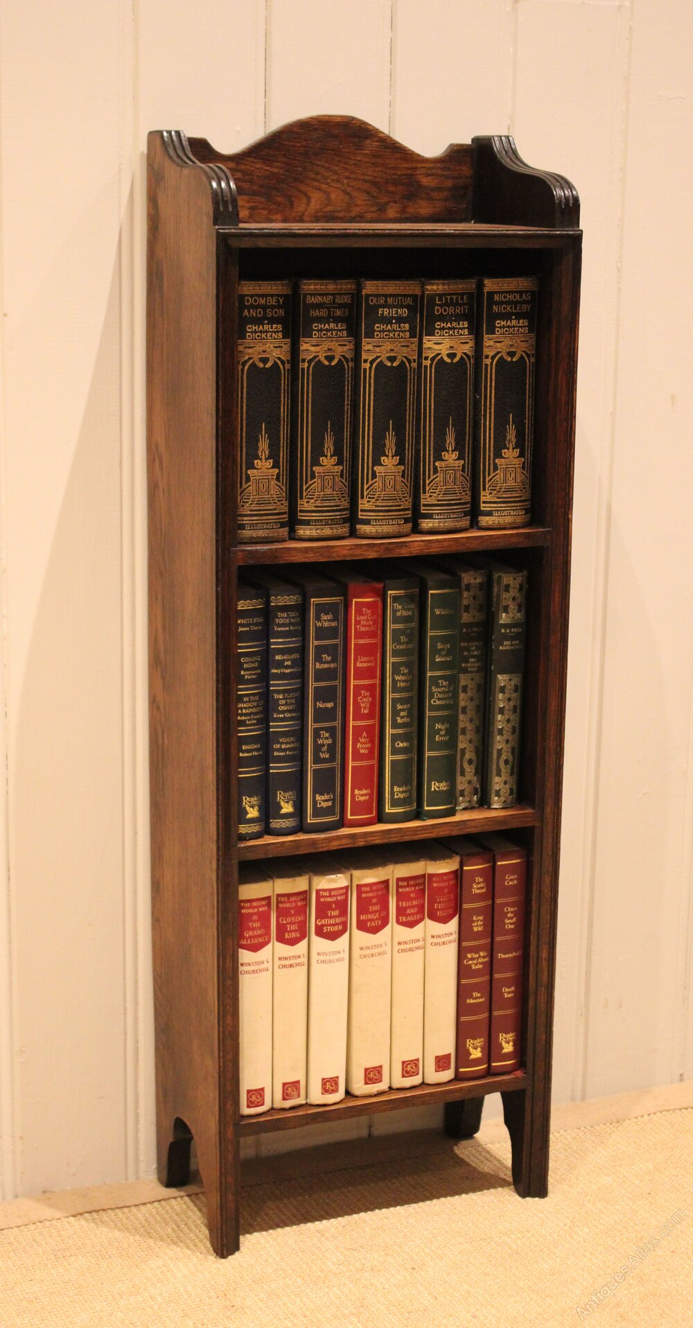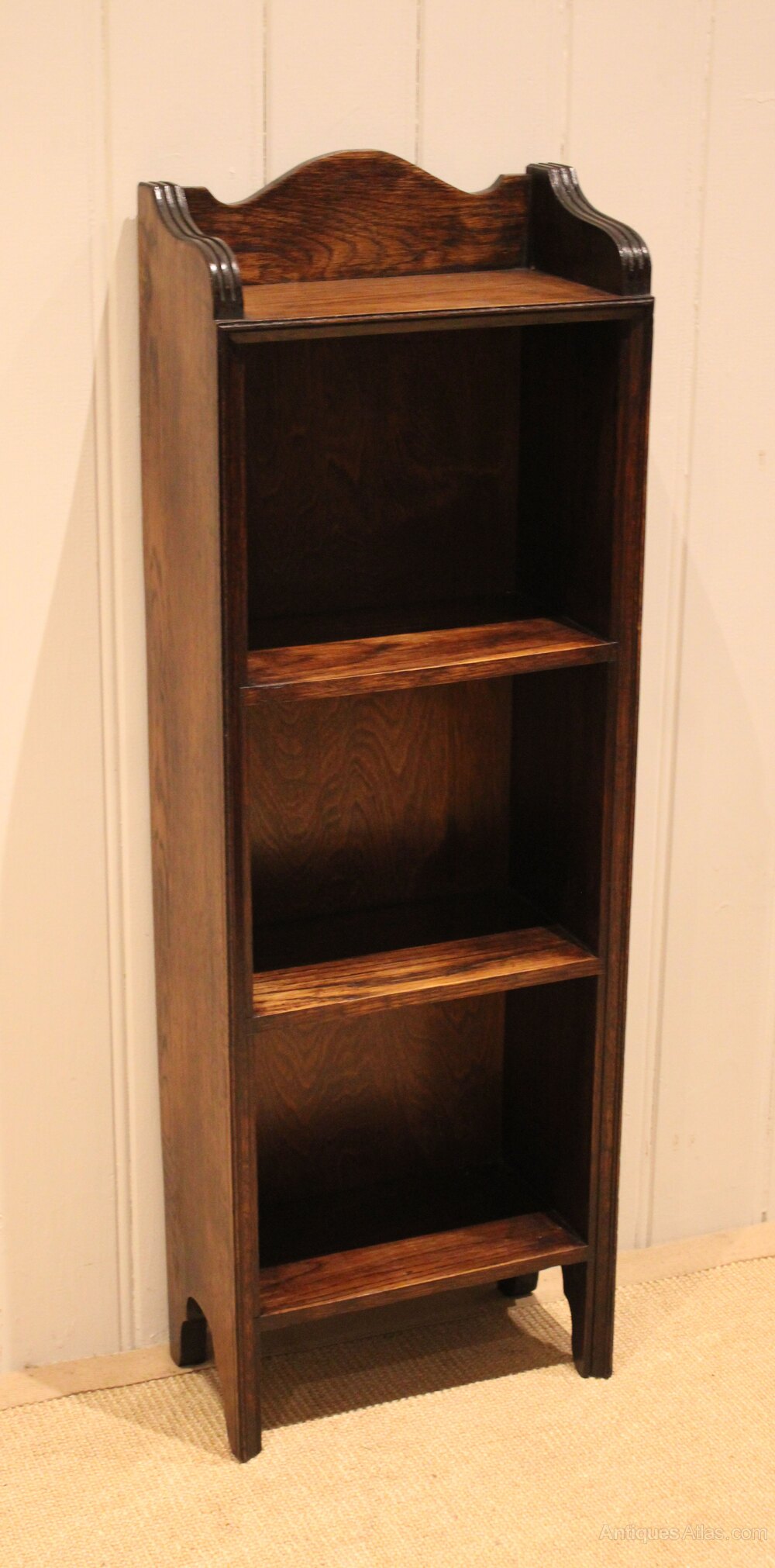 Small proportioned oak open bookcase having a reeded top edge with three fixed shelves , raised on side brackets . The shelf dimensions are 13.5 cm deep , 26.5 cm wide and 22.5 cm high .