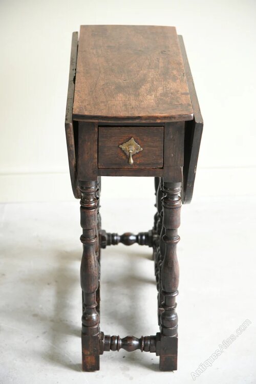 Small Rustic Oak Gate Leg Table. 18th Century & later occasional table, walnut & oak oval top with drop leaves on turned supports with small frieze drawer in each end.