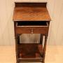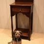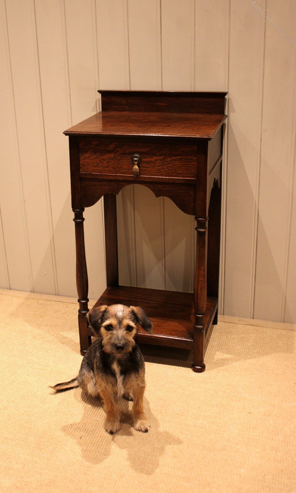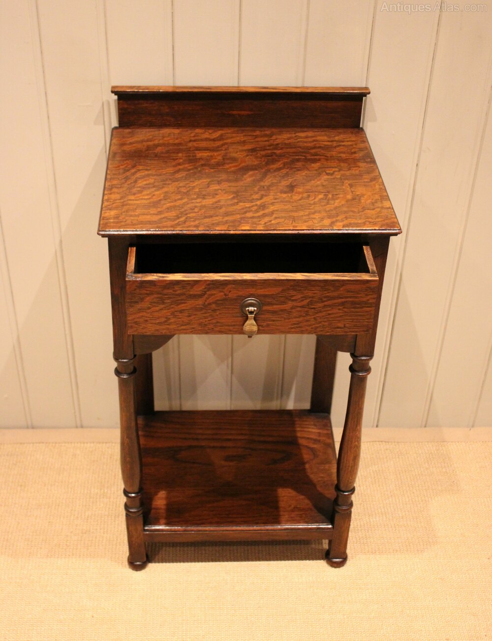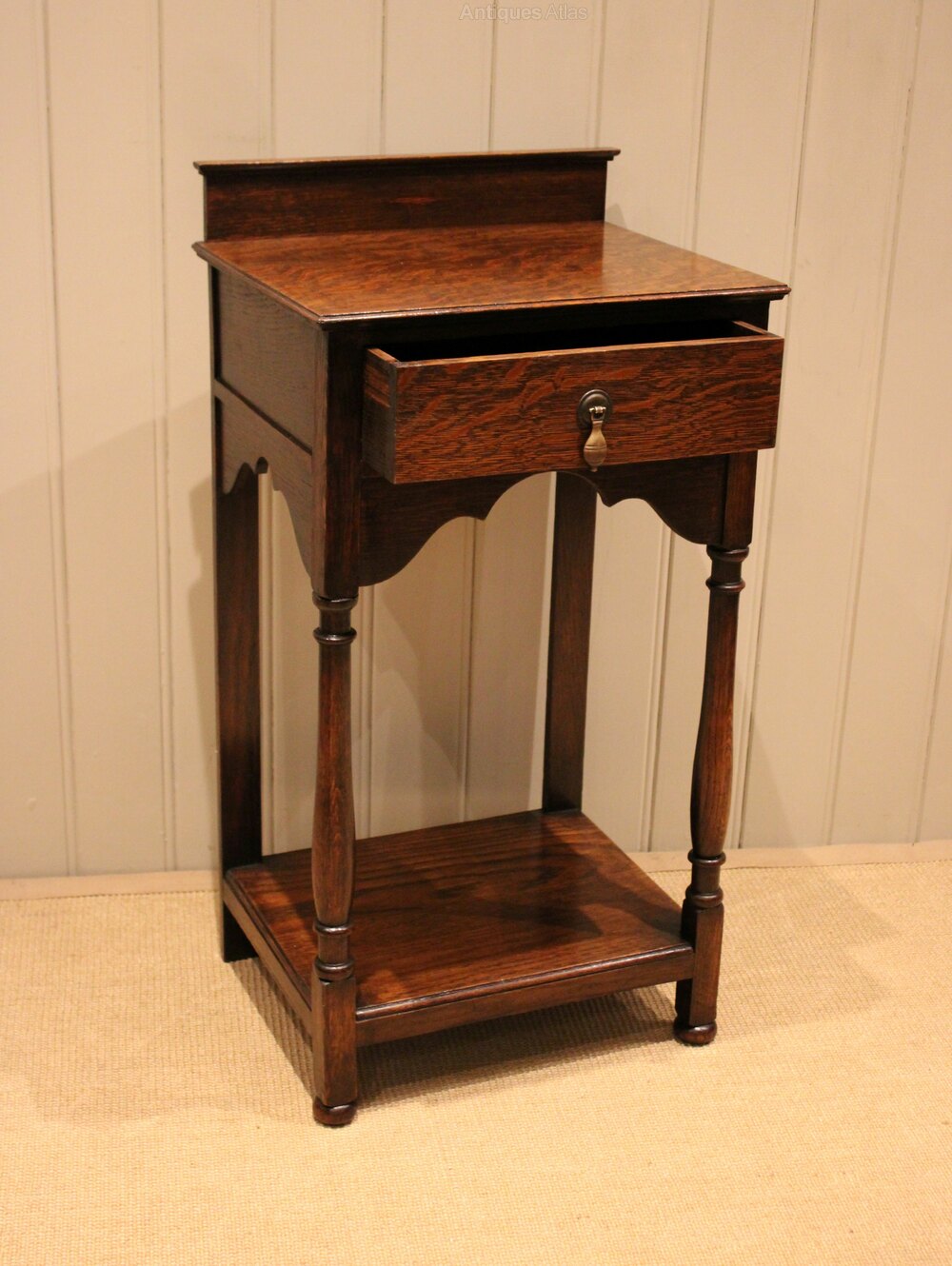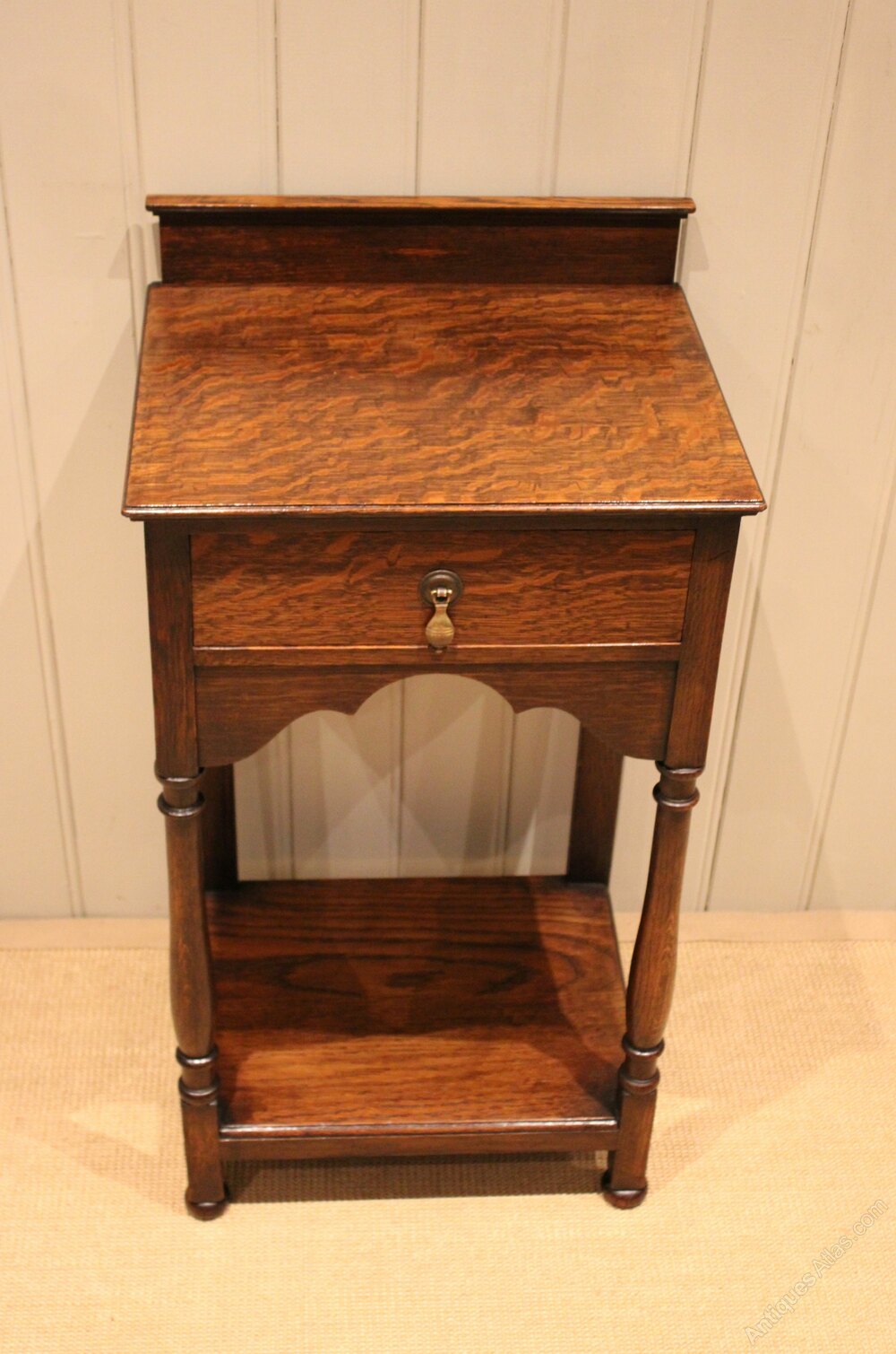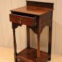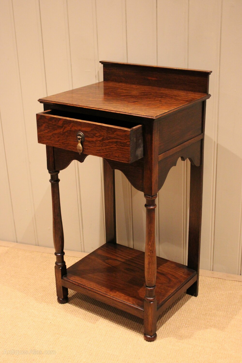 Small solid oak side table having a single drawer above a tiered base , with an under tier having decorative brackets to the corners , raised on turned legs .