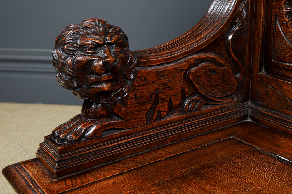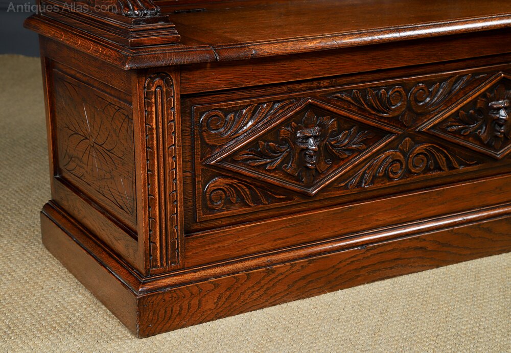 The moulded panelled seat lifts up to reveal a large storage area, which is ideal for storing shoes and boots in the hallway. Below the seat, the front of the Victorian oak settle is decorated with a carved panel, incorporating two “Green Man” carved faces, set with lozenge-shaped panels, flanked by scroll foliate carvings. The settle rests on the original moulded plinth. The sides of the oak bench incorporated floral scribe carvings, set within a moulded panel.