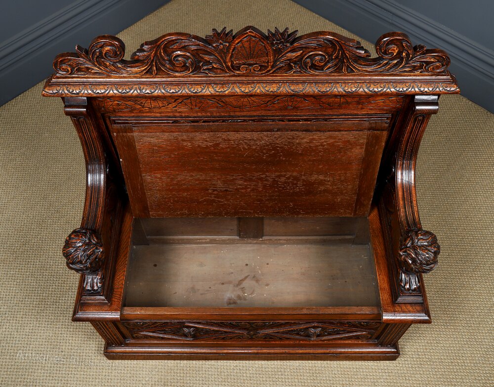 This is a fine quality small antique English Victorian oak bench, which is also known as a “settle”, incorporating a useful hinged storage box, decorated with “Green Man” carvings, circa 1880, in excellent original condition. Ideal for use in the hallway for storing shoes & boots. The small antique oak settle comprises a mid-height oak back, boasting a foliate scroll-carved pediment, above a moulded top rail. The back features a lozenge shaped panel incorporating a “Green Man” carved face, flanked by scroll carvings and flower-head carvings. Adjoining the back and seat, are down-swept reeded, segmented carved arms, terminating on carved armrests in the shape of a lion’s body and head, which stare at each other across the seat.