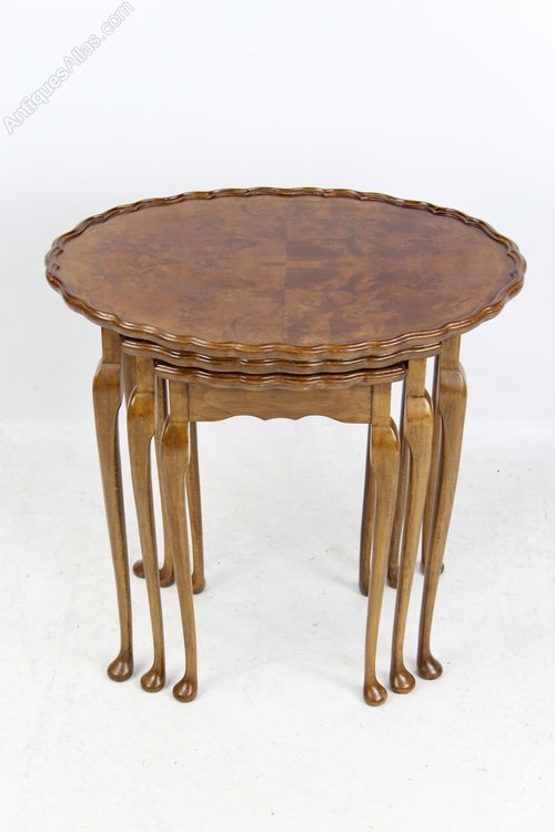 A charming vintage nest of 3 antique tables dating from circa mid-20th Century. In a richly figured walnut, with scalloped edge tops and slender cabriole legs. A well-made, quality nest of tables in good condition, solid and sturdy, with good patina.