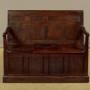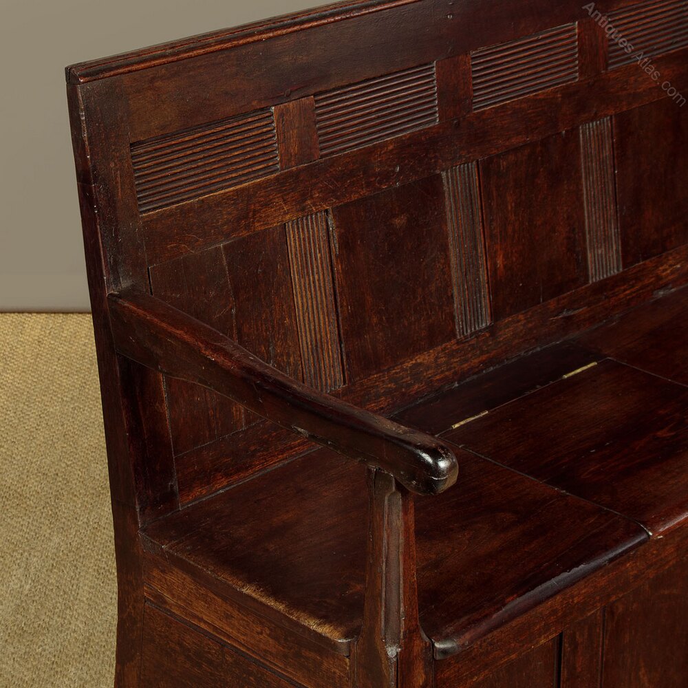 Small early 19th.c. Welsh box settle or hall bench c.1800. Purchased locally, it is an unusual example being in teak or similar rather than native timber - suggesting a link to maritime trade perhaps? Low and slightly sloping backrest with original moulding to the top and unusual reeded detail to the upper panels and the lower mullions. Shaped arms with rounded ends on tapering and chamfered supports. Board seat, the centre panel hinged to reveal useful storage below for boots and shoes etc. Flat panels to the front and sides and a moulded plinth or kickboard around the base. Note the original backboards and how the rear flares outwards for stability. Great rustic character with some old wear and repairs but otherwise excellent colour and condition, restored cleaned and waxed in our workshops.