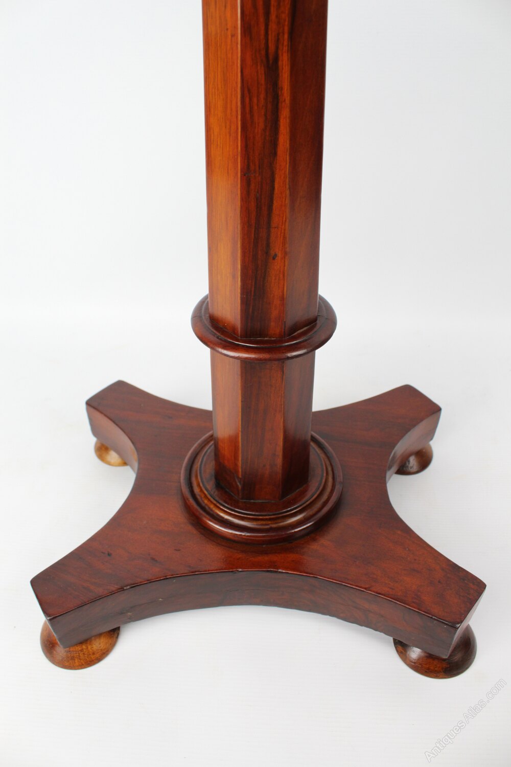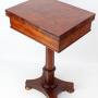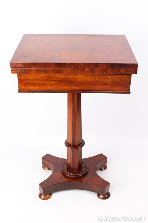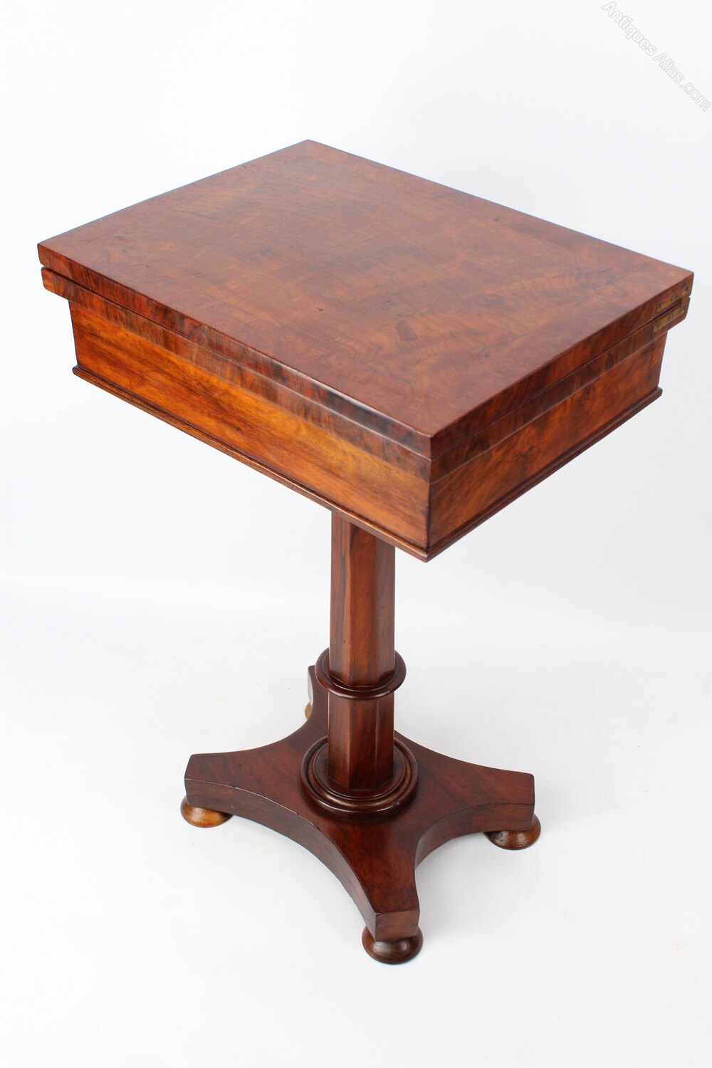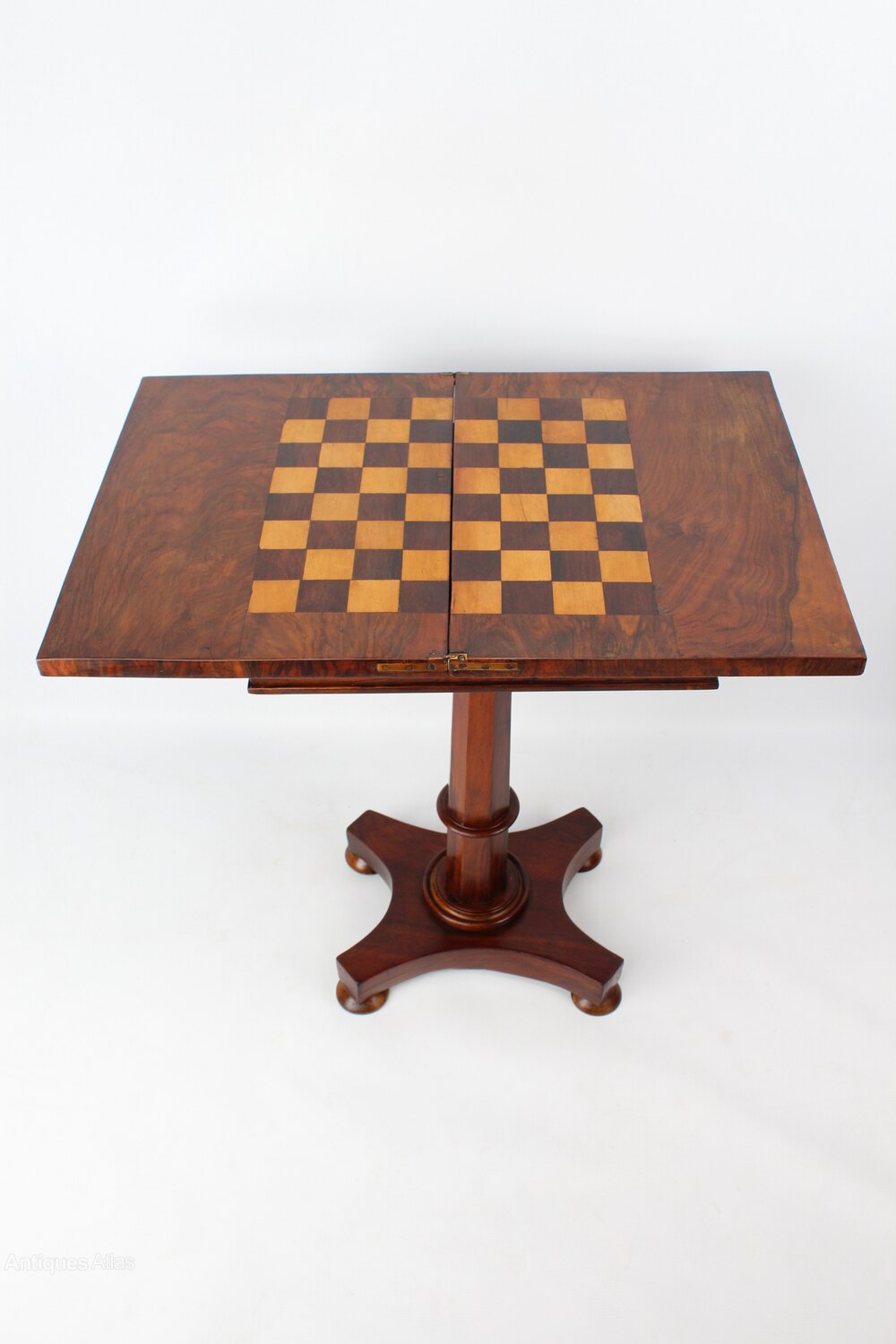 A charming small antique William IV walnut fold over chess top table dating from circa 1835. Featuring a well-figured walnut and burr walnut banded top over a tapered column with turned collar, raised on a quatroform base on turned feet. The top lifts, swivels and turns over to reveal a beautifully inlaid chess board, with original blue paper lined compartment for storing chess pieces. In good condition with good colour and patina, this wonderful elegant table would make a great lamp table in a living room or hall, folding over for a game of chess when the occasion arises.