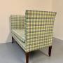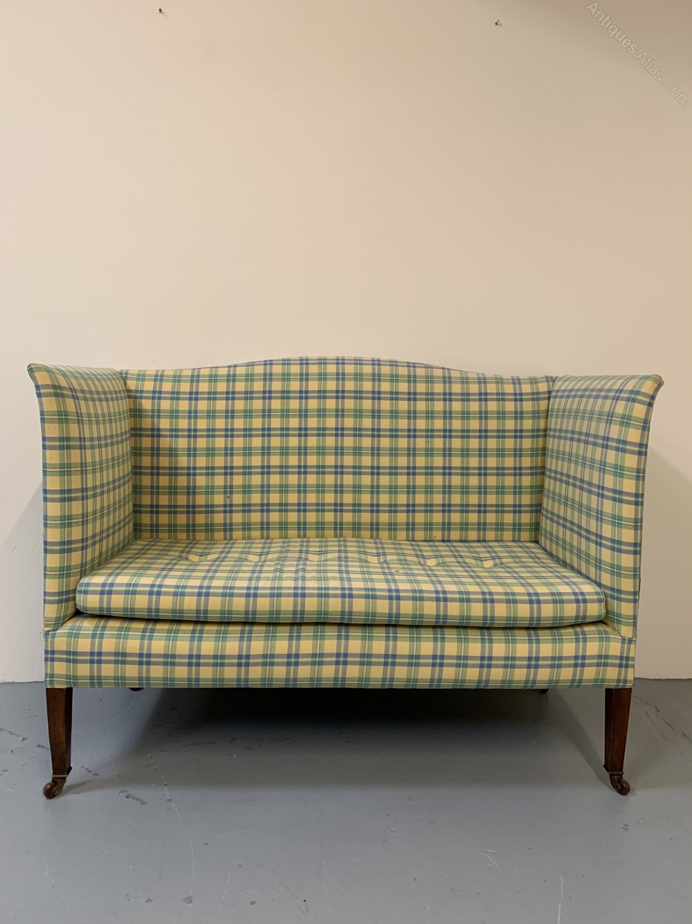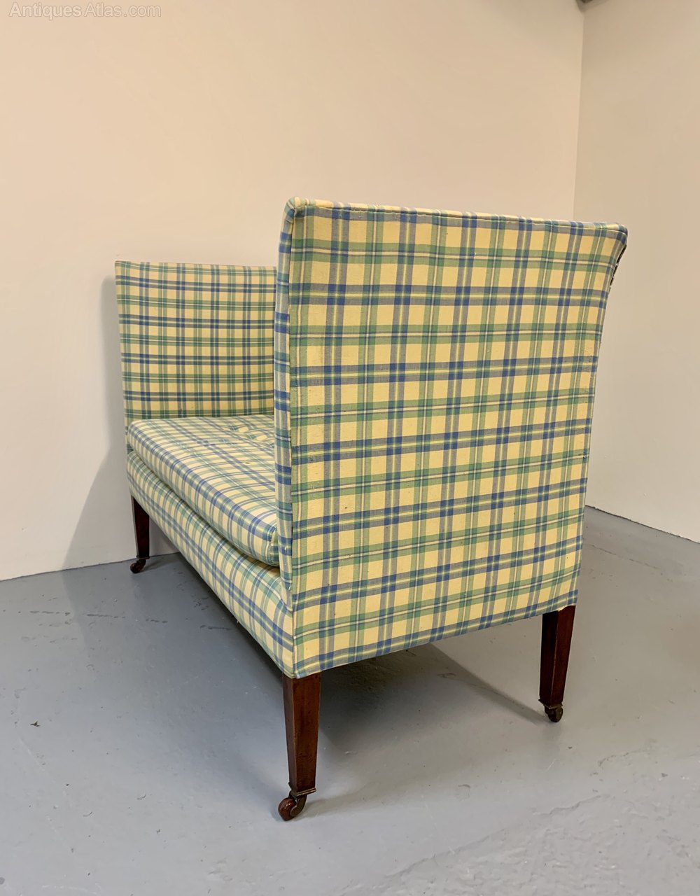 Edwardian two seat sofa of unusual design on mahogany square taper legs good structurally top cover marked in places. Please call if you require any further details.