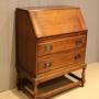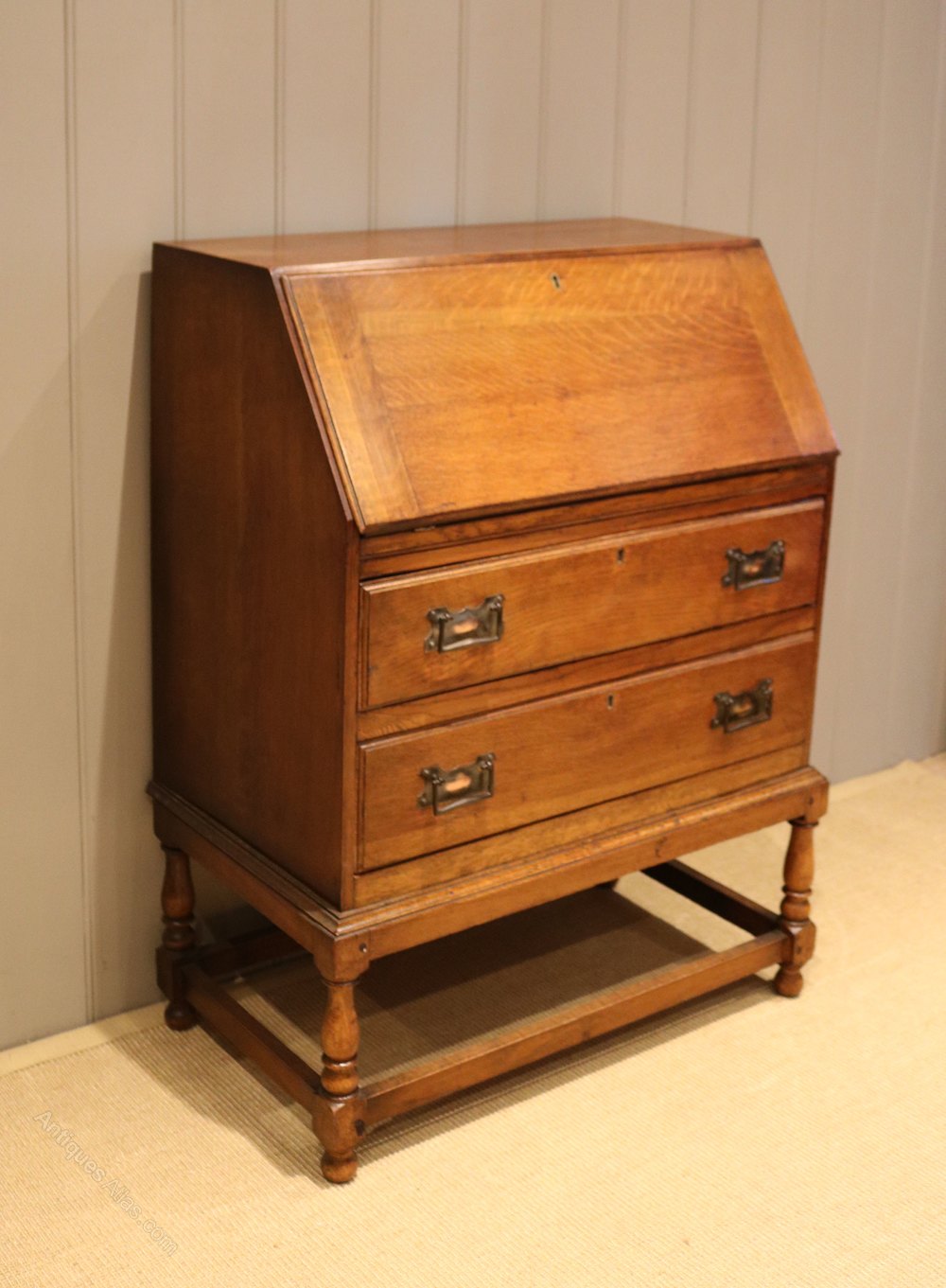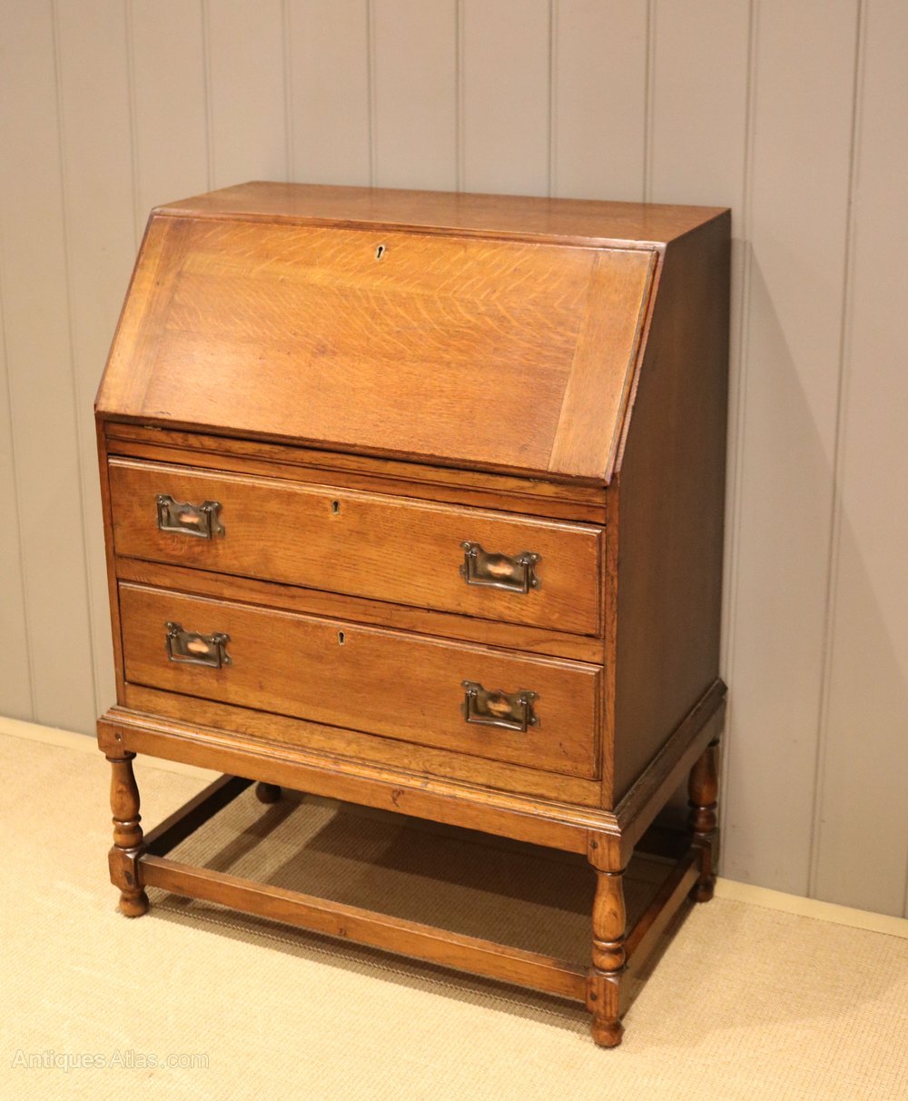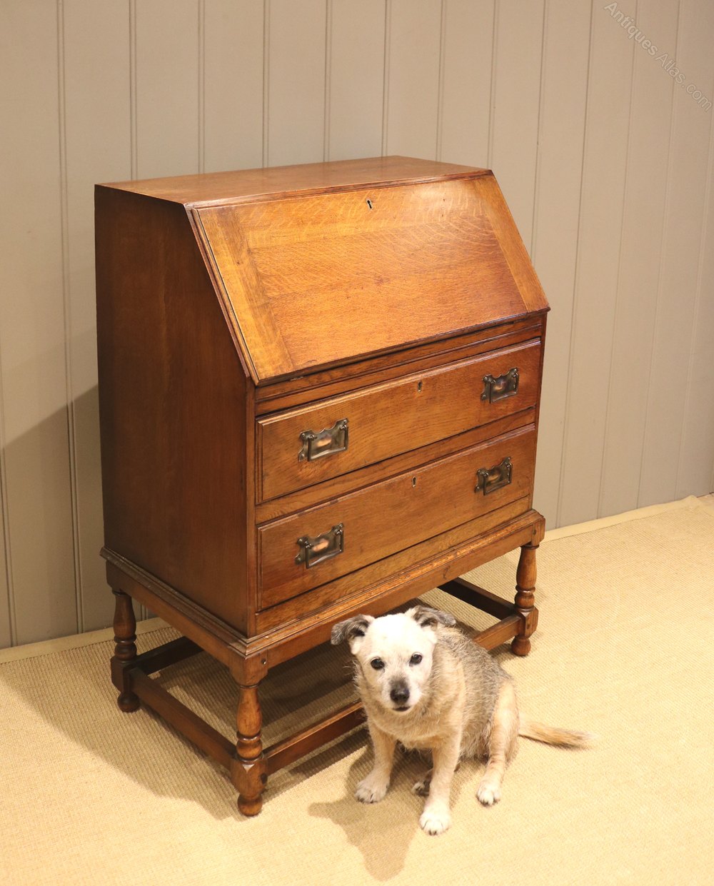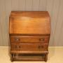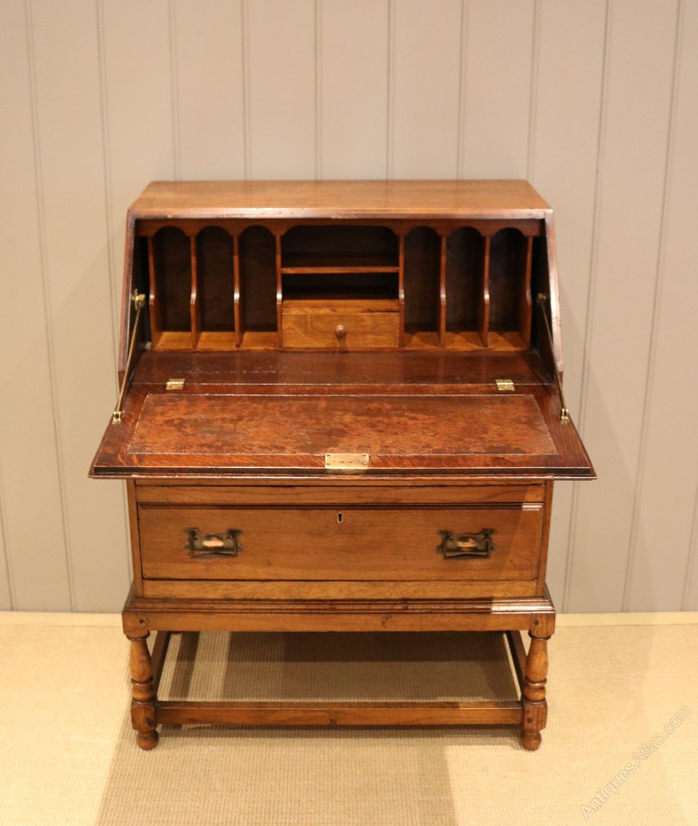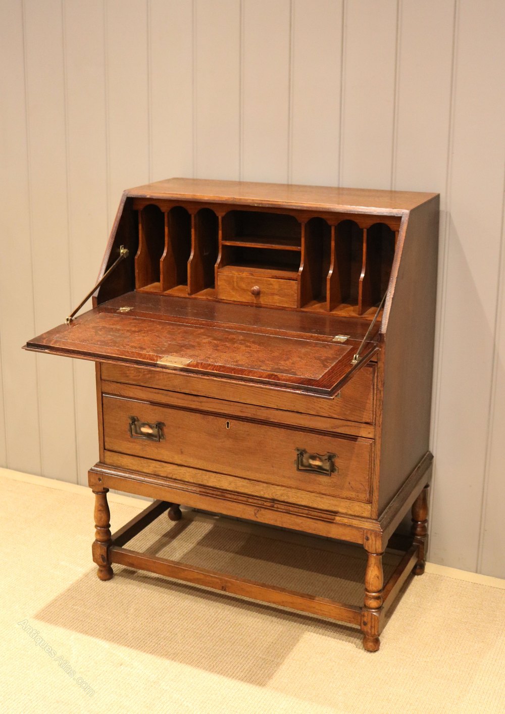 Solid oak bureau having a fall front opening to reveal a fitted interior , with a leather scriber , above two drawers , raised on substantial turned legs united by stretchers