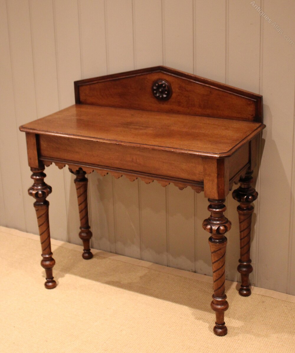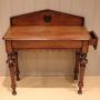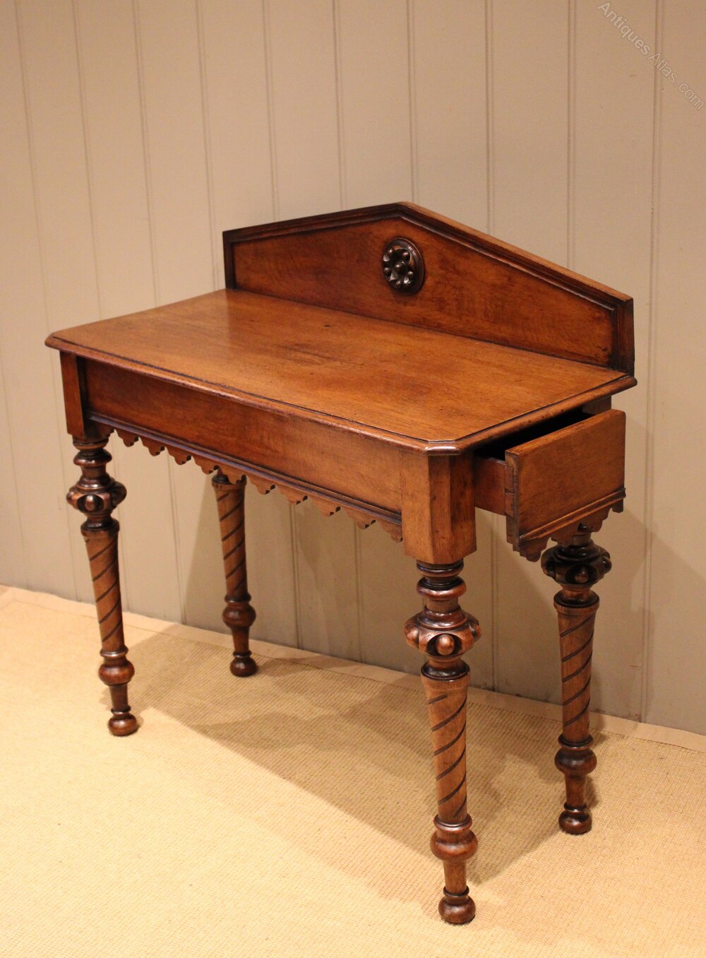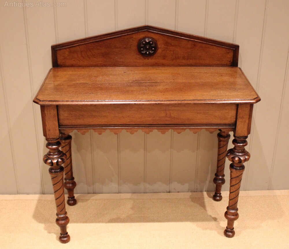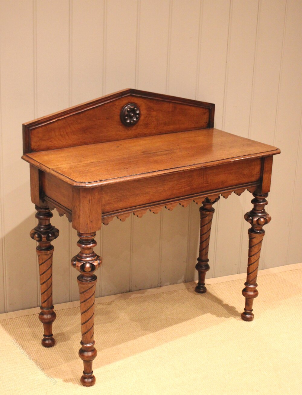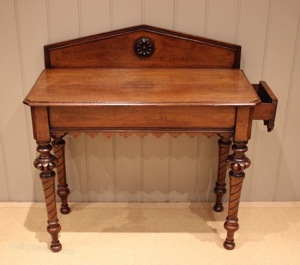 Golden oak hall table having a Pugin influence , with a shaped upstand with central carving , a carved apron, having a drawer to one end , raised on decorative carved legs.