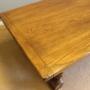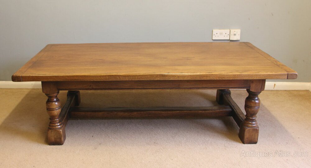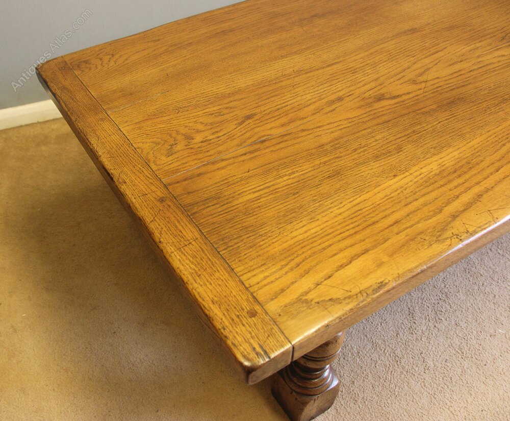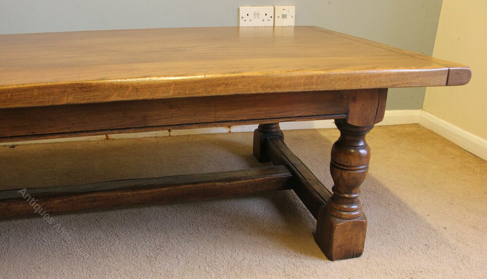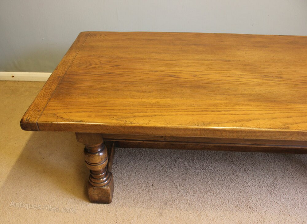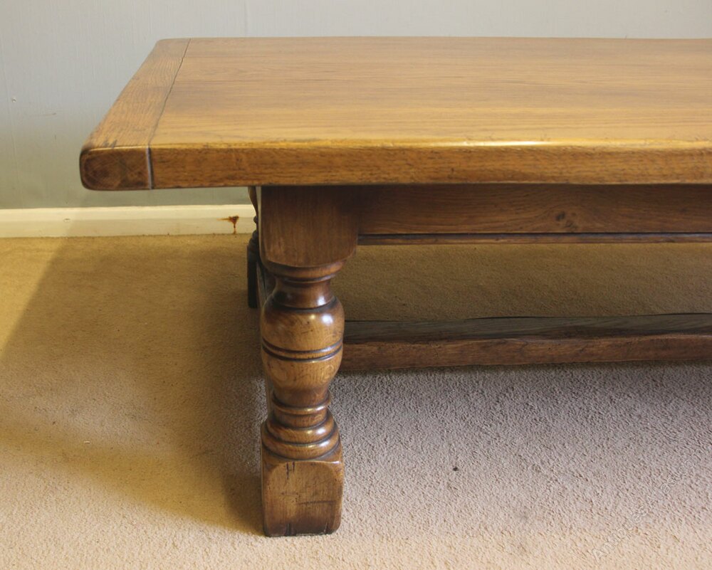 Solid Oak Large Low Coffee Table, This antique large oak refectory style low coffee table has a thick top with cleated ends and supported by four turned legs united by stretchers,