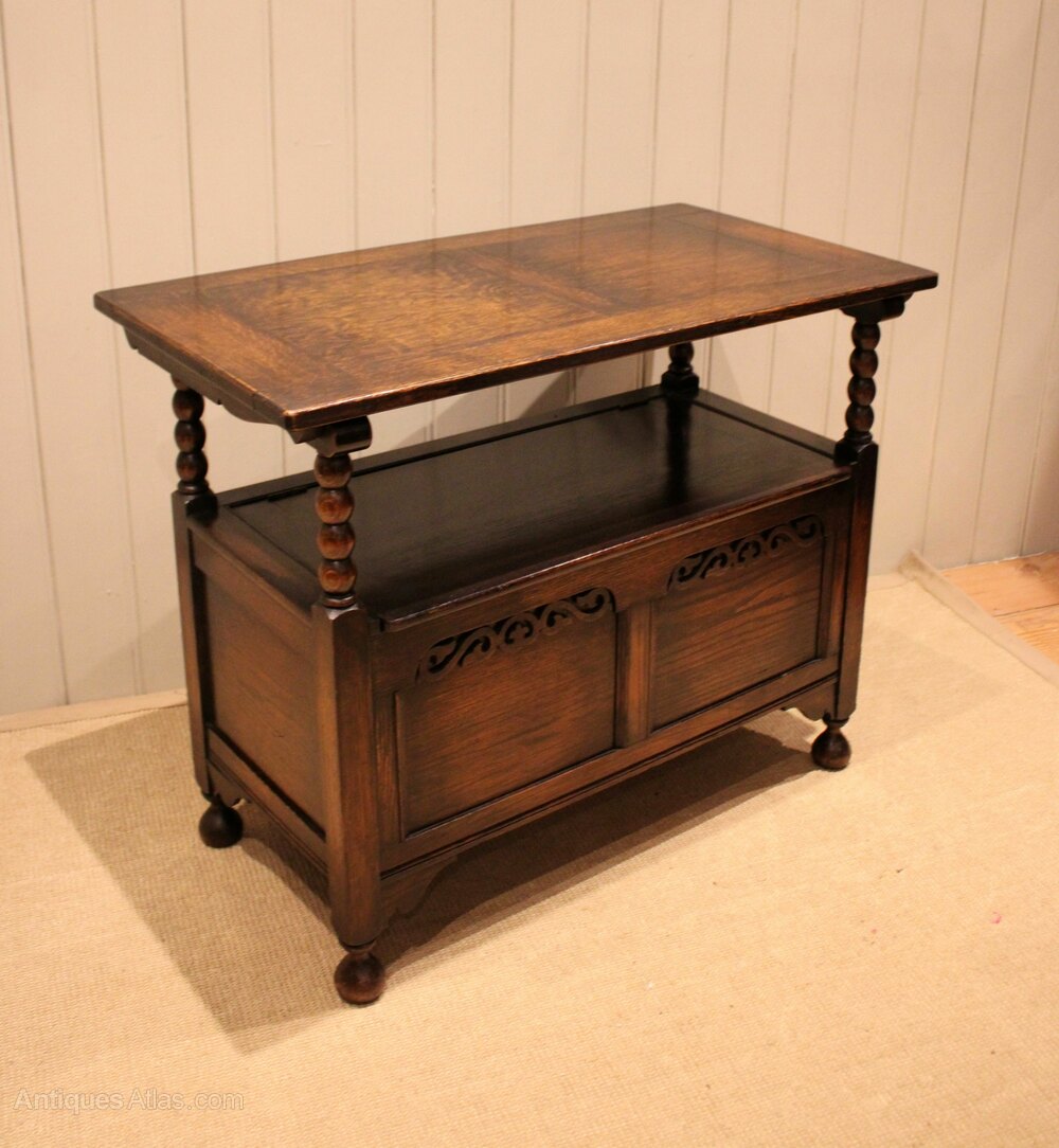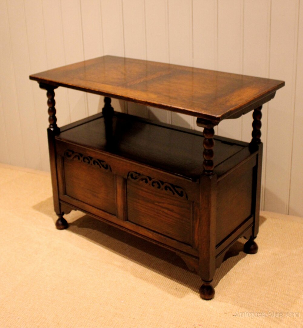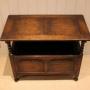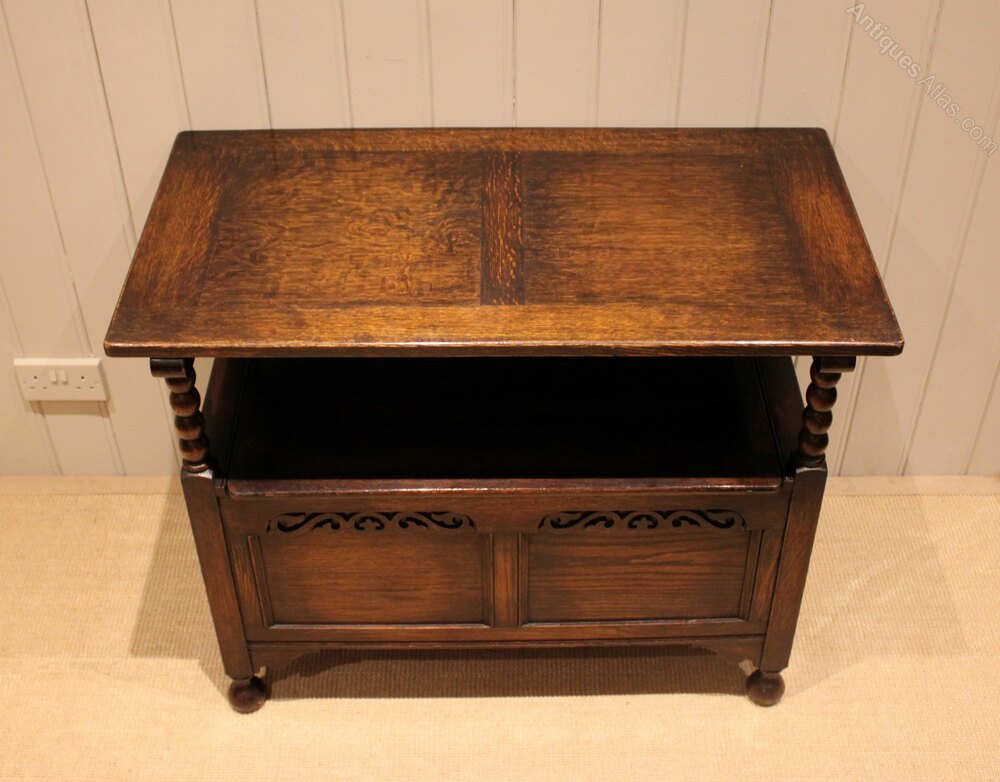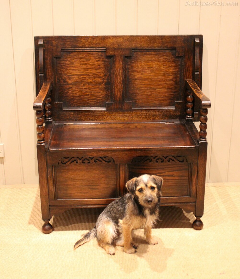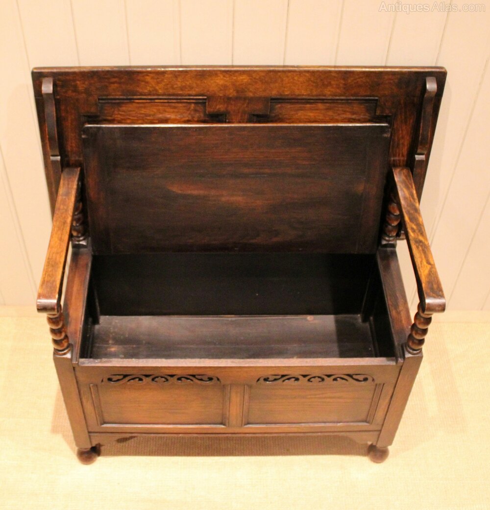 Oak 1920s monks bench having a carved panelled front with a lift up seat and a top section converting into a table with barleytwist supports. When folded as a table it is 71 cm high