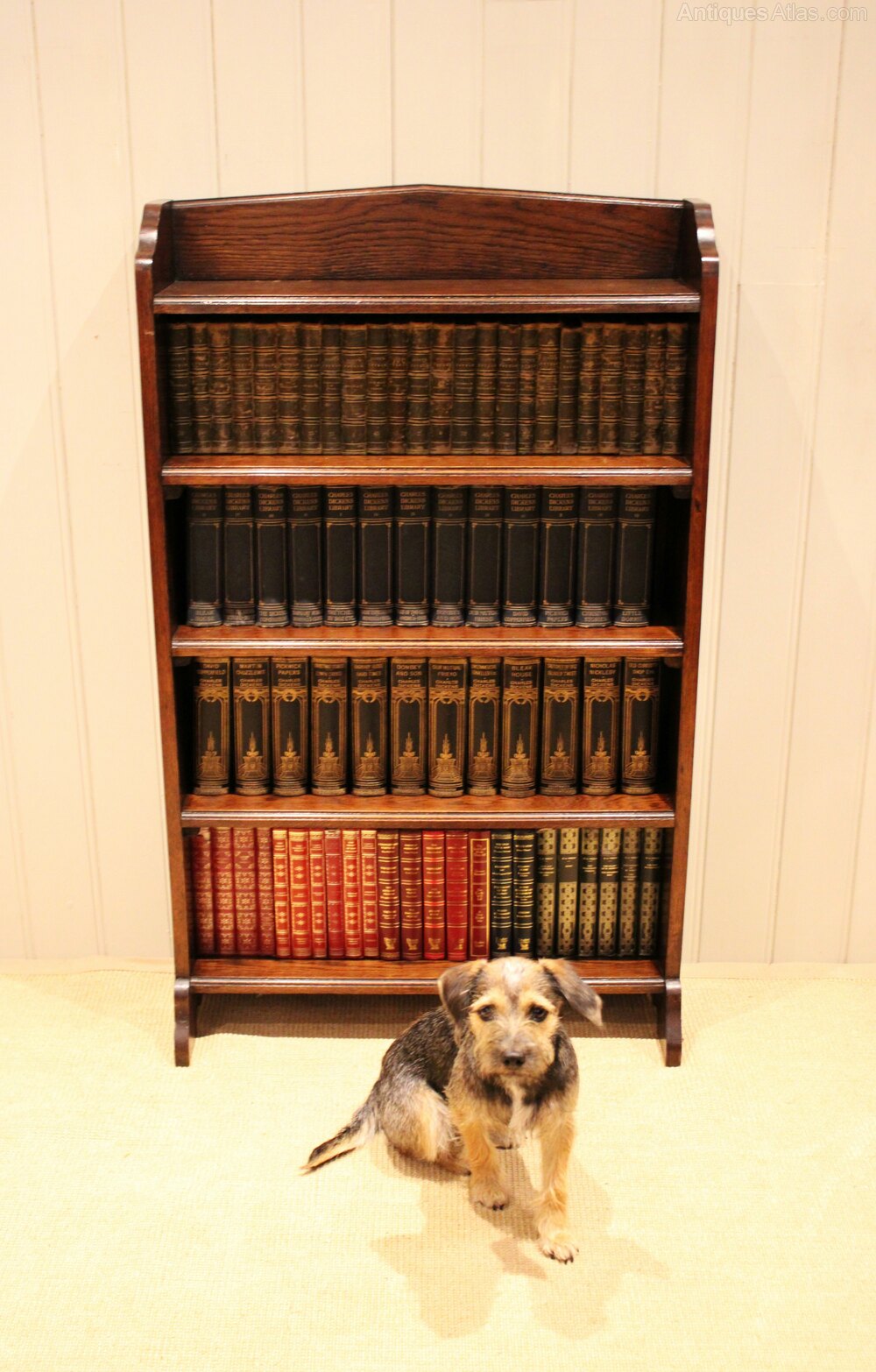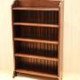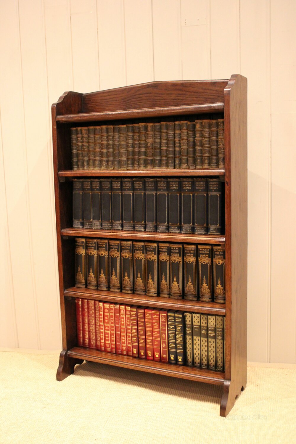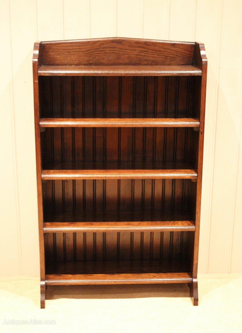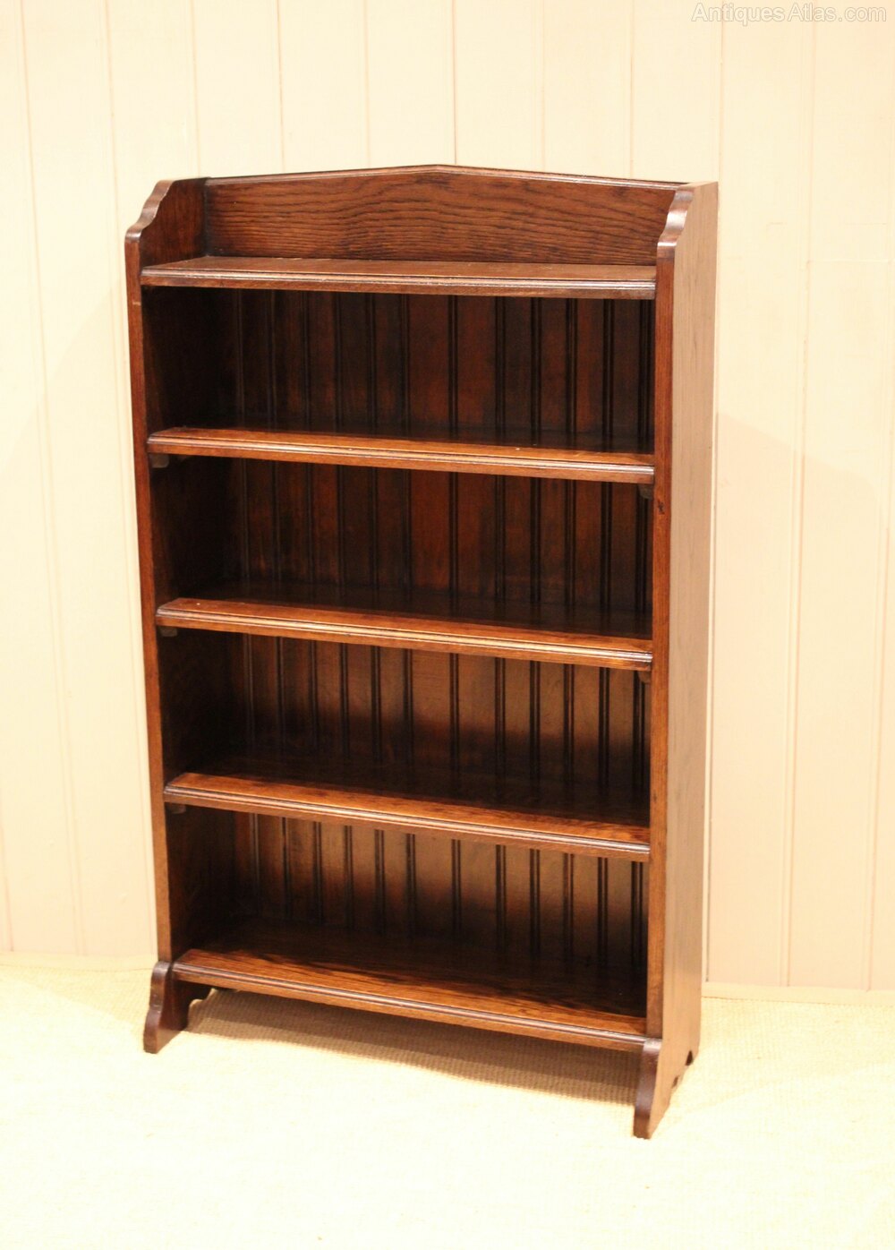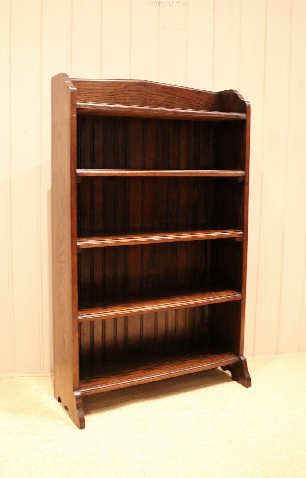Solid oak open bookcase having four fixed shelves with a panelled back , raised on side bracket feet . The shelf dimensions are 66cm wide x 19 cm deep and from the bottom up 23 cm high , 22 cm , 20 cm and at the top 19 cm high .