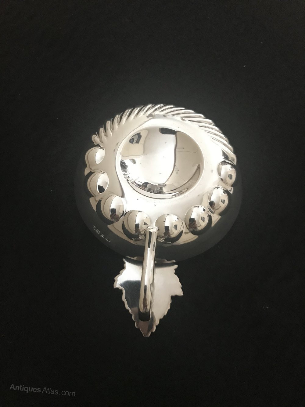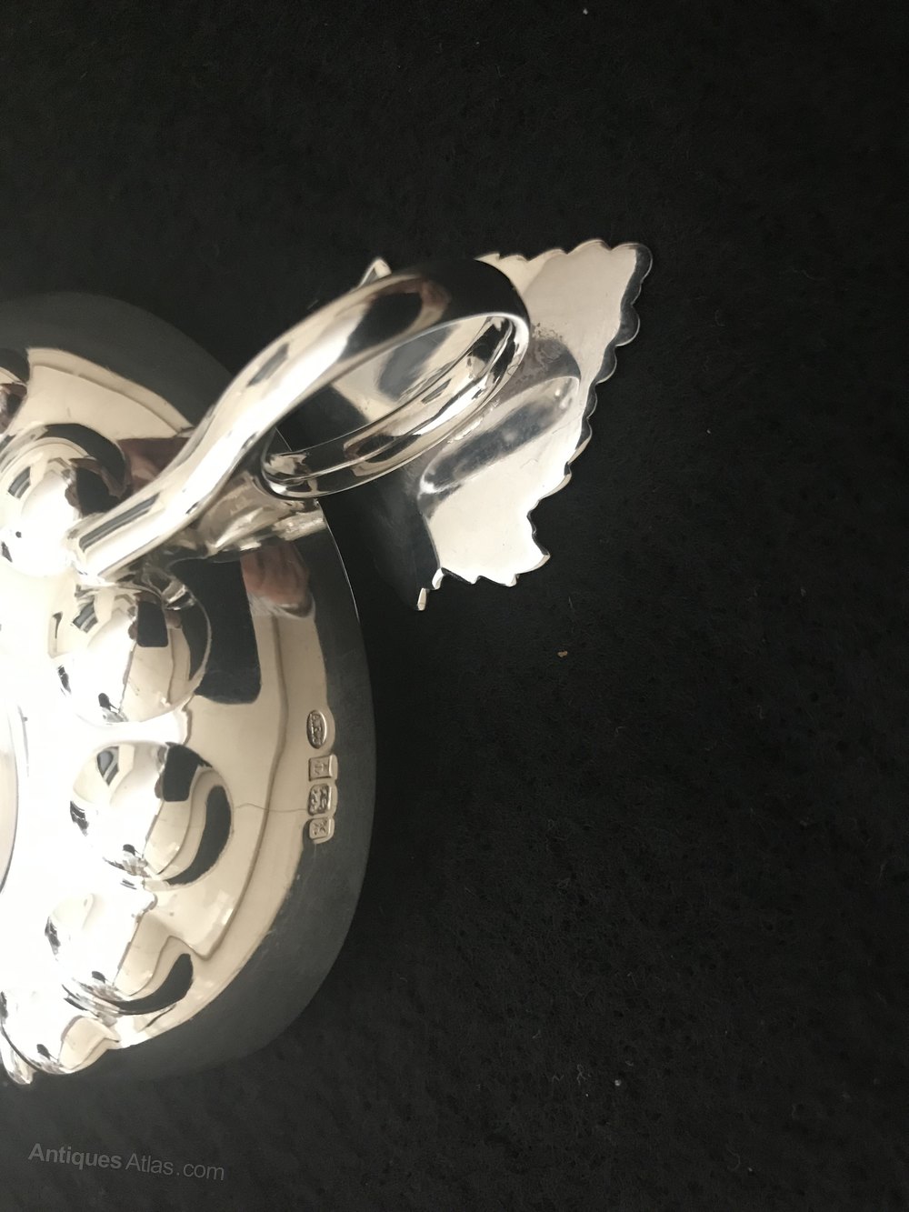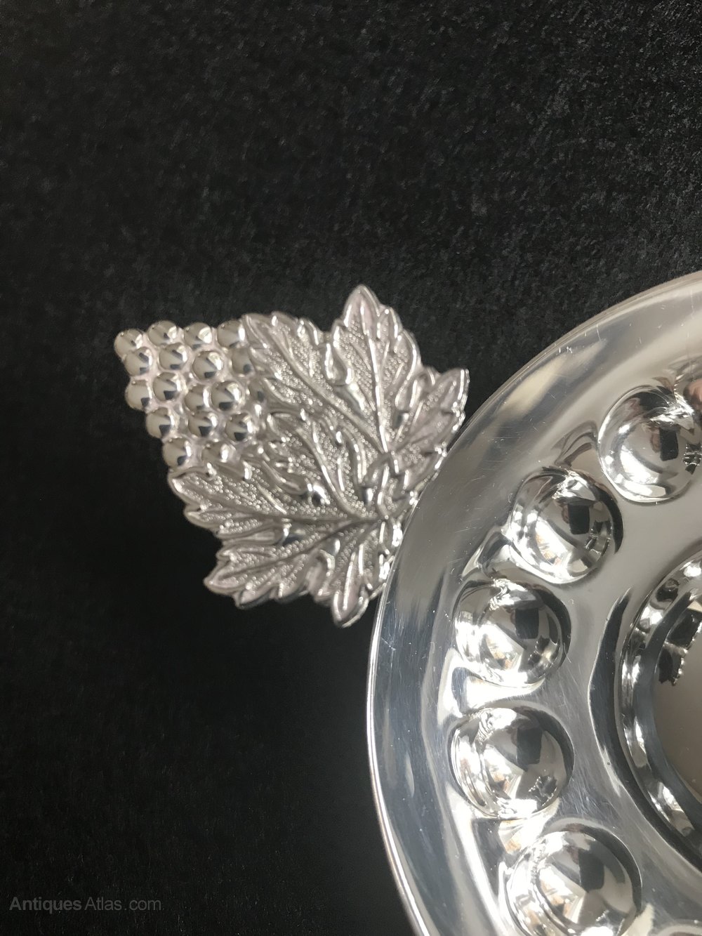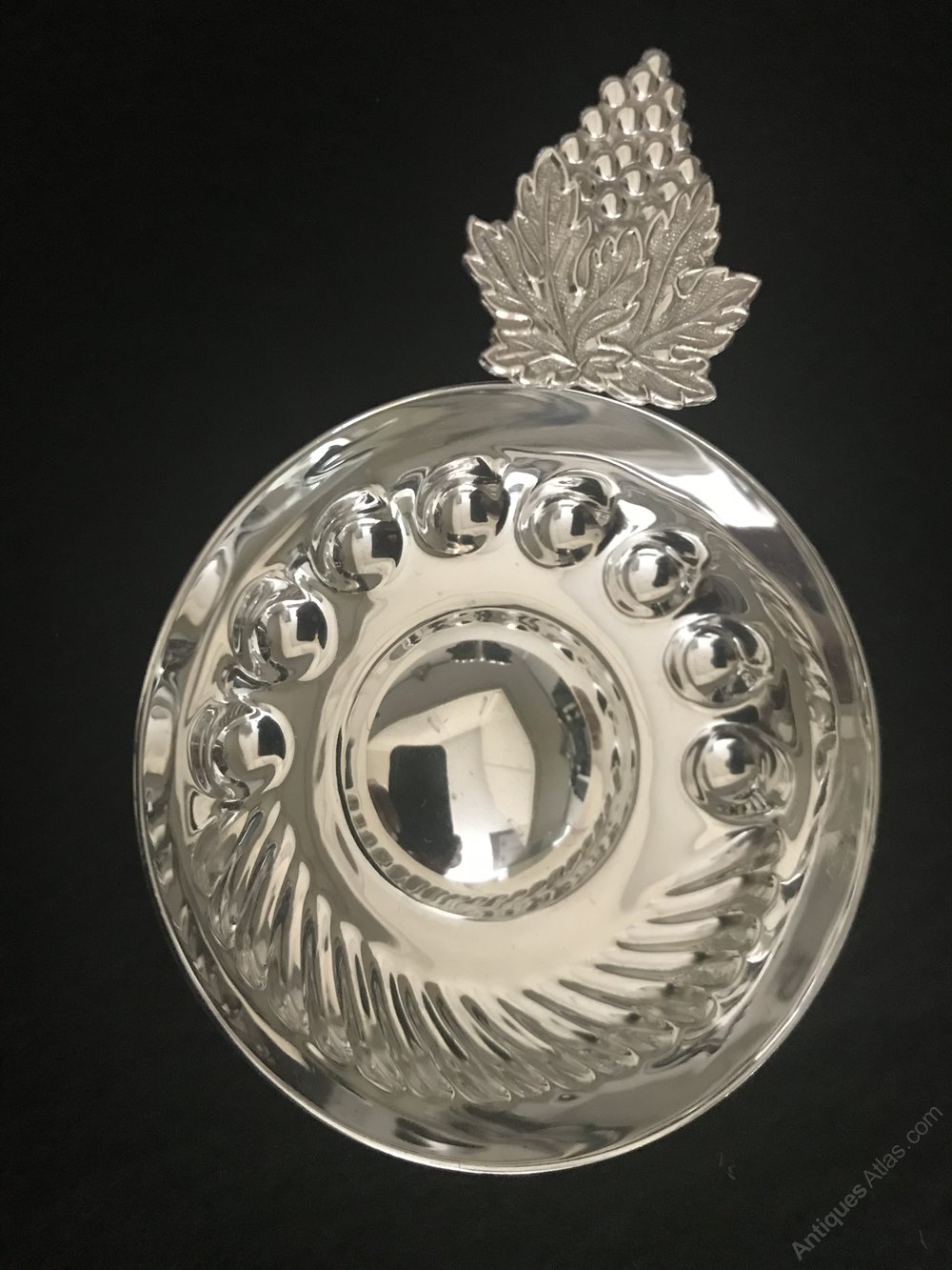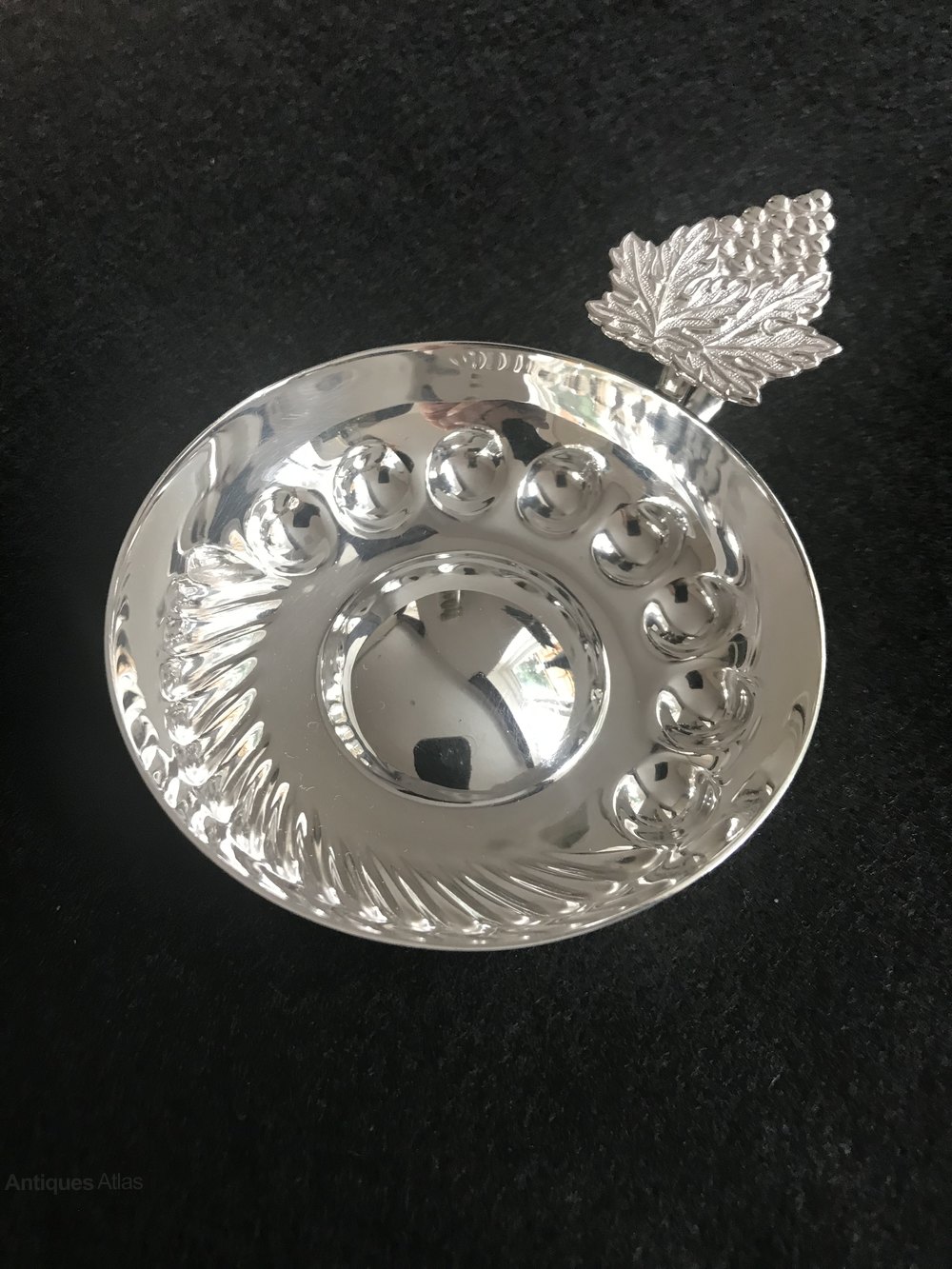 A quality solid silver wine taster designed in a circular form with embossed roundles and reeding. Circular finger ring with vine leaf and grape thumb piece. Fully hallmarked Birmingham 1997. Makers mark AE Jones.