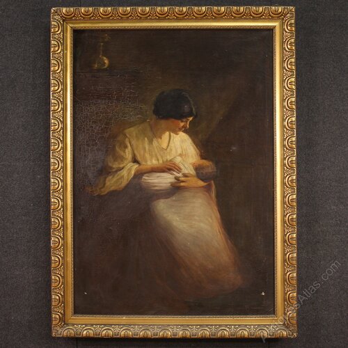 Antique Spanish painting from the early 20th century. Oil on canvas, first canvas, artwork depicting a charming interior scene, "The Lullaby," with good pictorial quality. The tender scene, against a dark background, depicts a seated woman with a swaddled child in her arms. A large, impactful painting, adorned with a finely carved and gilded wood and plaster frame.