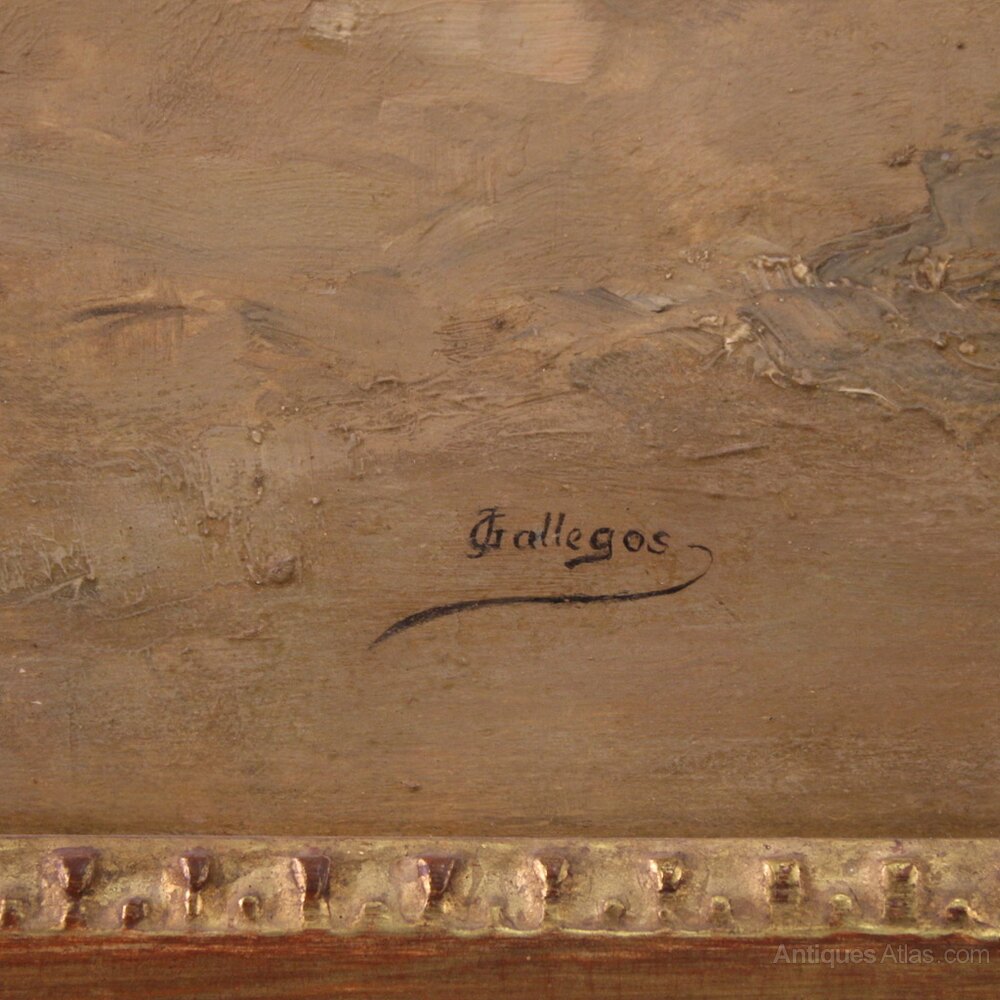 A splendid Spanish painting from the second half of the 19th century. Oil on panel painting, signed Gallegos lower right, attributed to the great Andalusian painter José Gallegos y Arnosa (1857-1917). Known for his folkloric genre scenes and extraordinary attention to detail, his works were successful throughout Europe.