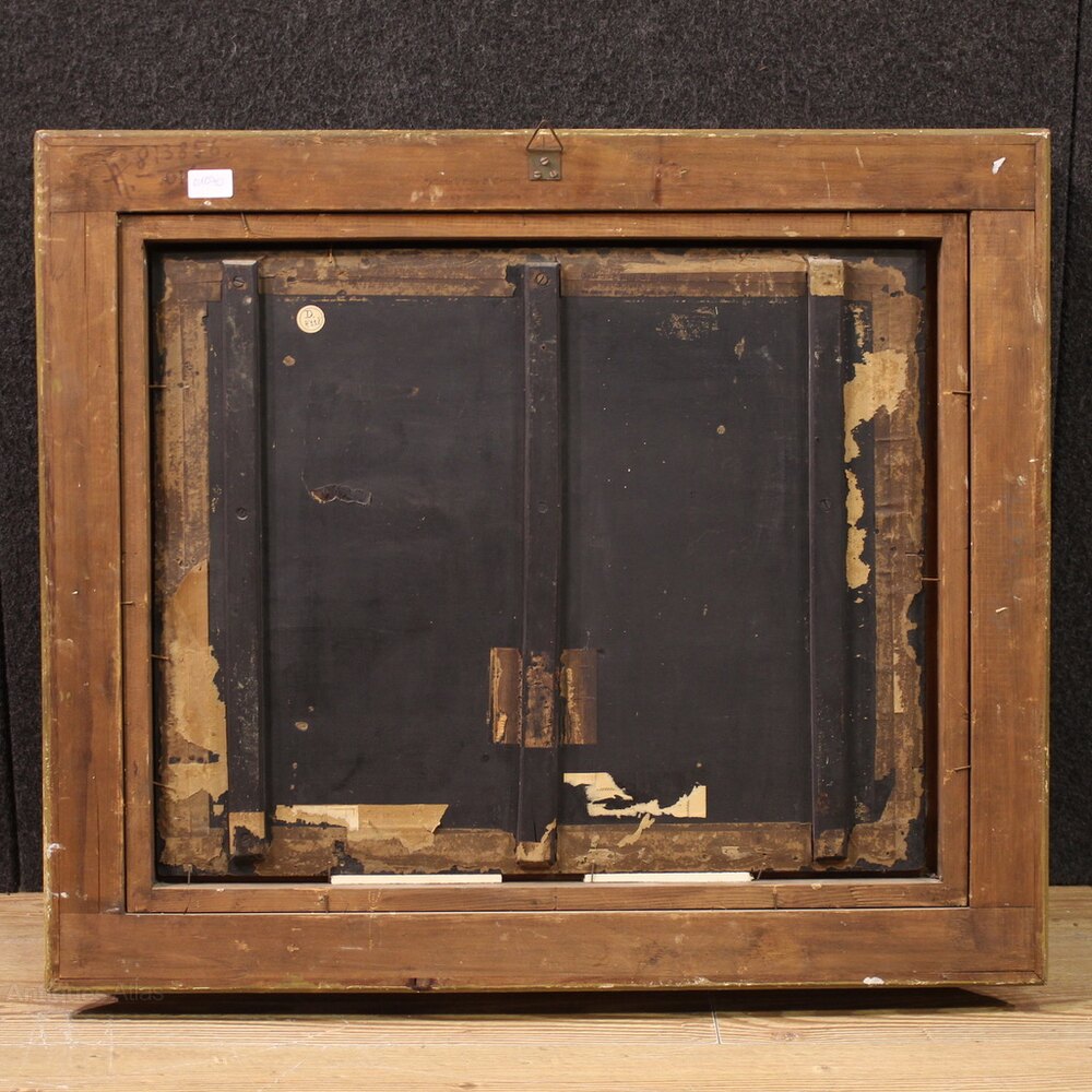 Scenographic contemporary frame in finely carved and gilded wood, also featuring the inscription: José Gallegos, Jerez de las Fronteras 1859, Madrid 1919 (see photo). The painting has already been restored, with small areas of color restoration, but is in overall good condition. Internal dimensions: H 48 x W 60 cm. As each of our products will be accompanied by a certificate of authenticity and warranty and photographic documentation. Every item will be packed in a custom-made wooden box. Free shipping in Europe and UK (import and custom duties NOT included). Worldwide shipping at affordable prices, ask us a shipping quote. BUY IN INSTALLMENTS INTEREST FREE.