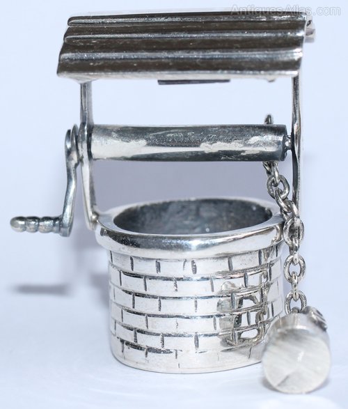 This is a Sterling Silver miniature water well or wishing well nicely detailed with a slatted roof and brick walls. The bucket is attached by a chain and raised or lowered by turning the handle.