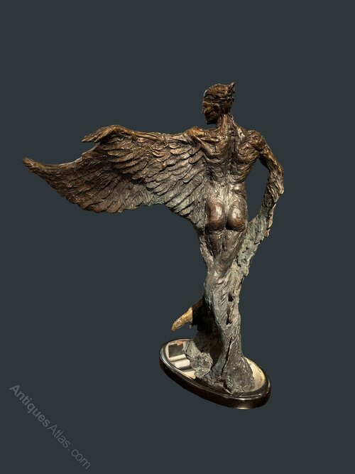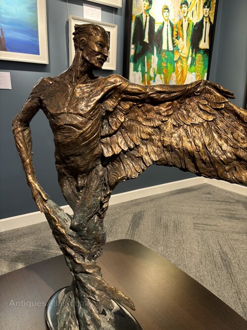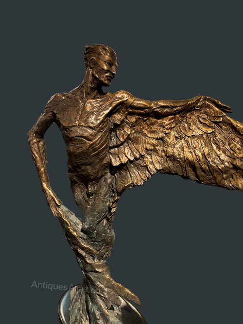 This sculpture as the name suggests is Steve’s interpretation of the ancient Greek myth of Icarus. The flow and composition are aimed at telling the story, the base and main core of the sculpture is tied and formed into the ground creating a solid base for the piece to stand. This represents how Icarus’ father had told him to stay grounded and not fly too close to the sun. As the sculpture progresses up and becomes more expressive, Icarus’ head is turned away from the grounded wing and is looking out to his outstretched wing to show the desire of him wanting to fly and not heed his fathers warning. Any Patina can be available on this sculpture but Steve likes to have a more polished and lighter colour on the outstretched wing to depict the suns light.