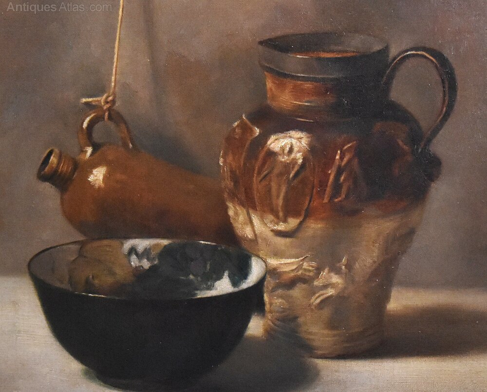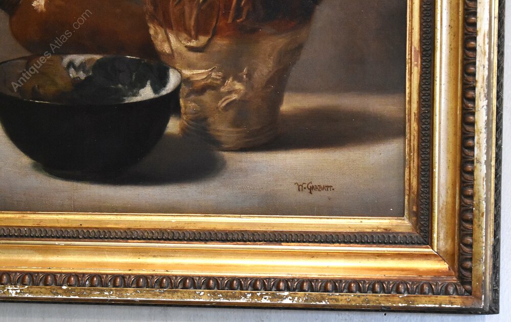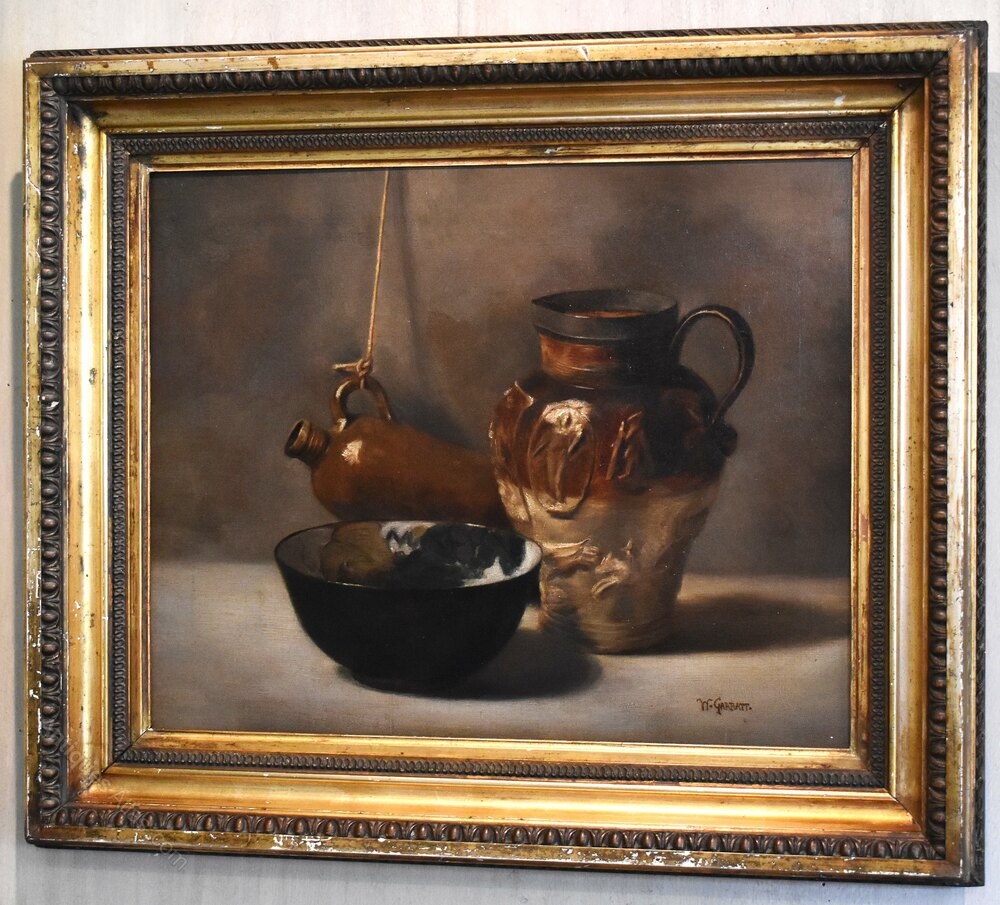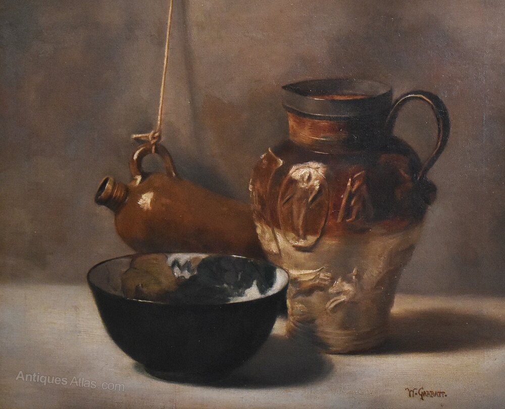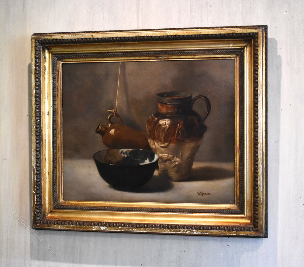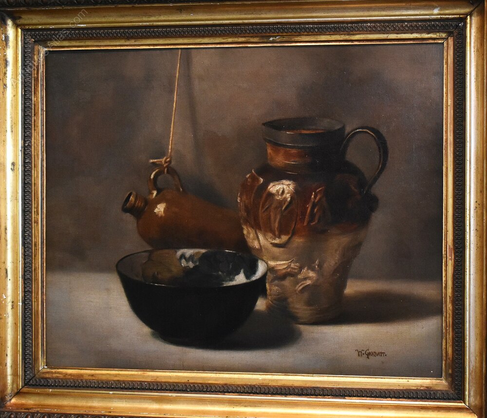 An interesting and decorative oil on canvas still life of ceramics. The work shows an assemblage of stoneware with a hanging flagon, a jug with applied decoration and an art pottery bowl. The painting is beautifully handled in great detail and is an exploration of shadow, tone and texture. The work is signed ‘W.Garratt’ who is not recorded and I think it is most likely this is an art school piece. The painting is in good condition, it has been professionally lined with minor touching in. The gilt frame is likely the original, works very well with the piece and has a worn antique finish. The whole is a great decorative work that is ready to hang. C.1900.