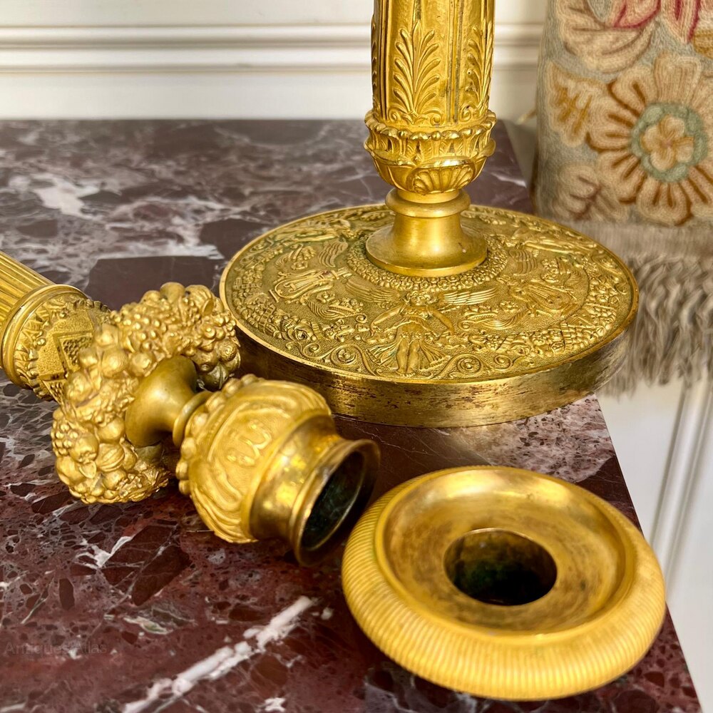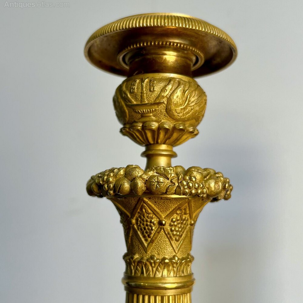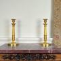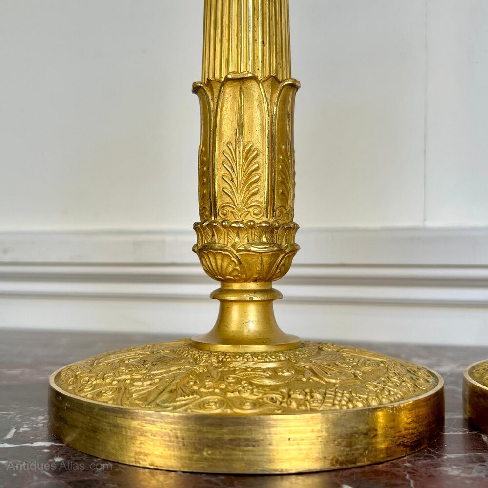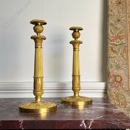 A striking pair of 19th century ormolu and brass candlesticks. Having fluted stems with acanthus leaf decoration and circular bases. Beautiful quality and original condition throughout. French, Circa 1880.
