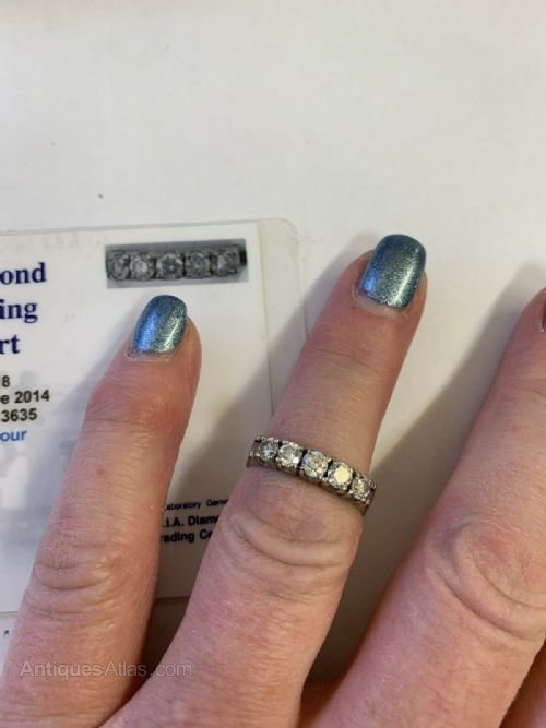 This is a super quality 5 stone diamond ring, Set with 5 beautiful sparkly clean diamonds all in 18ct white gold. The ring is in very good condition, weighs a healthy 5.63g and is UK size P. It is marked for 18ct gold and DI 0.92 to indicate the diamond content. This is confirmed by the photo of the grading certificate which also confirms the excellent diamond quality of Clarity VS2 and colour H.