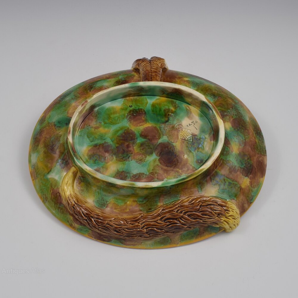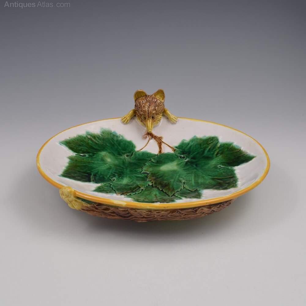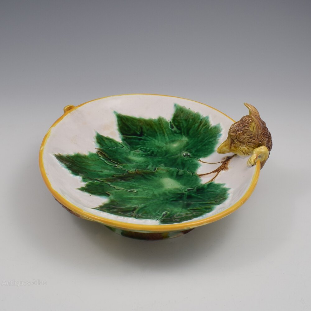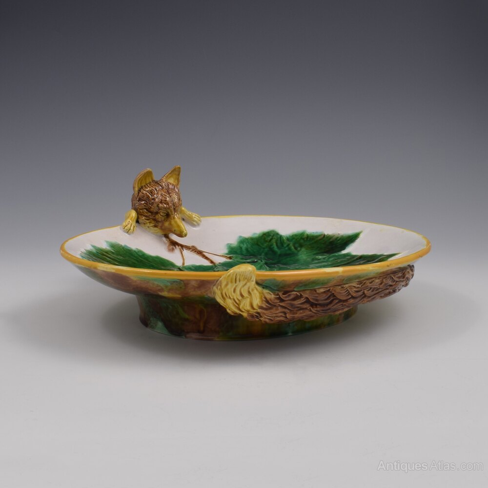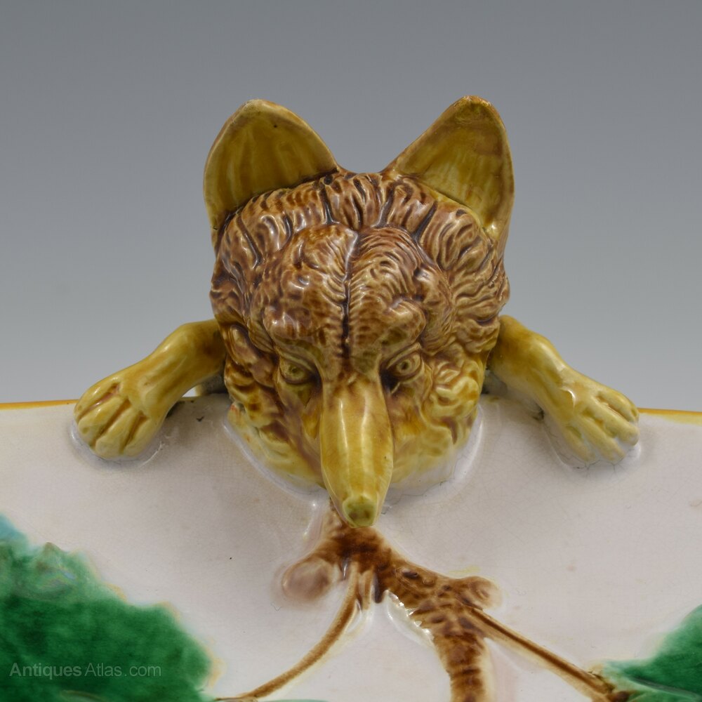 A superb and rare George Jones heavy majolica dished tray featuring a fabulous fox creeping out of the foot rim and over the edge and with his tail wrapped around the foot of the dish and curling up over the rim on the other side. The centre has moulded overlapping vine leaves. The tray surface is enamelled with a pale pink ground and finished with an ochre rim. Lovely, very finely modelled detail to the fox facial features, paws and texture of the fur. A striking, fun piece, deserving of a prime display position as well as being enjoyed in use and entertainment.