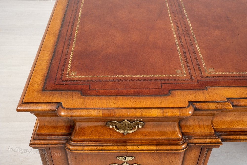 The Top of the desk Having a Tobacco Brown Leather Writing Surface with hand applied Gilt and Blind Tooling.